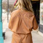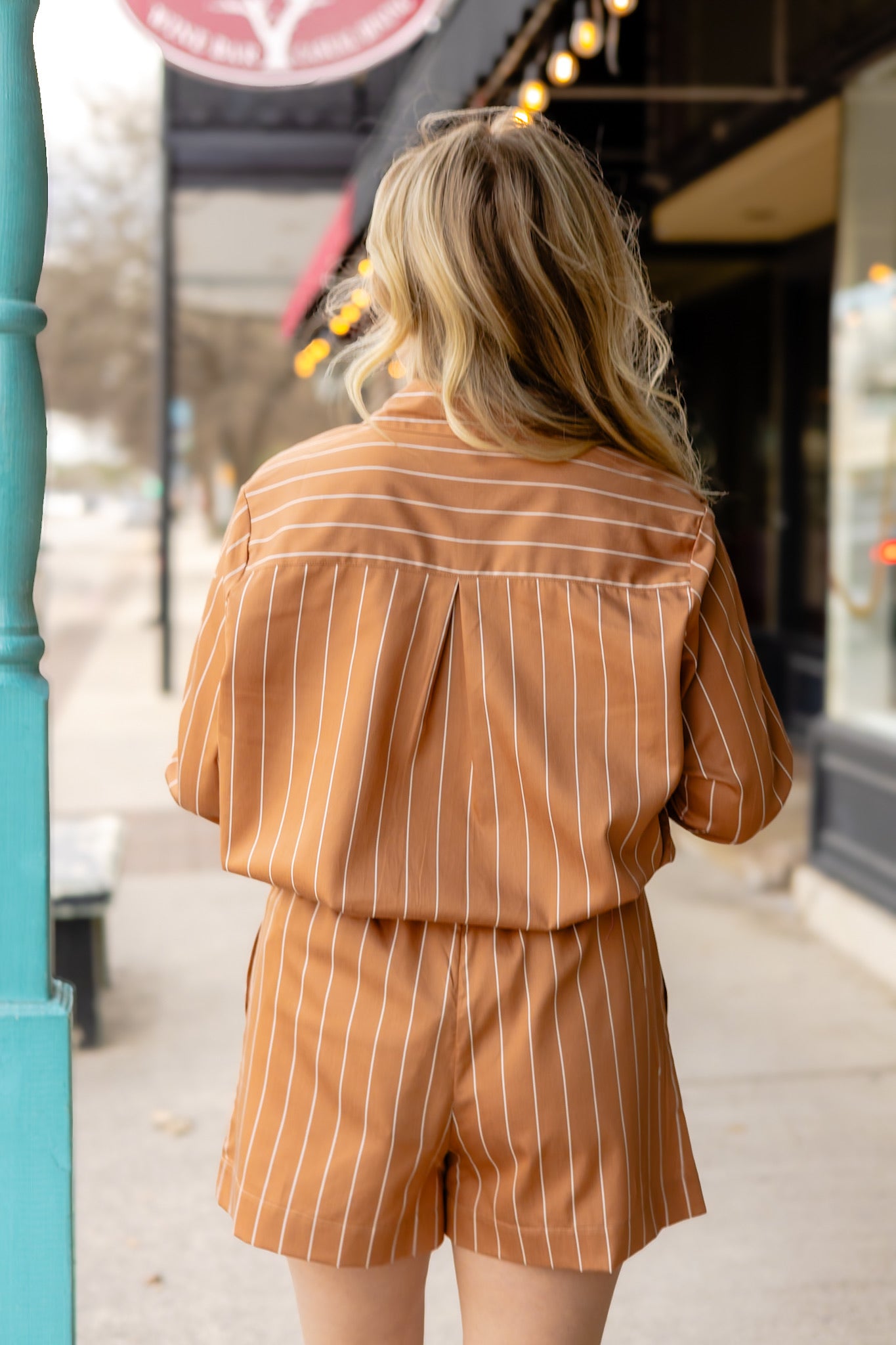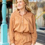 Effortless style meets comfort in this lightweight caramel and ivory stripe long sleeve button down top by French Connection. Perfect for layering or wearing solo, the relaxed fit and breathable fabric make it ideal for any season. The classic stripe pattern pairs beautifully with our matching shorts, sold separately, for a coordinated look. Versatile enough for casual days or dressed up for weekend outings.