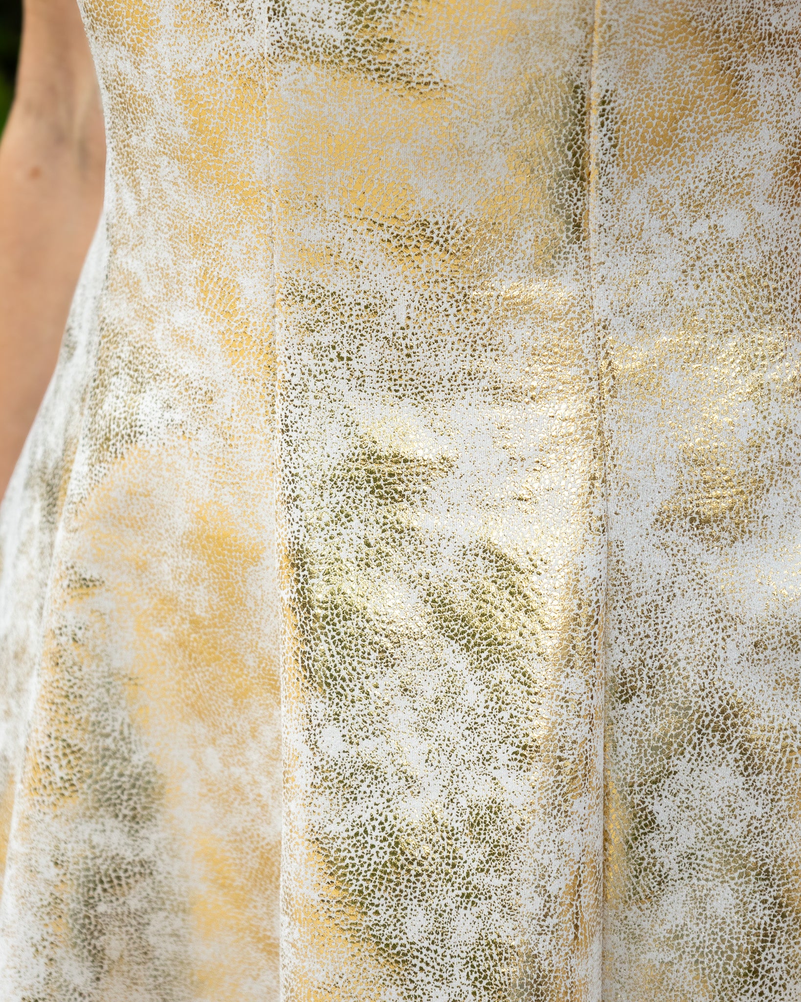 Shine bright in the Alice Dress, a playful metallic gold mini with a flattering deep V-neck and short sleeves. The ponte fabric offers a comfortable stretch, while the full skirt adds twirling fun to every step.