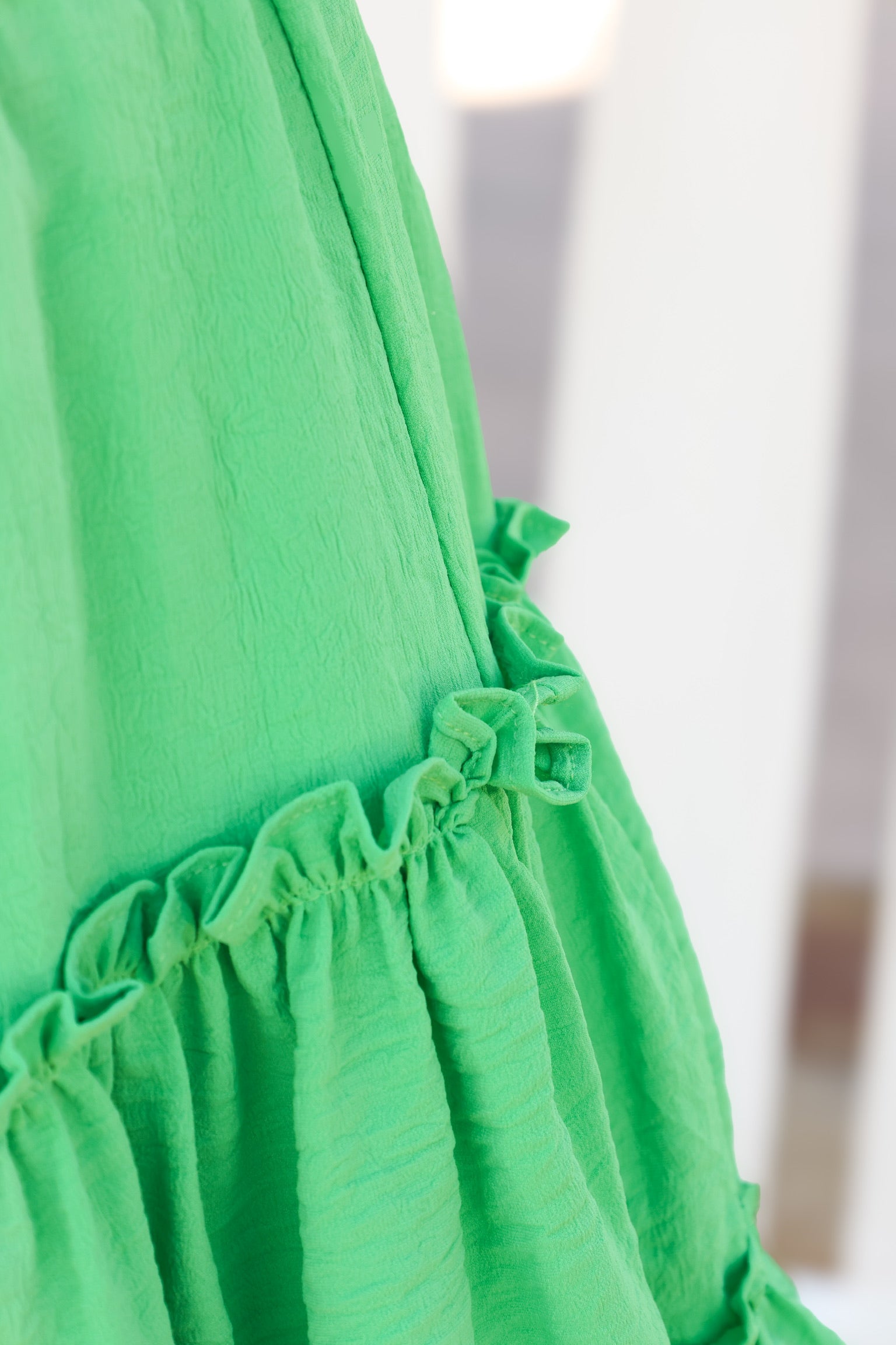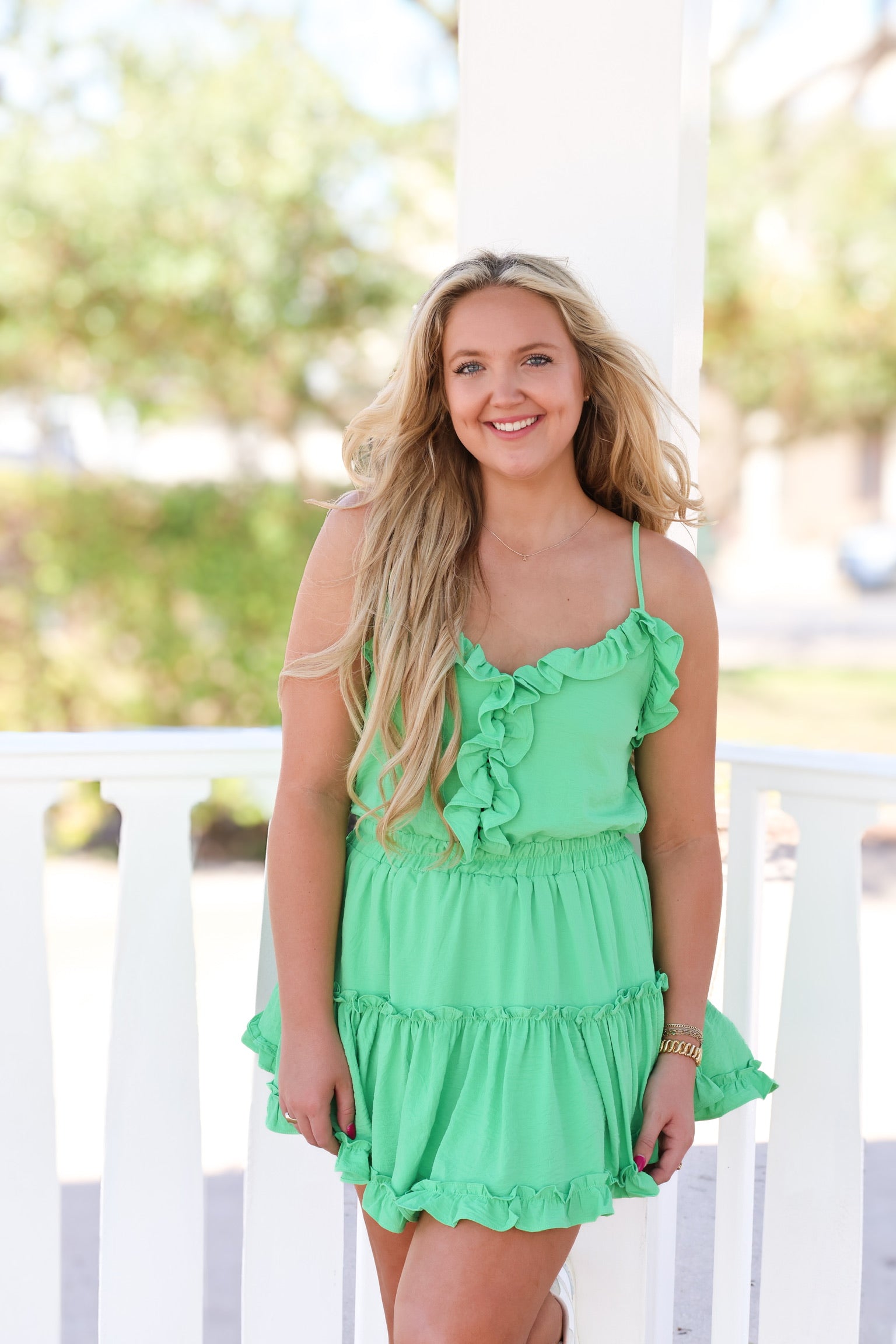 Add a pop of color with our Apple Green Mini! This playful dress features ruffles for a flirty touch. Perfect for a sunny day out (or just for brightening up your wardrobe).