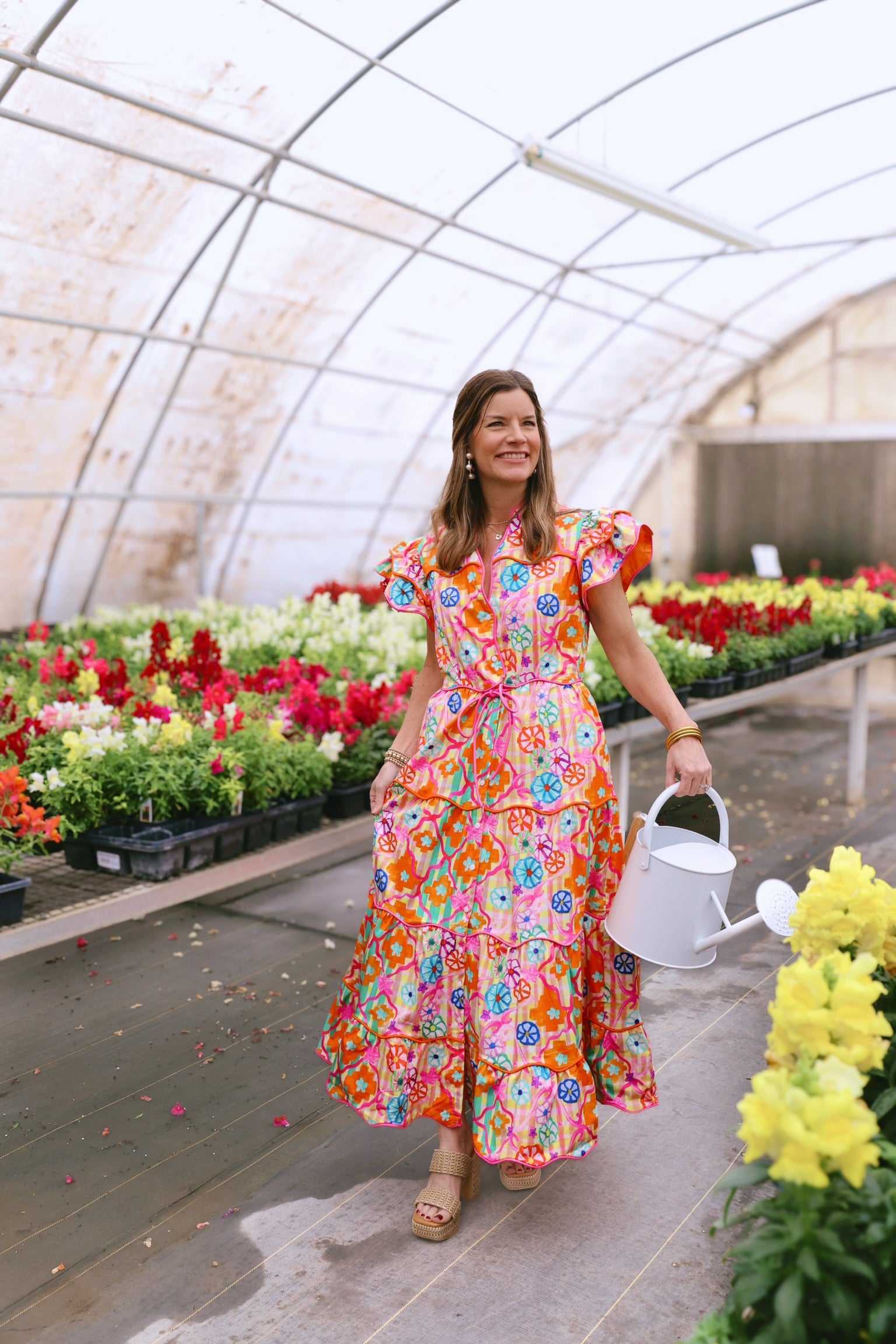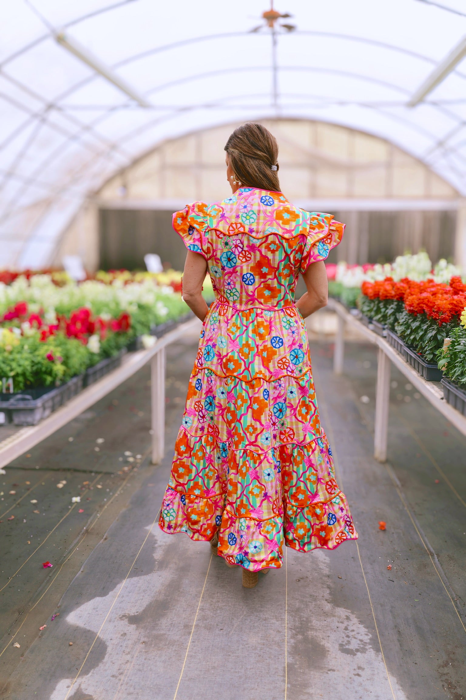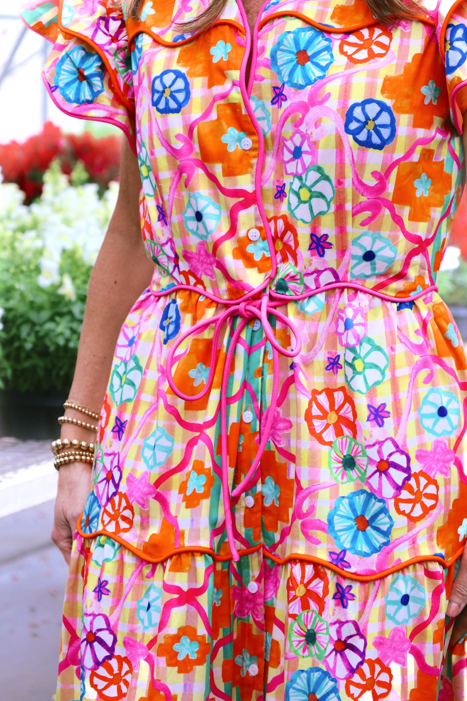 Bring a burst of color to your wardrobe with this vibrant maxi dress, adorned with eye-catching floral prints and playful ruffled sleeves. The front button closure and adjustable waist tie offer a customizable fit, while convenient pockets add practicality. Perfect for your daily brunch!