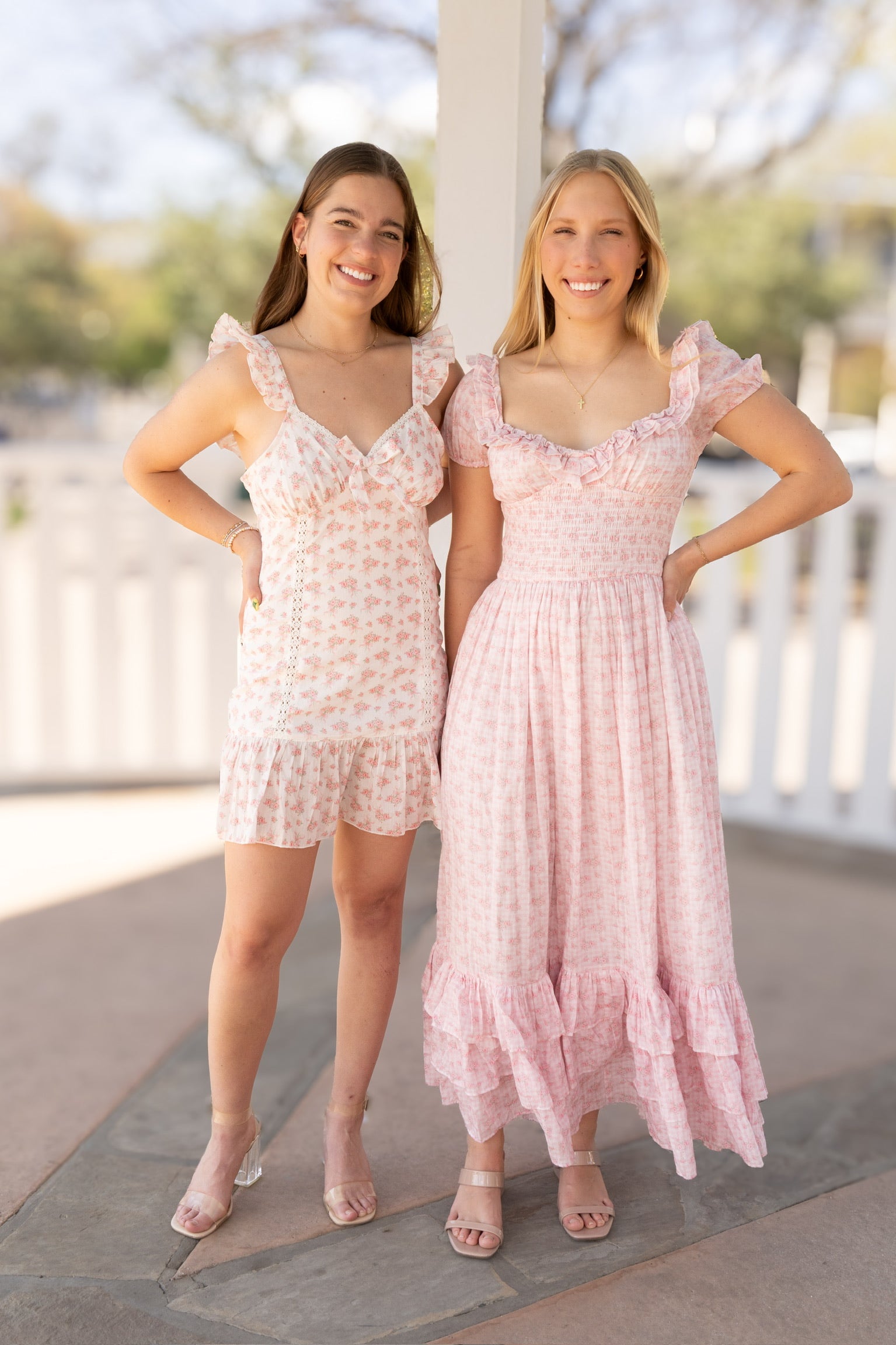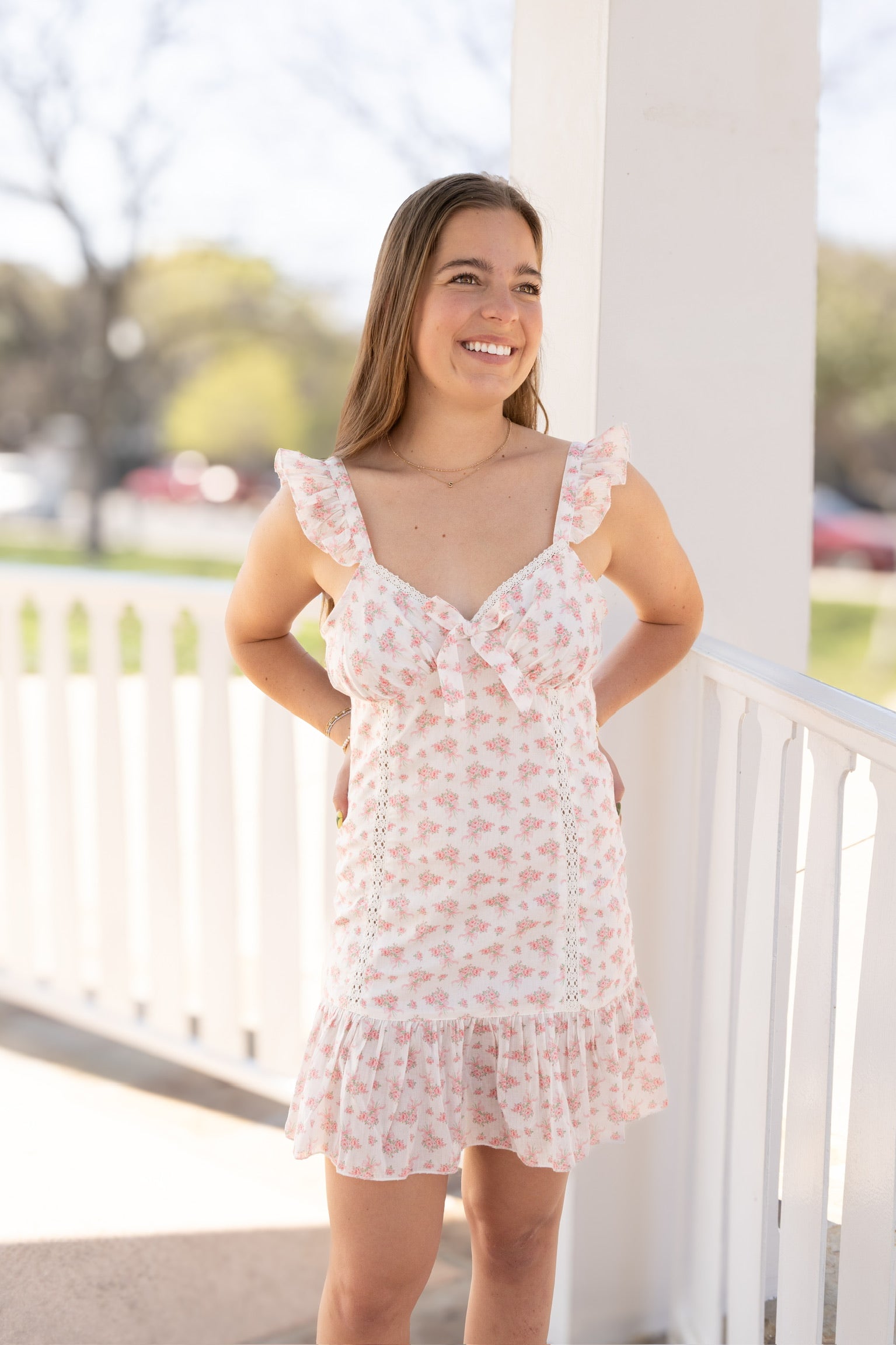 Step into Spring with this enchanting mini dress. Featuring delicate ruffle straps and a flirty ruffle hem, making it the perfect blend of feminine and romantic. Decorated with Intricate lace accents add a touch of elegance, while a charming bow detail complete the look with a sweet, girly flair
