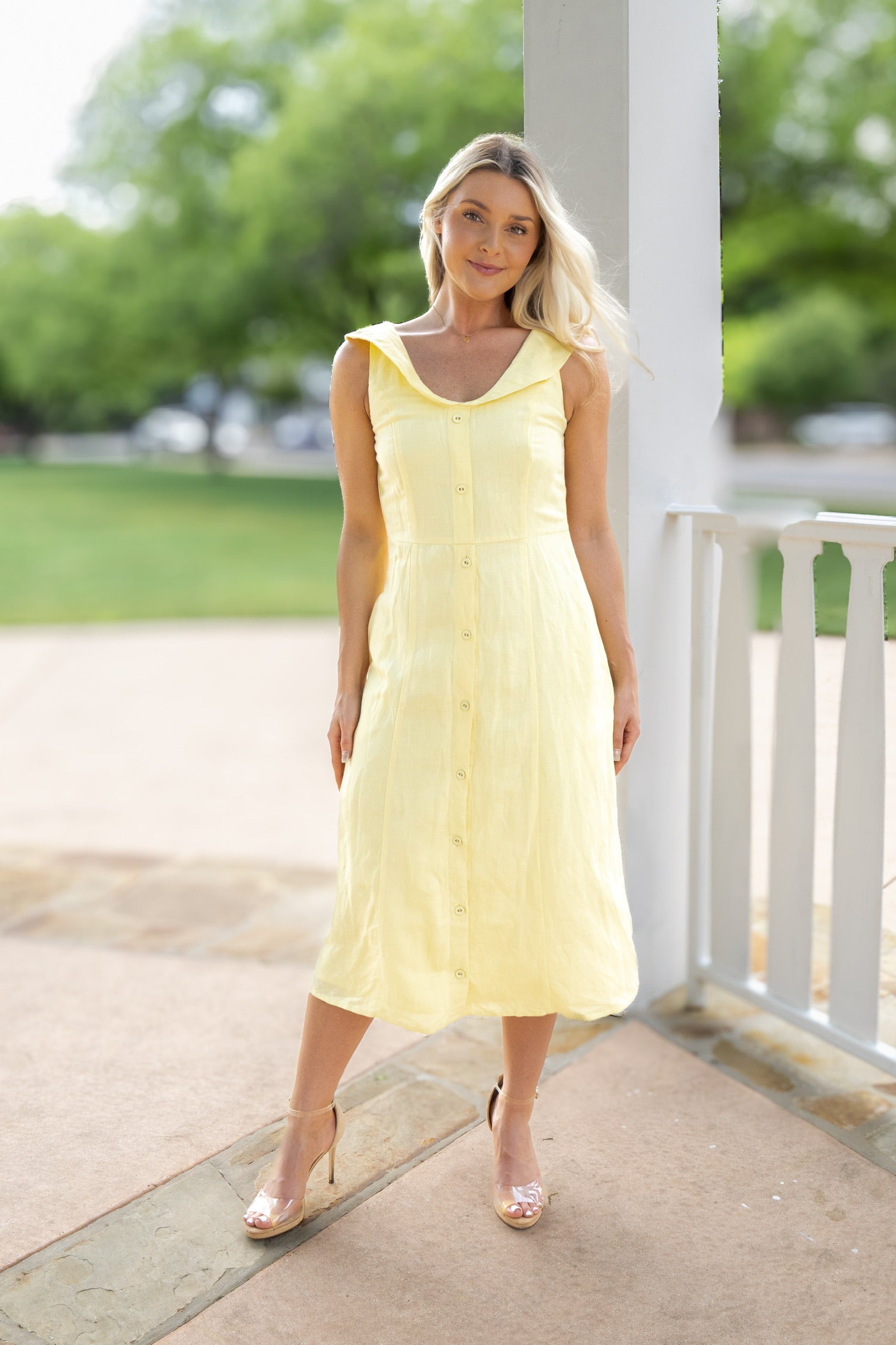 Be the buzz of the town in this Birdie Linen Butter Midi Dress. With its playful birdie design and buttery yellow color, this sleeveless dress is perfect for any sunny day. Slip into this quirky and fun piece and let your style take flight!