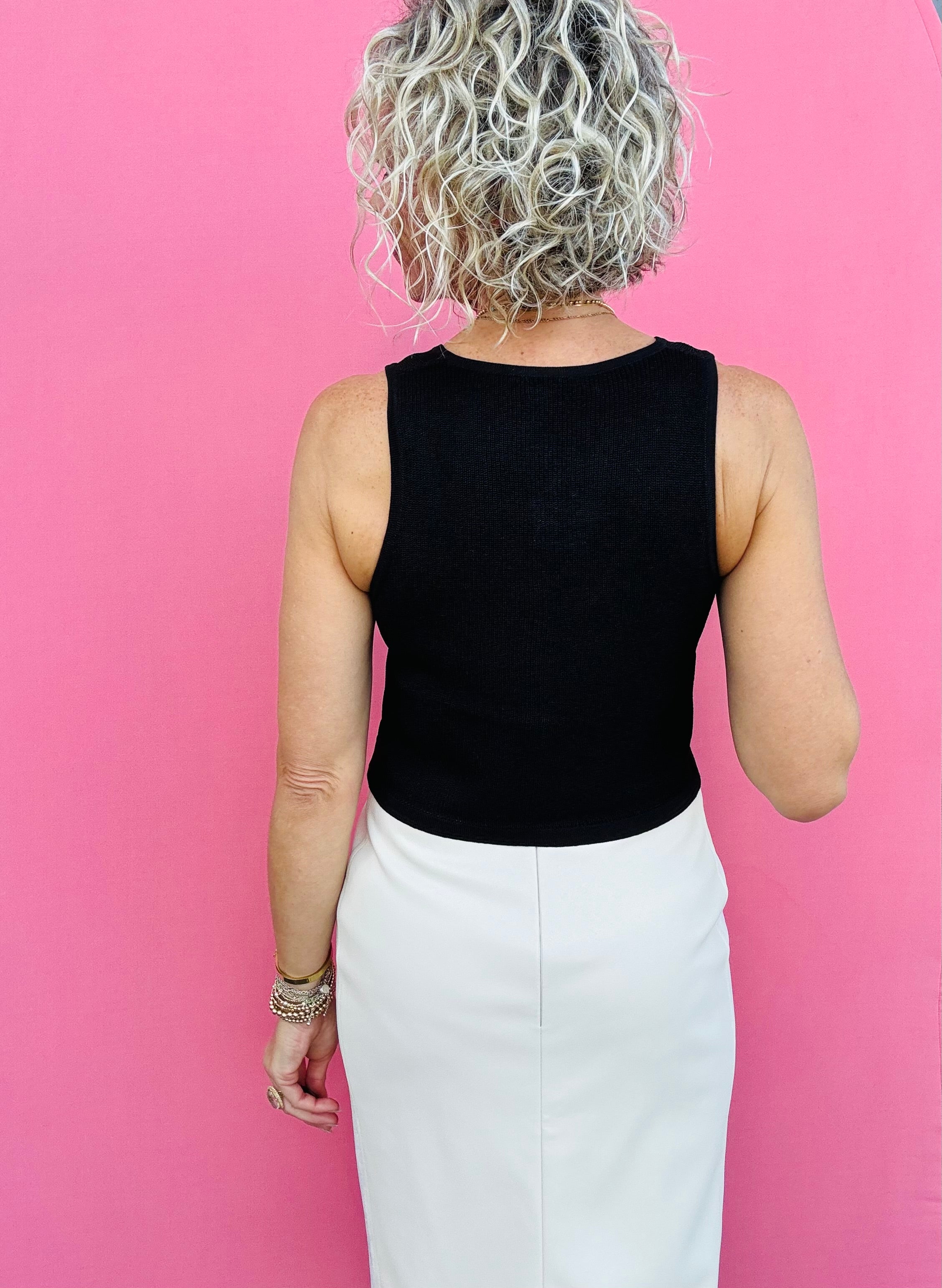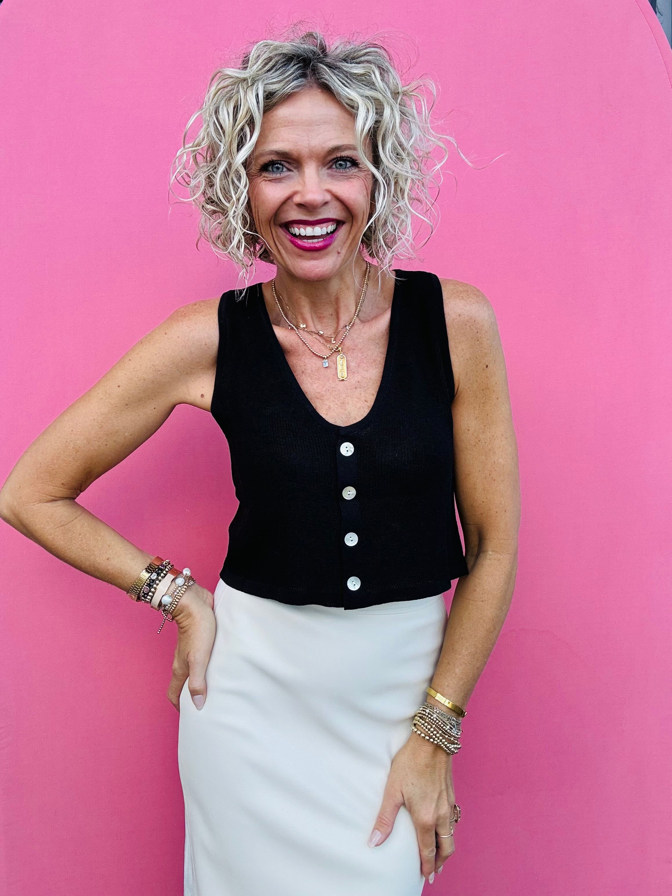 Button up your style with our Black Knitted Vest! Made with a playful front button design, this vest adds a touch of quirkiness to any outfit. Perfect for those who don't take themselves too seriously.