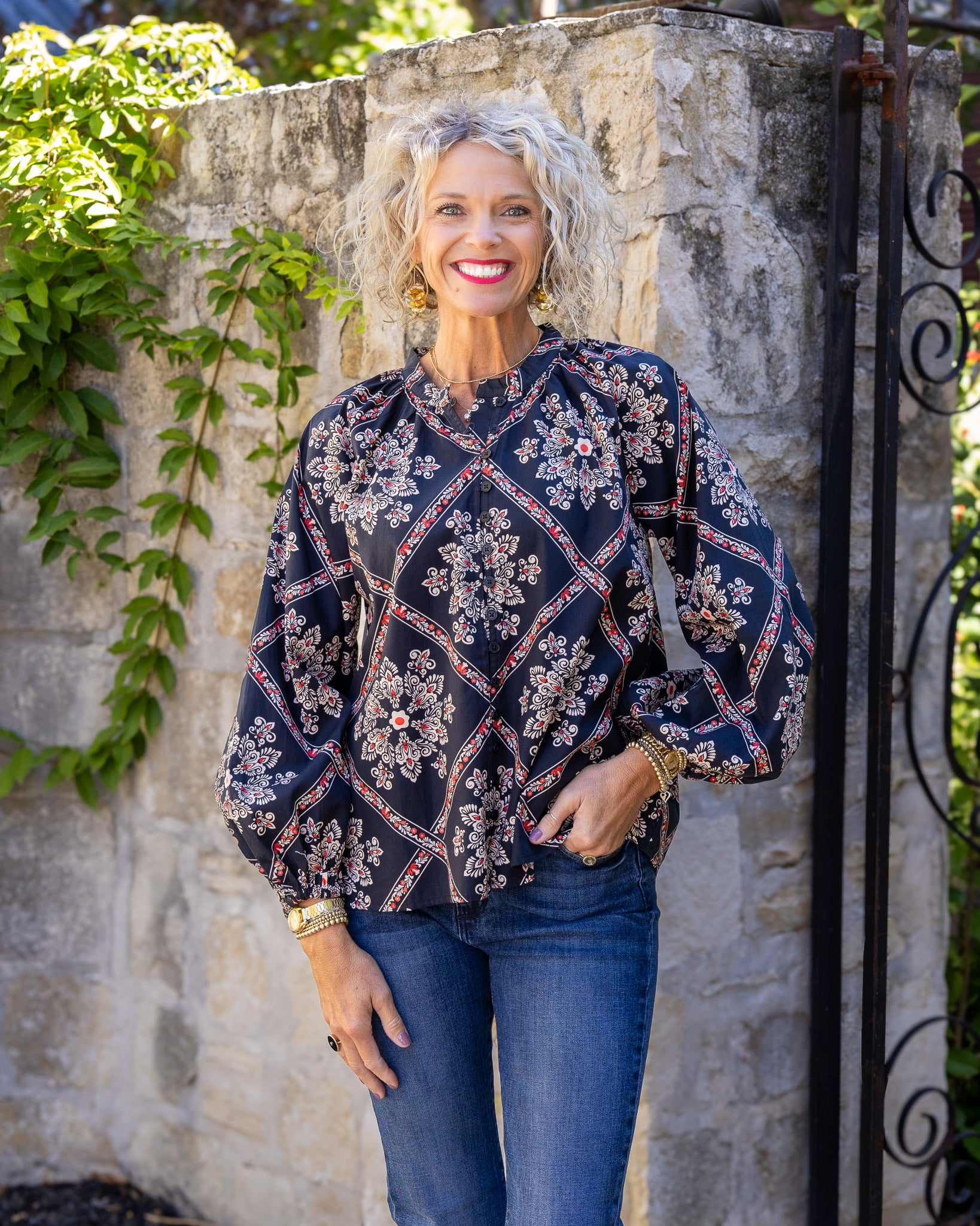Add a dash of charm to your wardrobe with the Black Medallion Long Sleeve Top. Crafted from soft cotton, its playful medallion pattern and balloon sleeve button-down style make it perfect for days when you want to stand out with ease. Whether you’re headed out or staying in, this top brings comfort and a touch of whimsy to every moment.