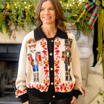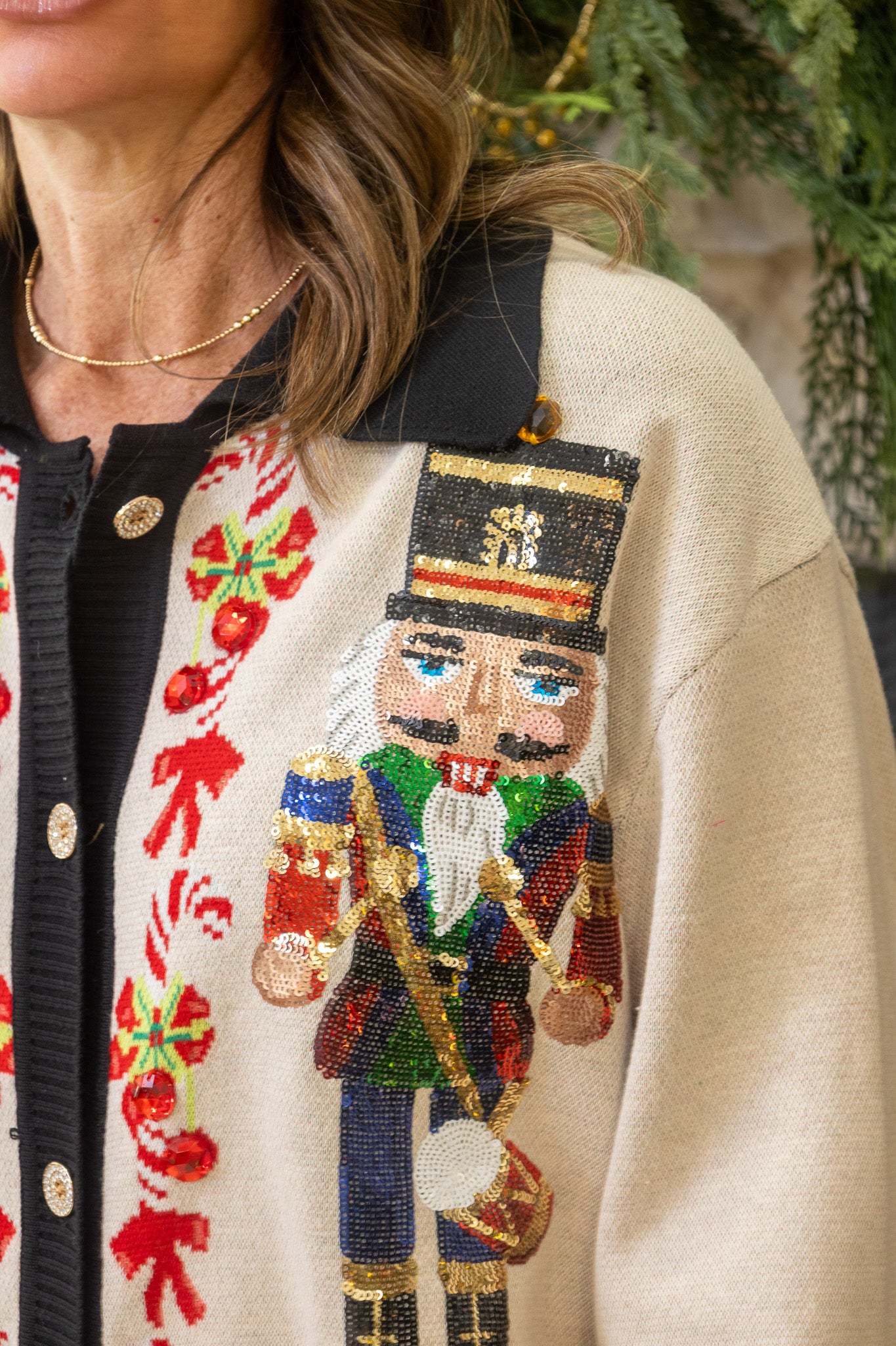 Add festive charm to your wardrobe with this playful collared cardigan featuring whimsical nutcracker and candy cane designs. Its true-to-size fit makes it easy to layer over your favorite holiday outfits, bringing cozy comfort and cheer wherever you go. Perfect for spreading joyful vibes this season!