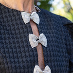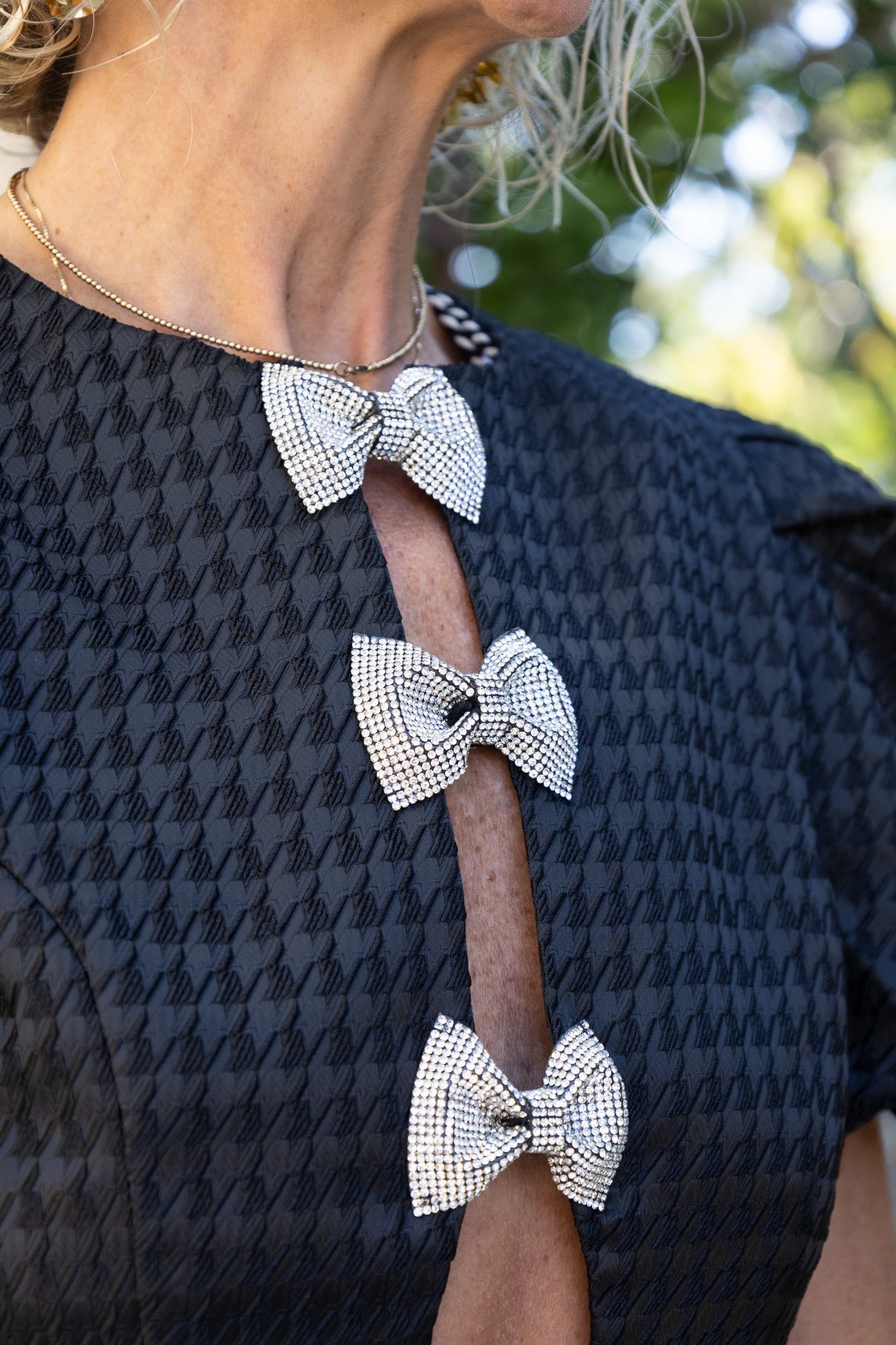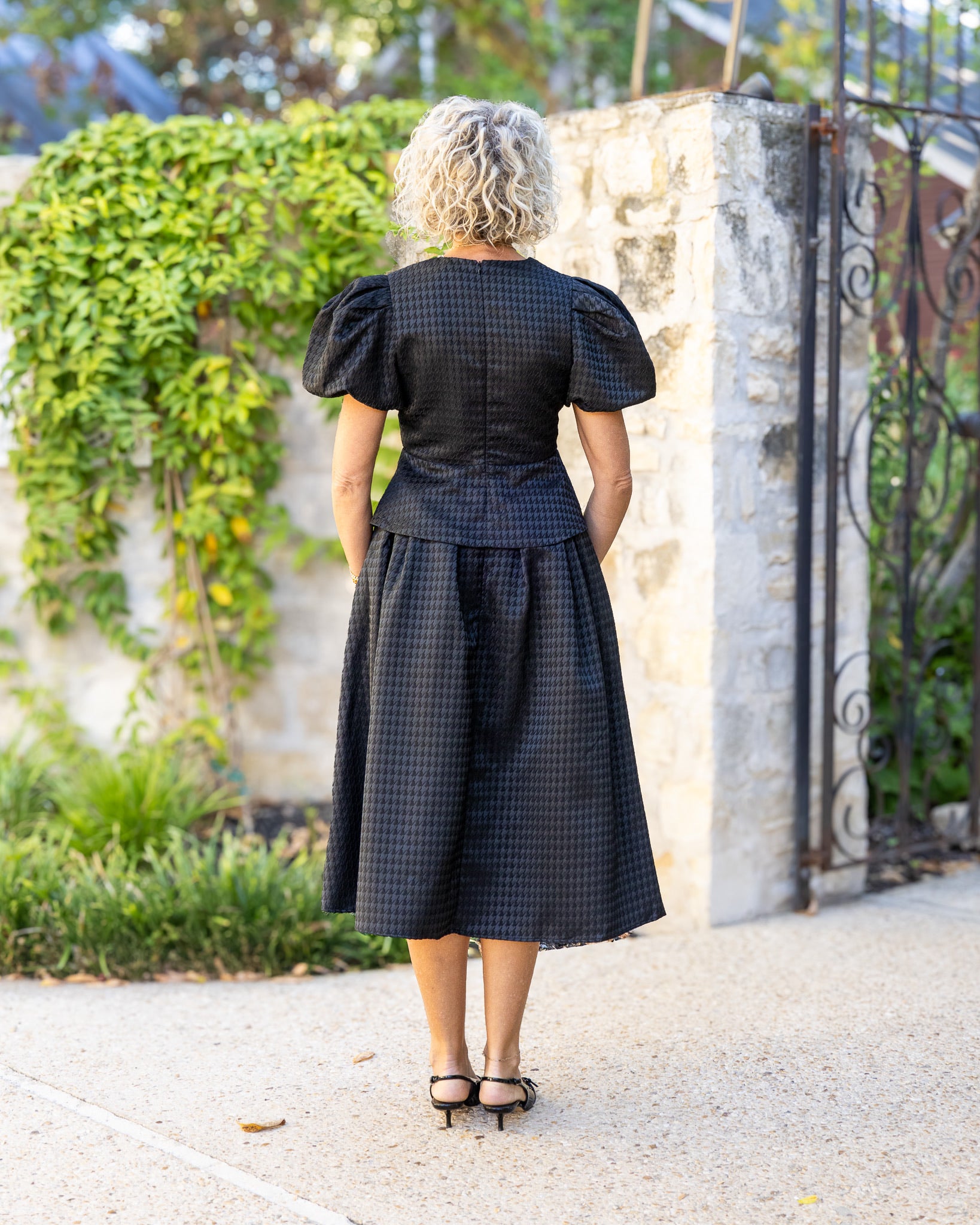 BOWIE TOP Step out in style with this elegant Black and gray houndstooth top, designed to make a chic statement. Featuring short princess puff sleeves that add a touch of sophistication, this top is accented with stylish bow details for a feminine flair. The flattering peplum hem enhances your silhouette, creating a timeless and polished look. Perfect for casual outings or special occasions, this top effortlessly combines classic patterns with modern, fashion-forward details