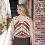 Cozy up in this charming brown and ivory chevron knit sweater that brings effortless style to your everyday wardrobe. The classic geometric pattern adds visual interest while the soft knit fabric keeps you warm and comfortable all season long. Perfect for layering over basics or wearing solo, this versatile piece transitions seamlessly from casual coffee runs to relaxed weekend hangouts. A timeless staple that works with everything in your closet.