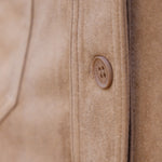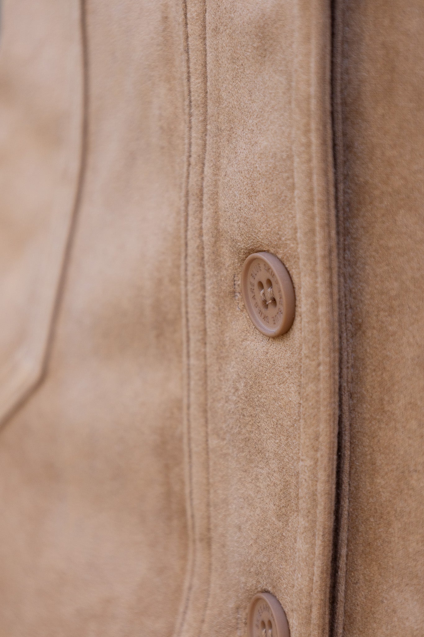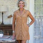 Step out in style with this camel suede mini dress, designed to turn heads. Its playful button-up front adds a flirty touch, while the sleeveless cut keeps it breezy and perfect for warm days or layering. Soft suede texture meets effortless charm in one chic package.