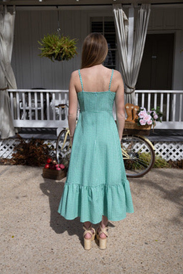 Escape to the coast in our Capri Coast Midi, a breezy gingham dream in kelly green and baby blue. Delicate thin straps keep things light and airy, while a charming front bow adds just the right touch of whimsy. Perfect for summer strolls, seaside getaways, or whenever you want to channel effortless coastal vibes. This midi length flatters every frame and transitions seamlessly from day to night.