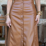 Step out in style with this playful caramel faux leather skirt. Featuring a high waist and an easy A-line cut, it flatters every curve while offering comfy movement. The button-up front adds a fun, flirty touch perfect for day-to-night looks. Pair it with your favorite top and watch your outfit glow with effortless charm.