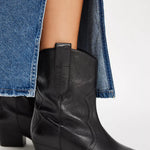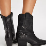 Free People black ankle boots. pull-on leather uppers, pointed toe, Western-style stitching, pull straps.