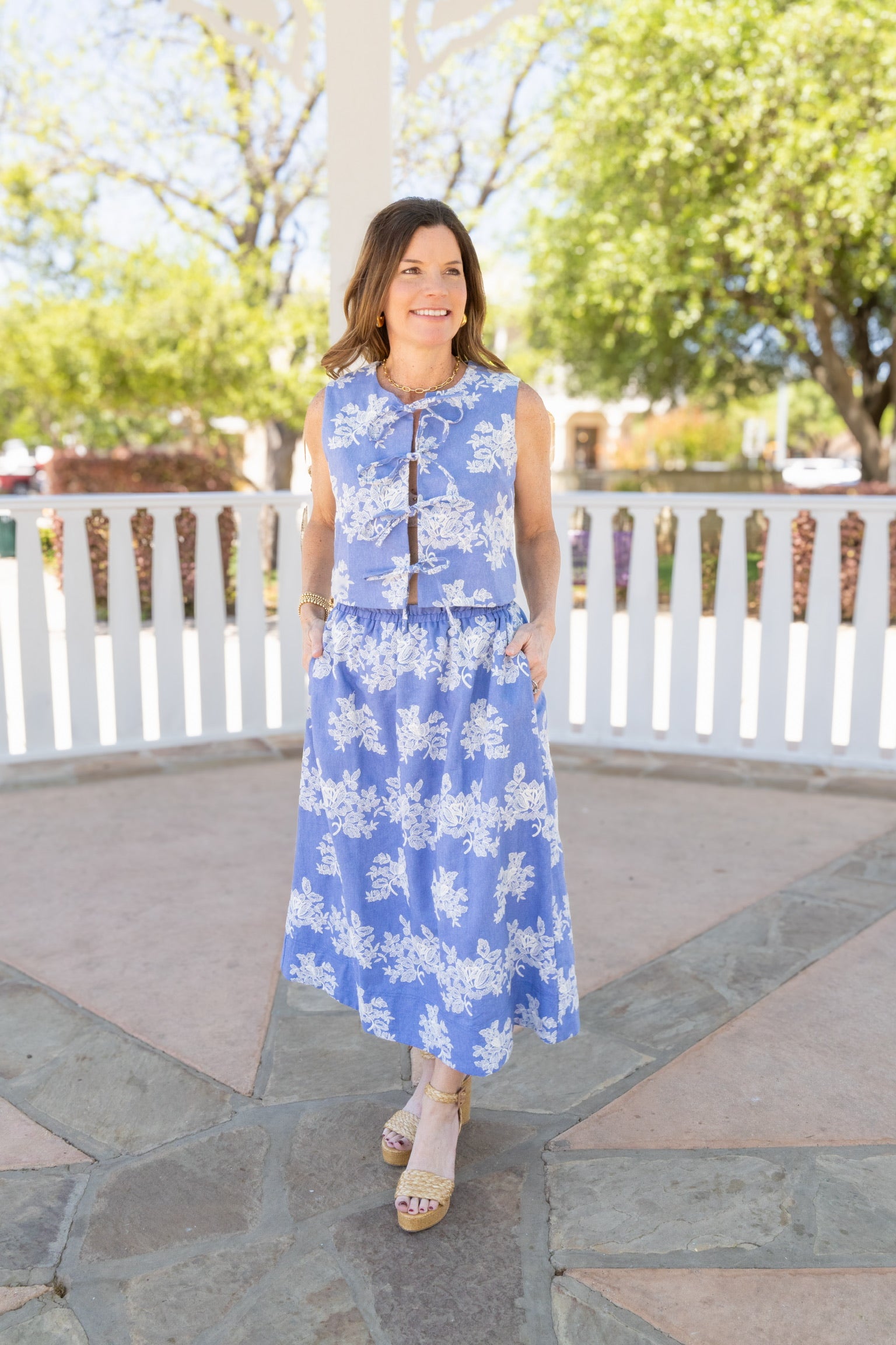 Make a statement with this chambray midi dress adorned with ivory floral embroidery. Perfect for any occasion, this dress puts a unique spin on a classic style. Dress it up or down, this dress is sure to turn heads with its playful yet sophisticated details.