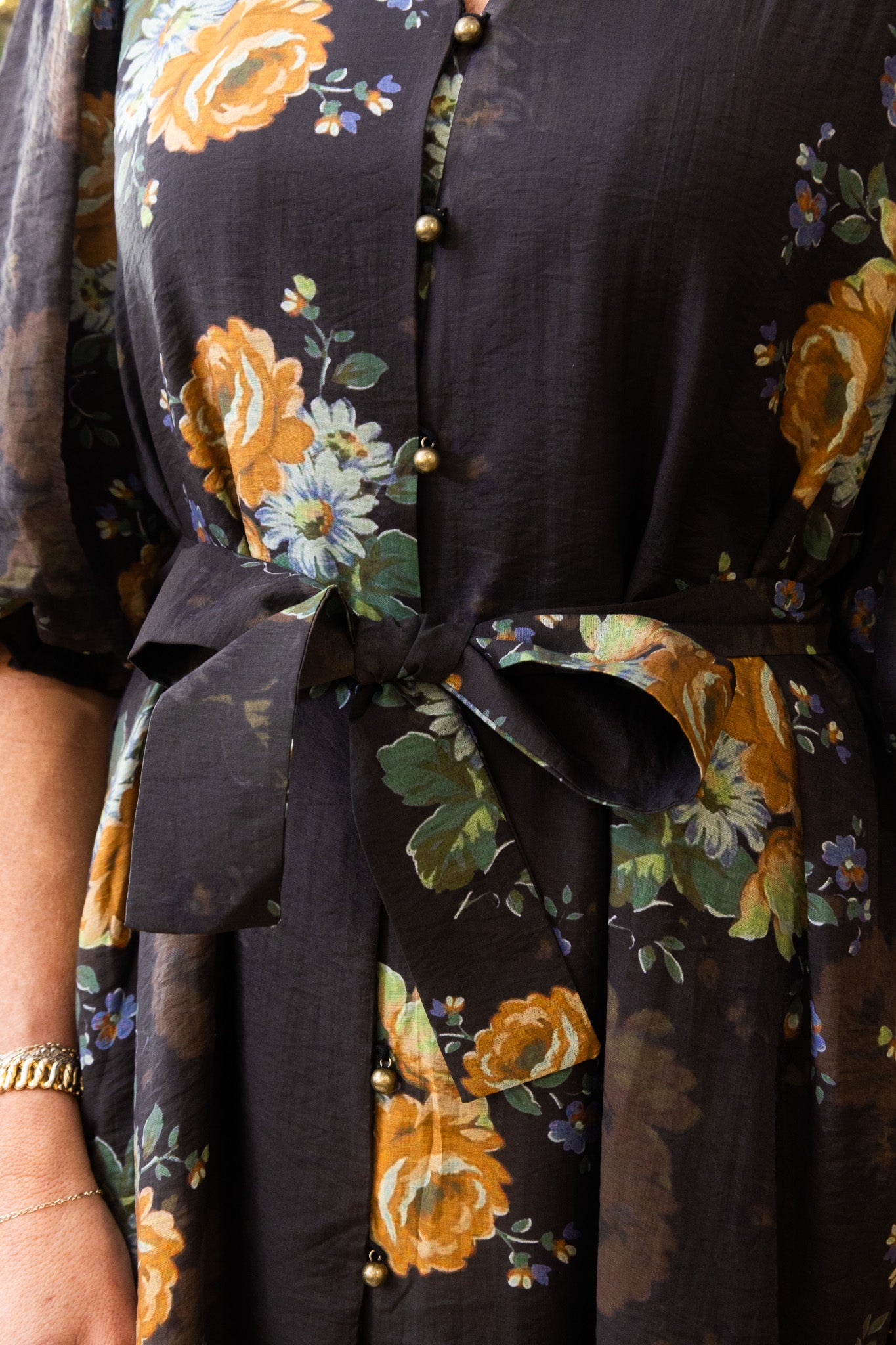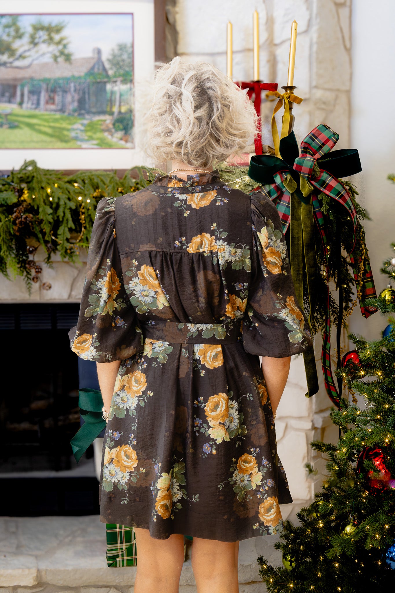 Twirl into any occasion in this charming chocolate floral mini dress! Delicate blooms dance across a rich, versatile base that pairs perfectly with sneakers or heels. The adjustable tie waist cinches your silhouette for a flattering, customizable fit that works with your body. Whether you're heading to brunch, a date night, or weekend adventures, this dress brings effortless style and a touch of botanical romance to your wardrobe.