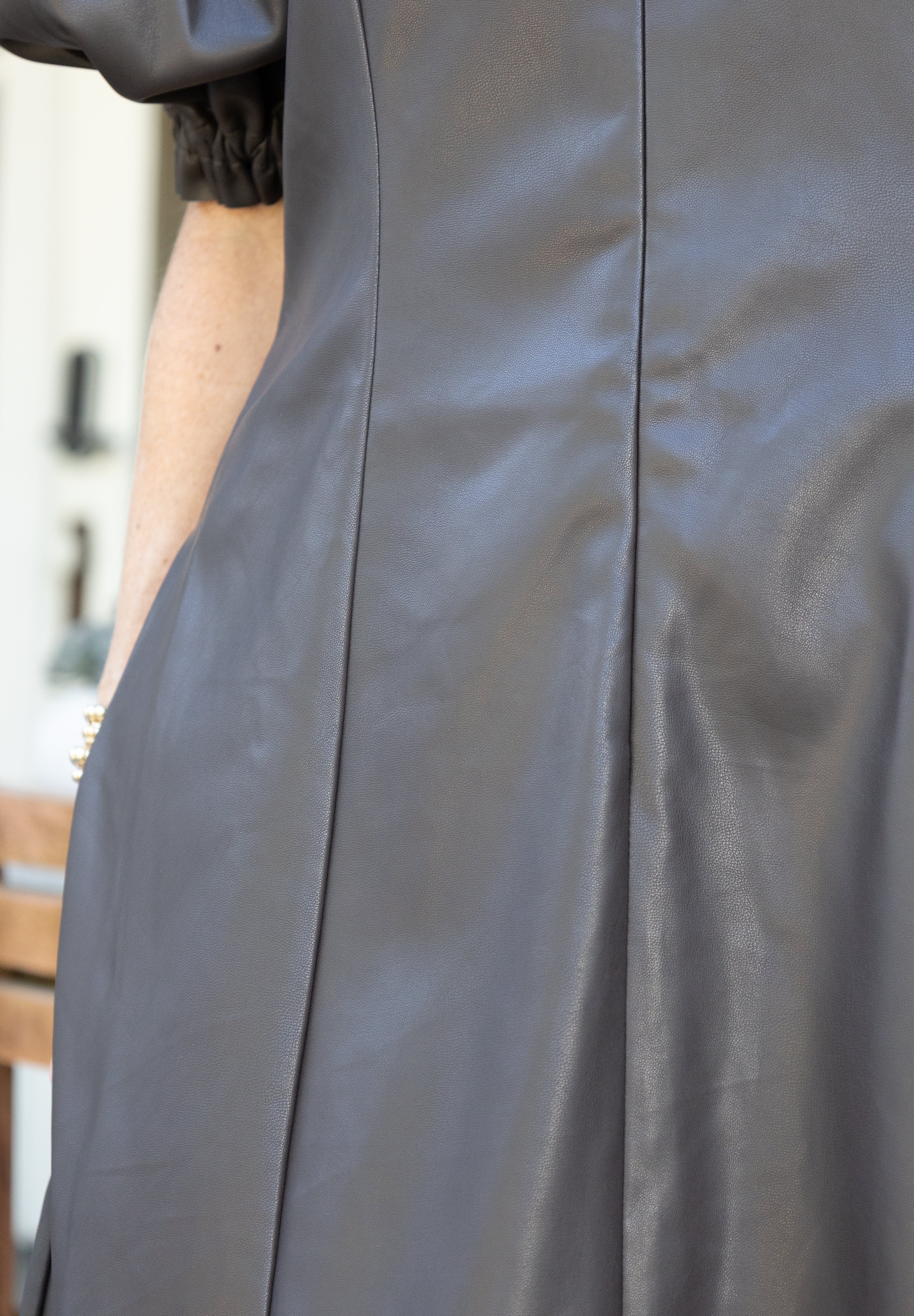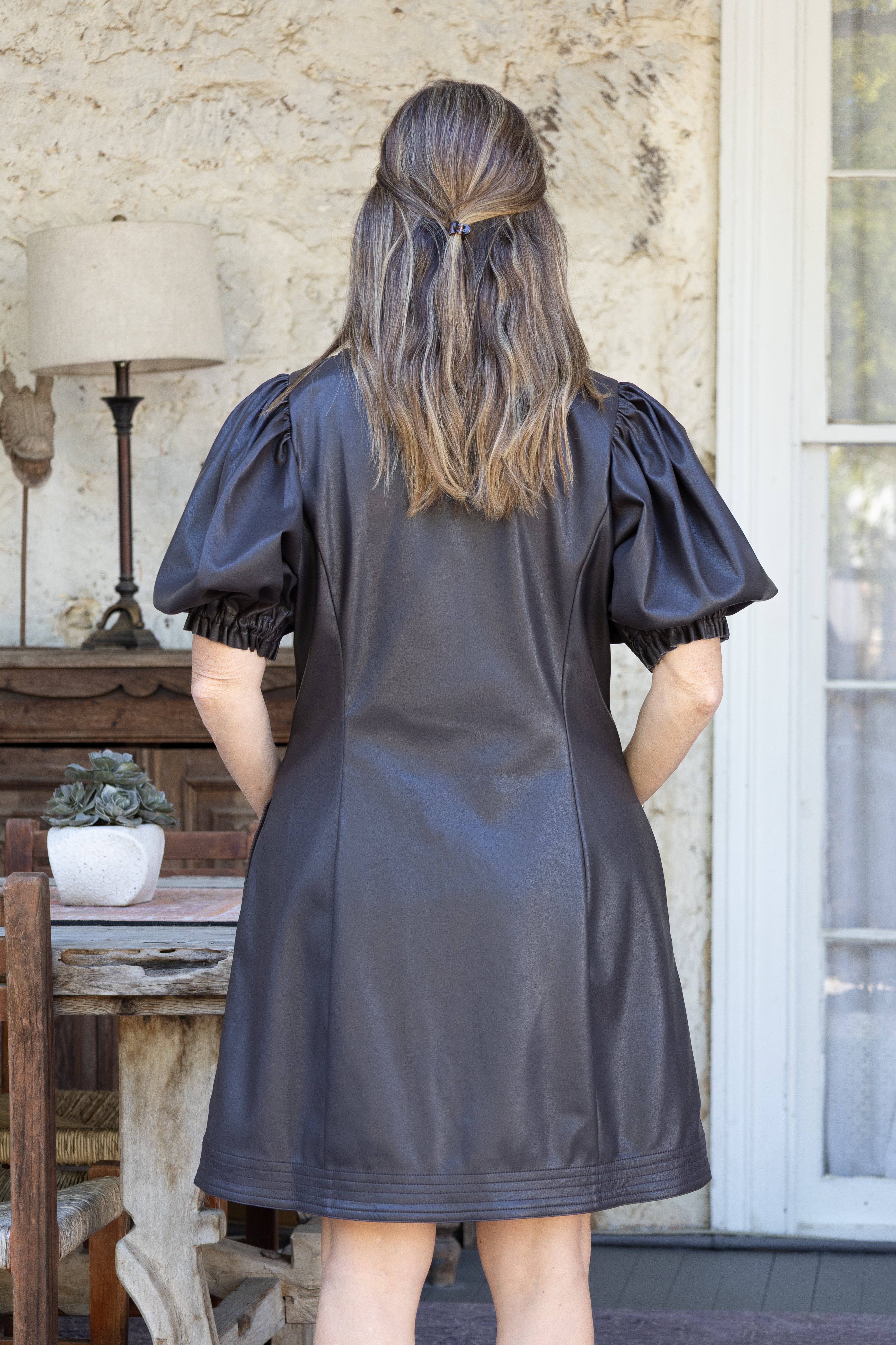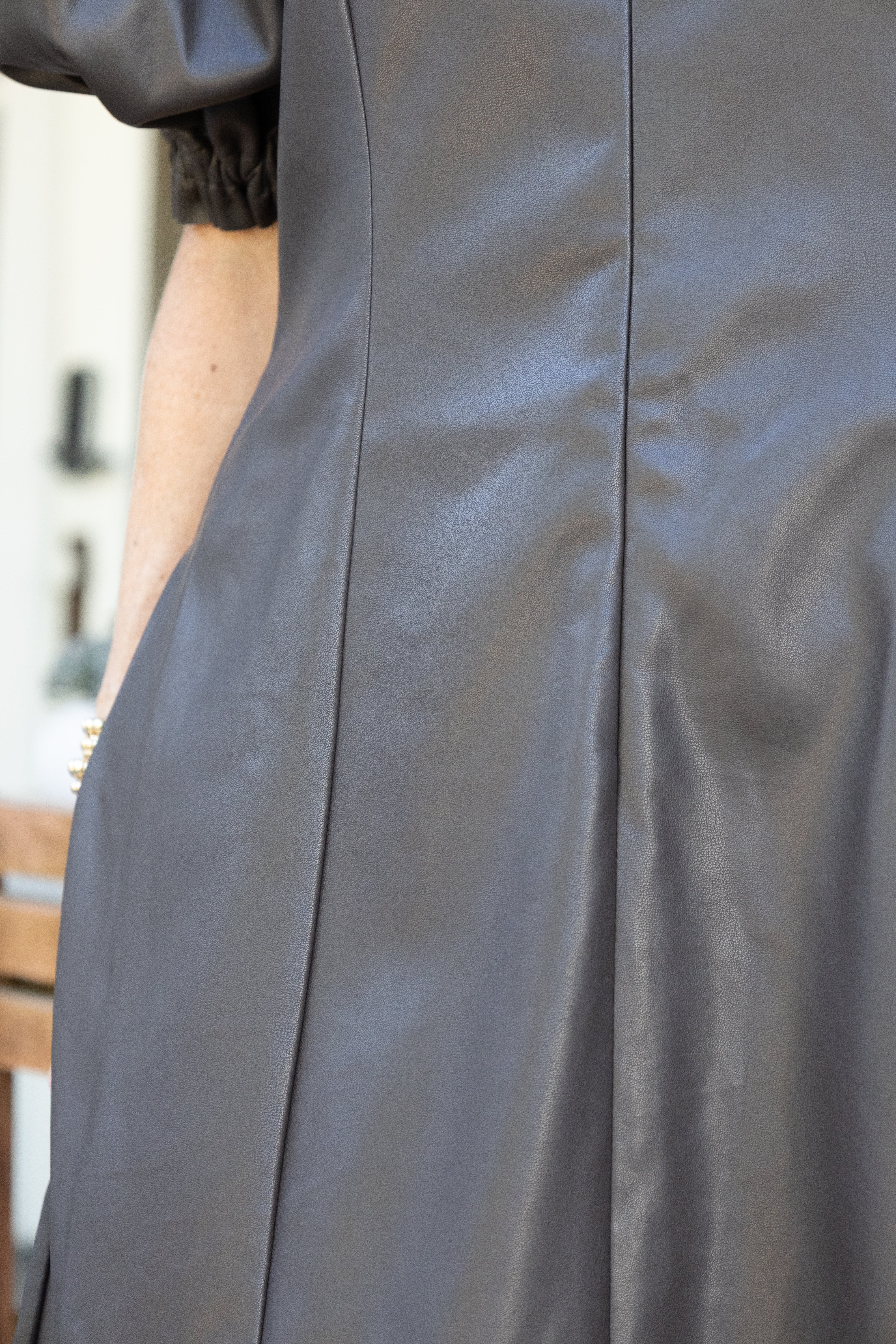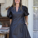 Turn heads in the Chocolate Leather Mini Dress, featuring a flirty V-neck and charming short puff sleeves. Its rich chocolate brown leather adds a bold edge while the mini length keeps it playful and fun. Perfect for nights out or any event where you want to make a confident statement with a touch of whimsy.