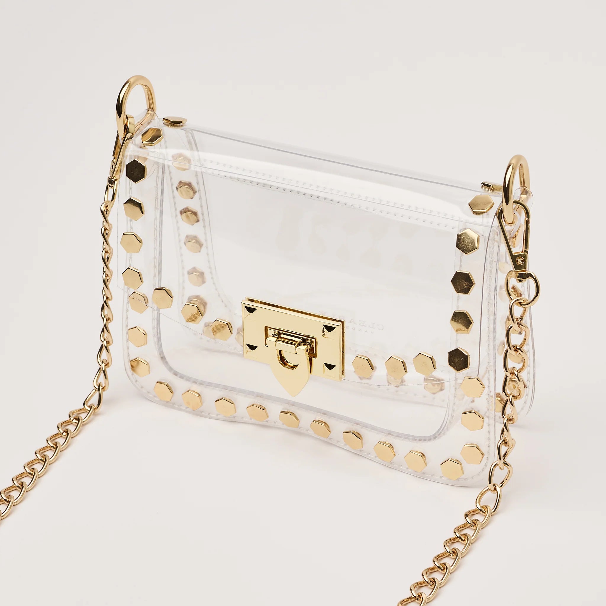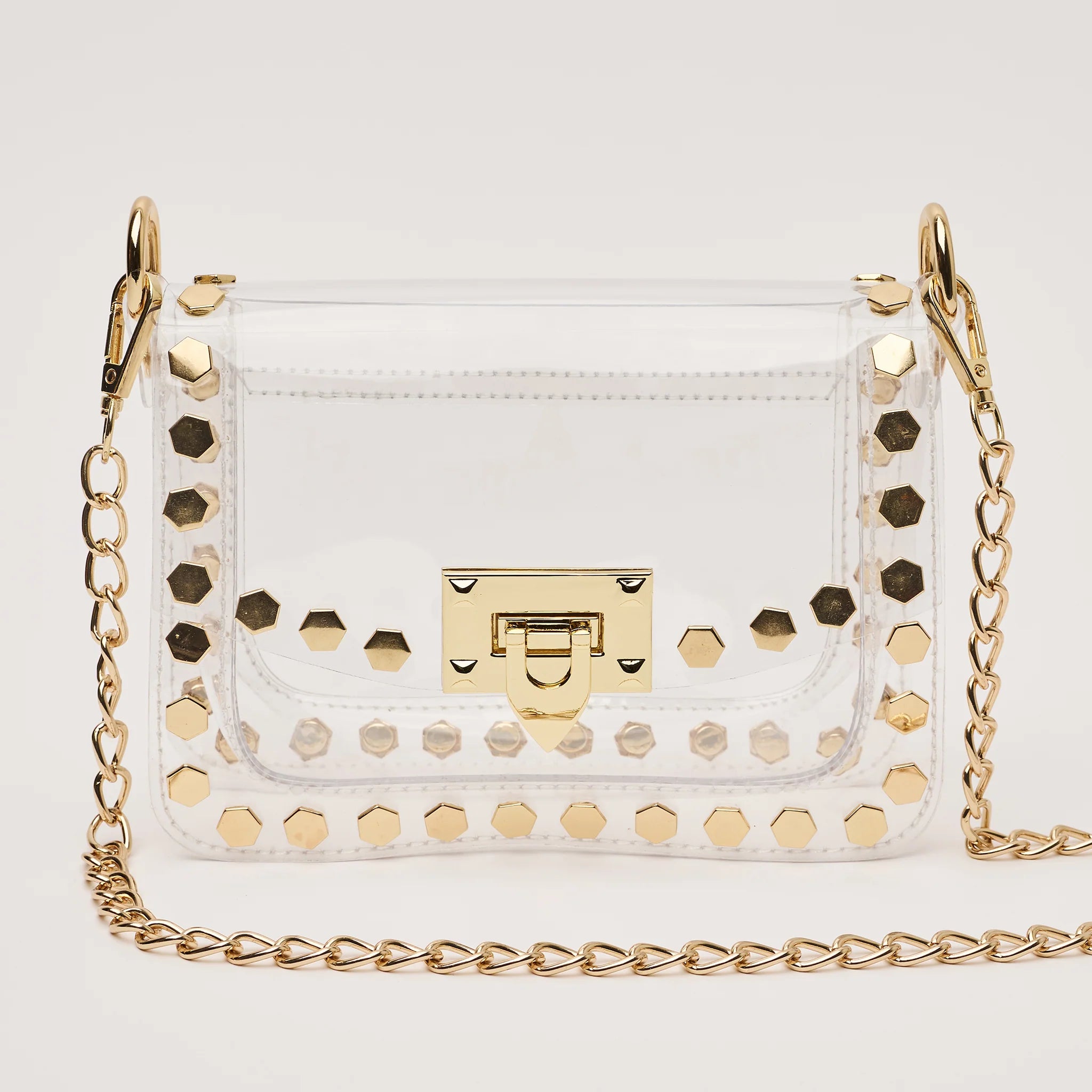 This style includes gold hexagon metal studs and a gold chain. The Jackie is NCAA and NFL compliant and the ideal size to hold your wallet, phone, keys, lip gloss and a few other small items.