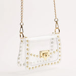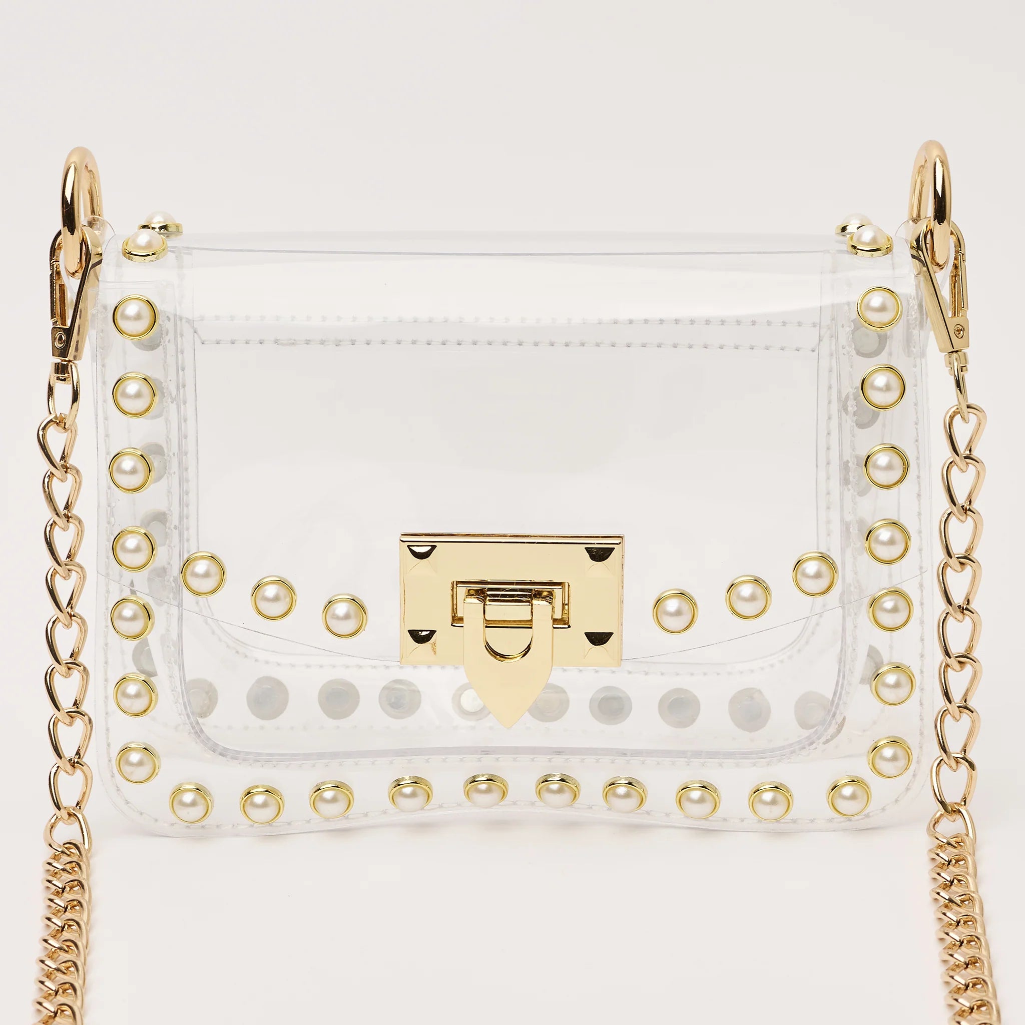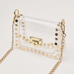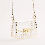 Score with the biggest winner in our clear handbag playbook - The Jackie! The Jackie changed the handbag game by proving clear handbags could be both functional and chic. This style includes pearl metal studs and a gold chain. The Jackie is NCAA and NFL compliant and the ideal size to hold your wallet, phone, keys, lip gloss and a few other small items.