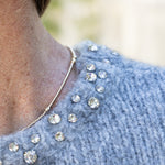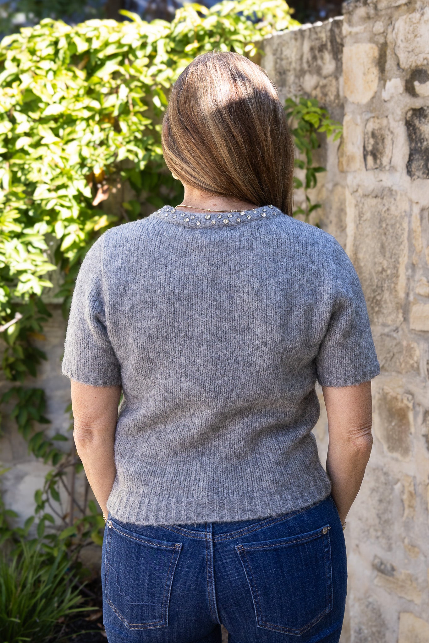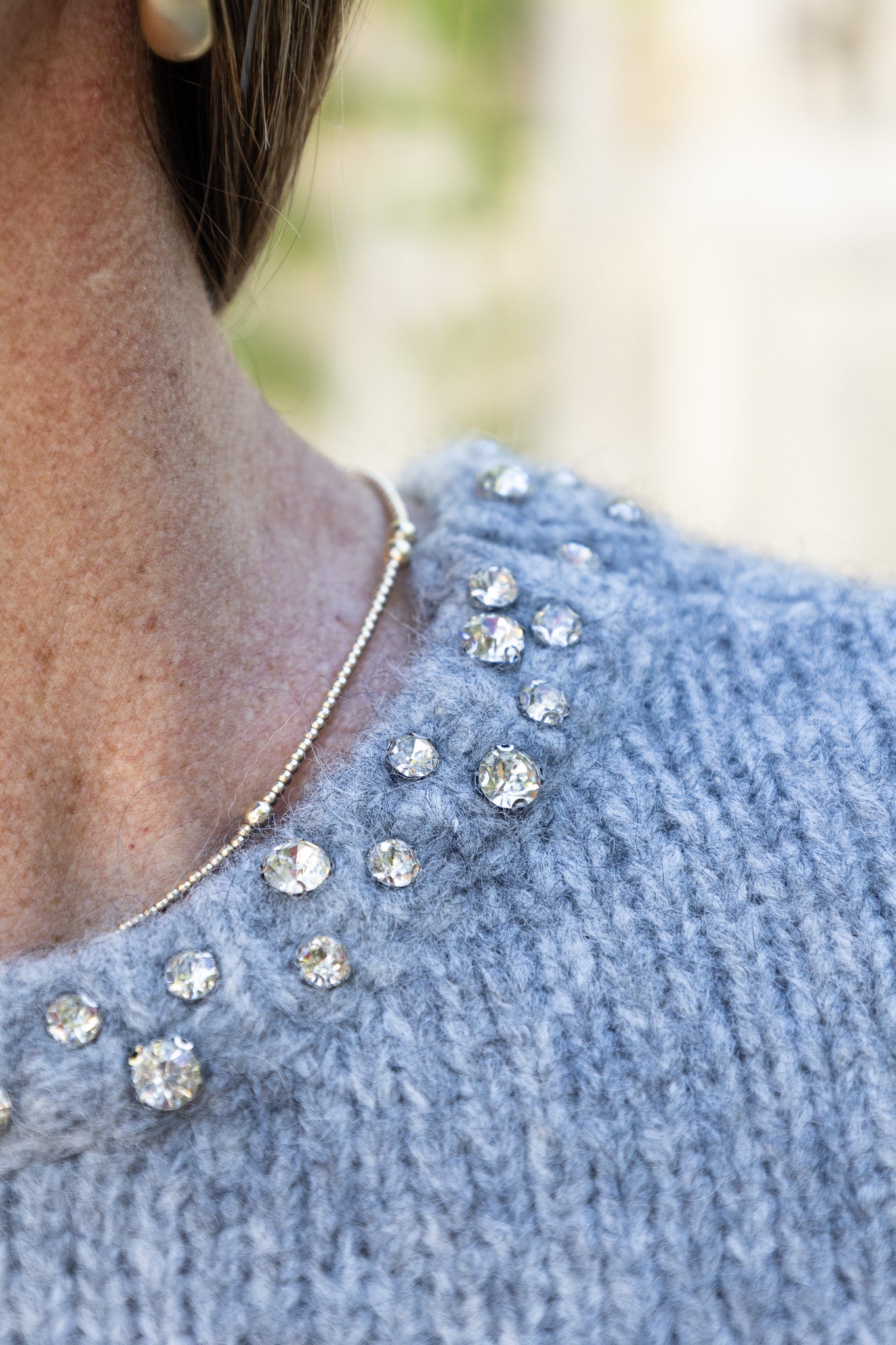 Add a touch of sparkle to your cozy days with the Sterling Sweater. This soft grey sweater features a rhinestone-embellished neckline that adds just the right amount of shimmer to your casual look. Perfect for staying warm while feeling effortlessly chic, it’s your new go-to for comfy glam.