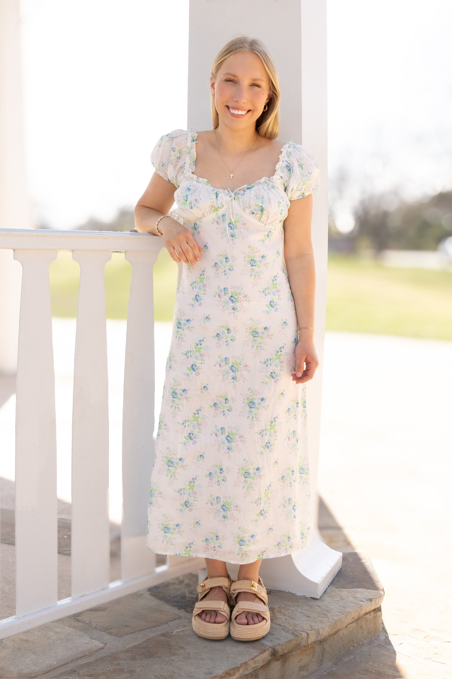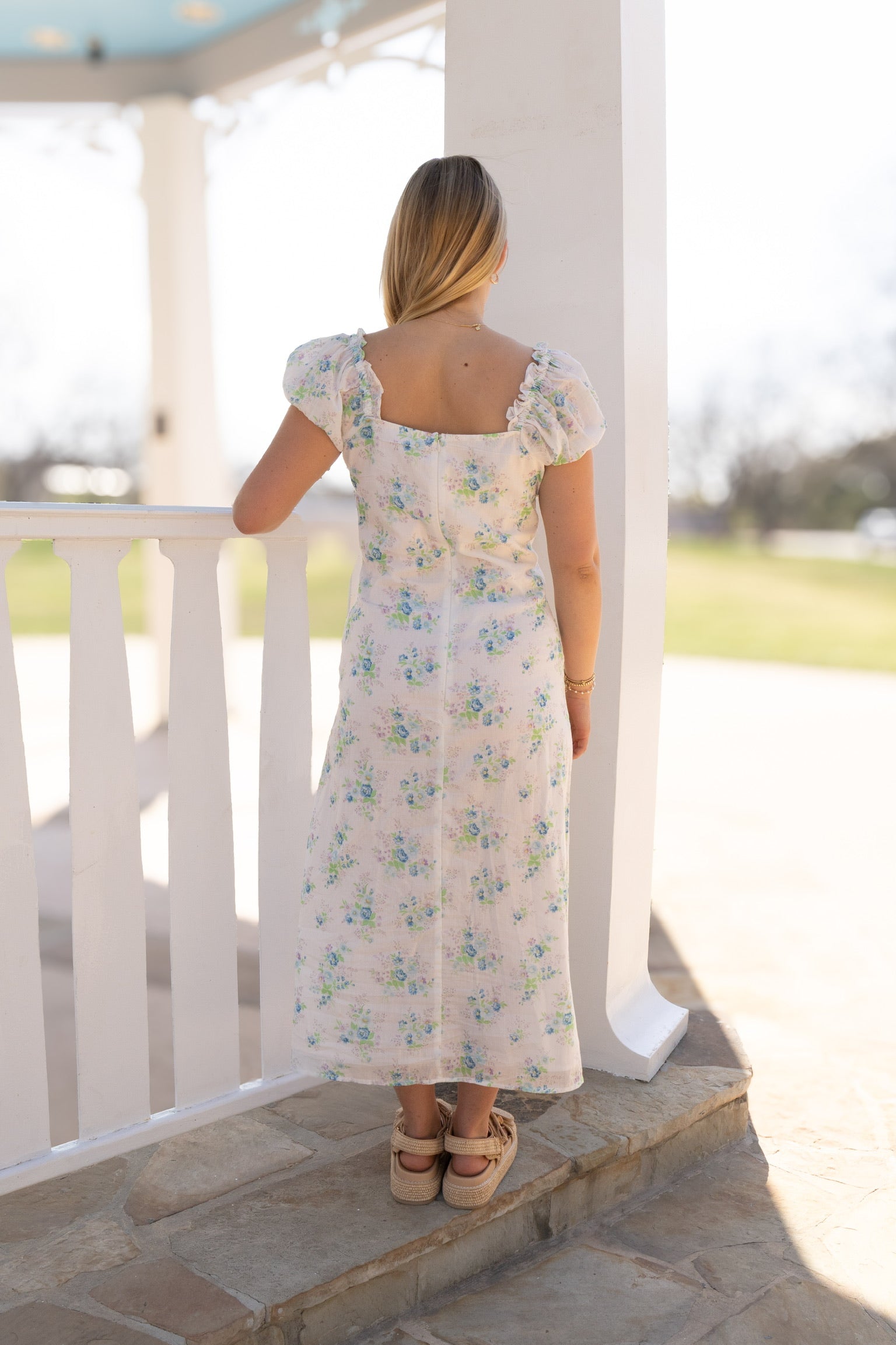 Step into elegance with the Daphne midi dress in hand-painted lemon ditsy. Crafted with an elegant ruffle trim neckline, statement puff sleeves and a tie-up bow detailing for an added touch of romance.