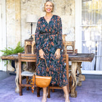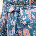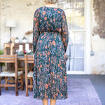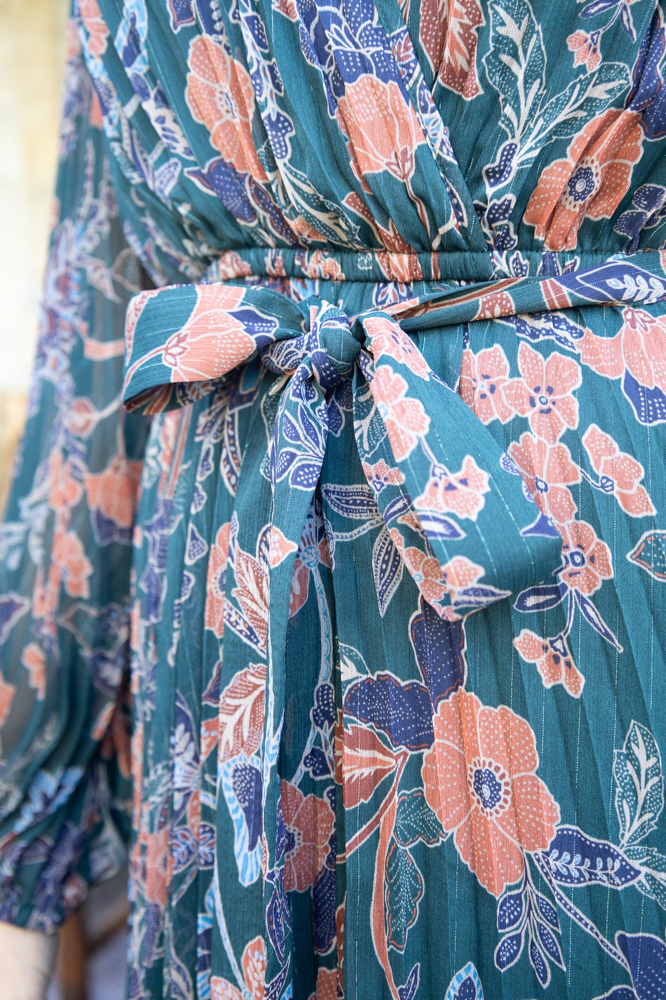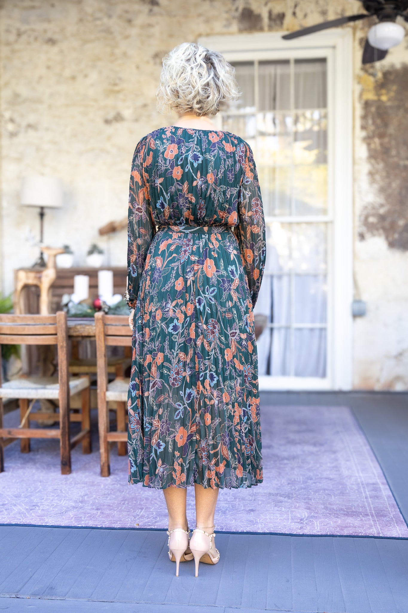 Twirl into elegance with this dark green floral maxi dress, where timeless romance meets modern style. Long sleeves provide graceful coverage while the tie-at-the-waist design cinches your silhouette beautifully. Pleated details add movement and dimension, creating a flattering flow that dances with every step. Perfect for garden parties, date nights, or whenever you want to feel effortlessly chic and utterly enchanting.