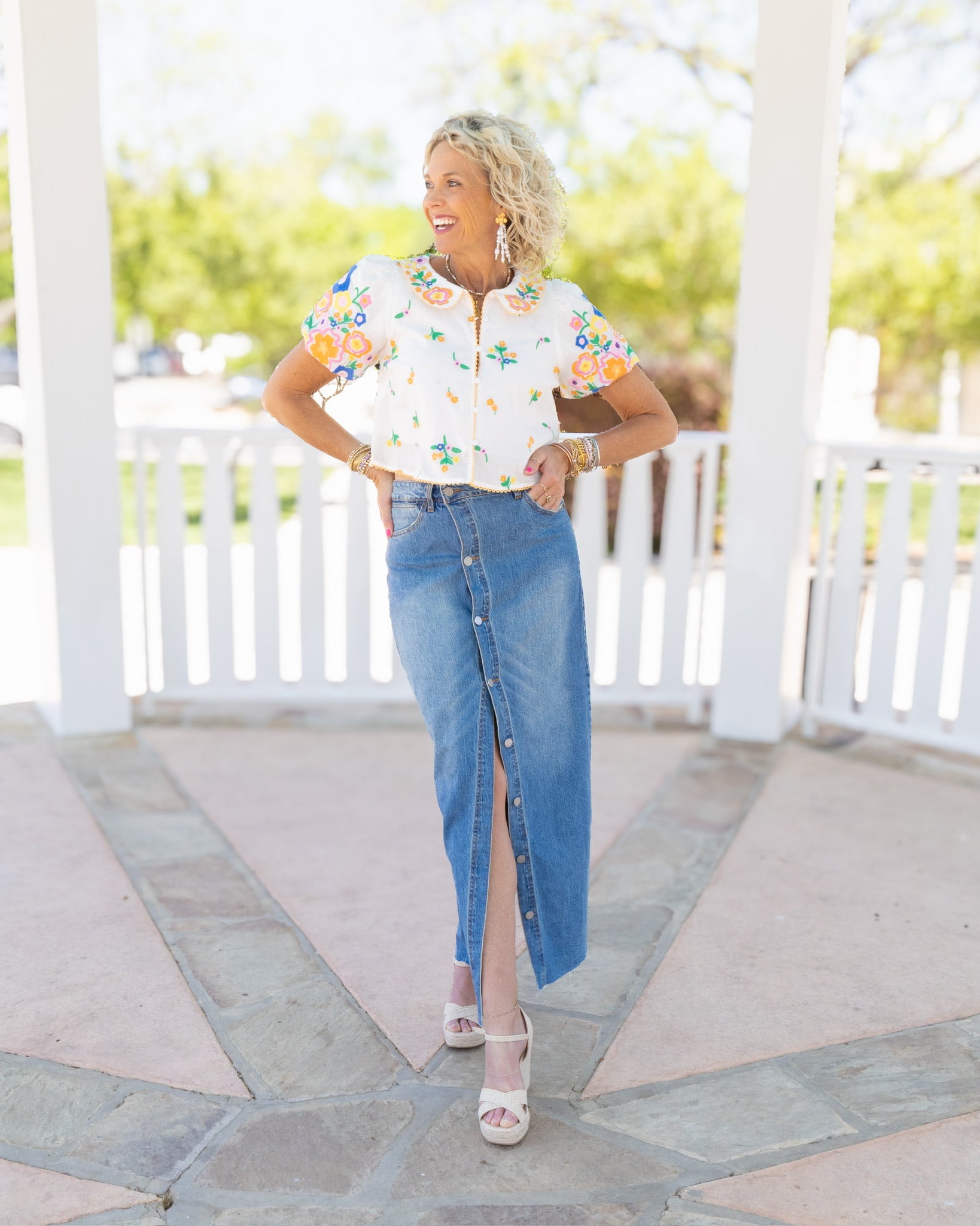 Get ready to strut your stuff with this denim maxi skirt featuring a unique diagonal button closure. Perfect for a fun and playful look, this skirt will have you feeling confident and stylish all day long. Show off your individuality with the Denim Maxi Skirt!