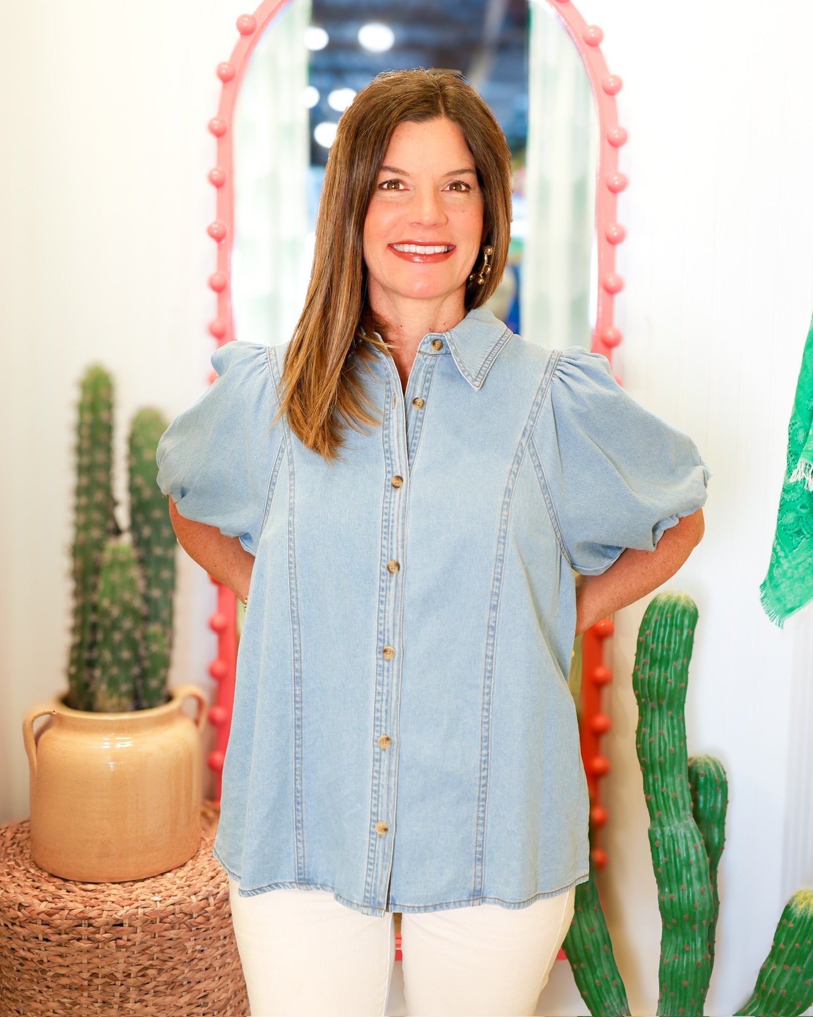 Get ready to puff up your fashion game with our Denim Puff Sleeve Top! This playful and stylish top features a button up design and trendy puff sleeves, perfect for making a statement. Upgrade your wardrobe with this must-have top today!