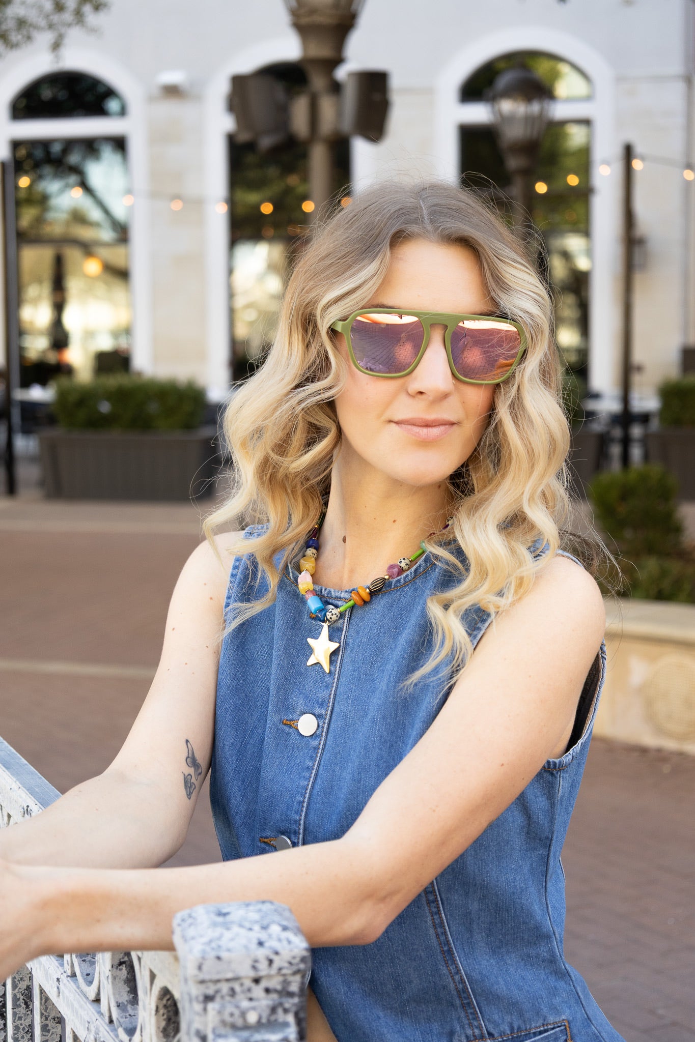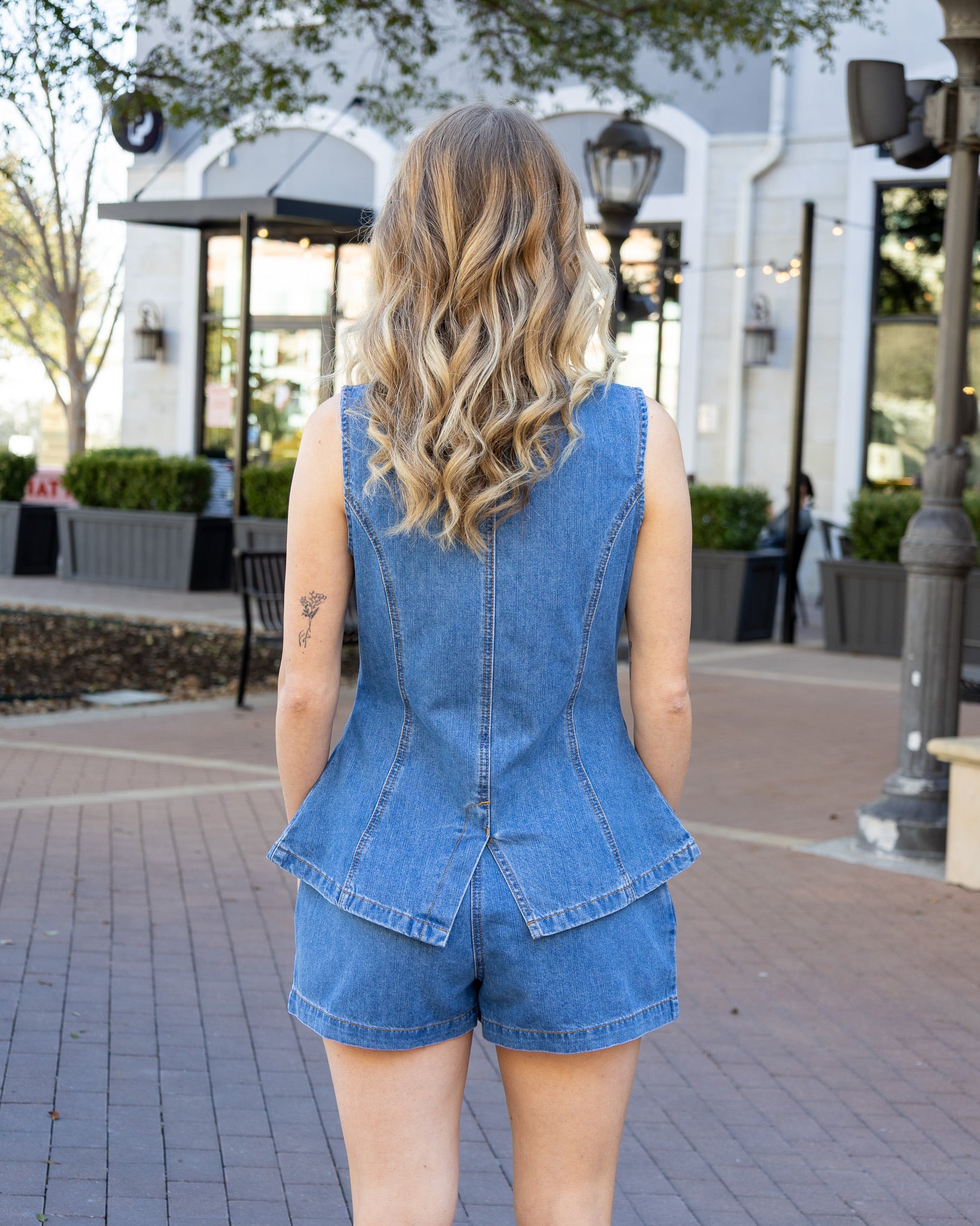 Throw on this fun denim duo and you're ready for anything! The button-down v-neck vest pairs perfectly with matching shorts, both loaded with practical pockets to keep your essentials close.