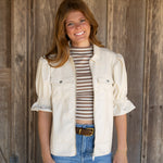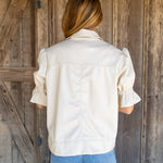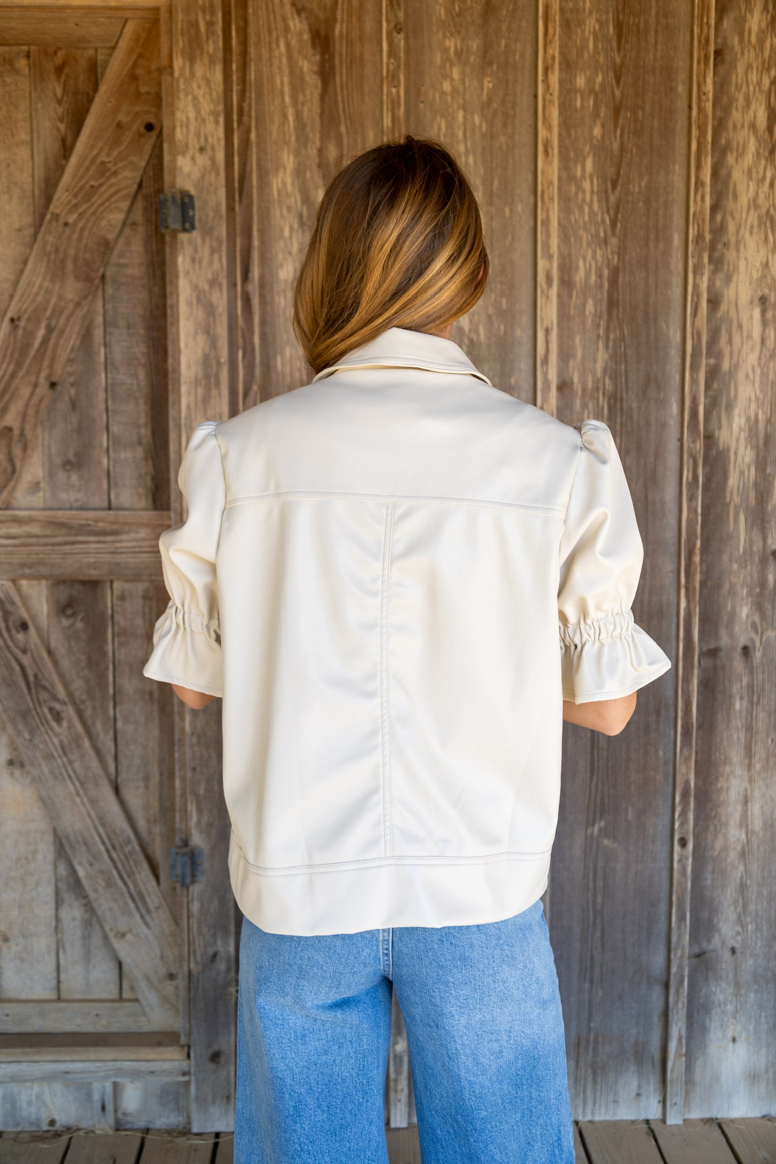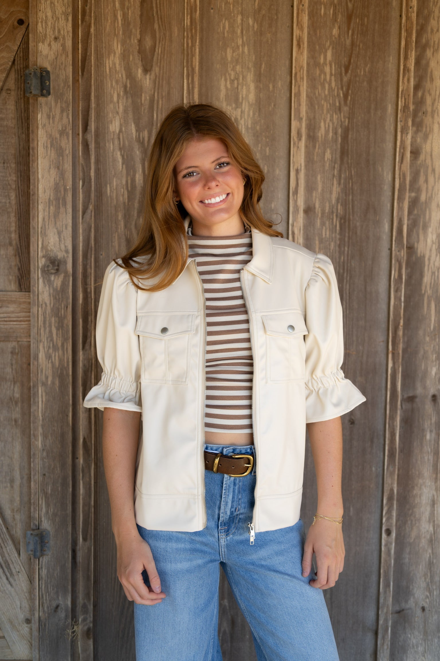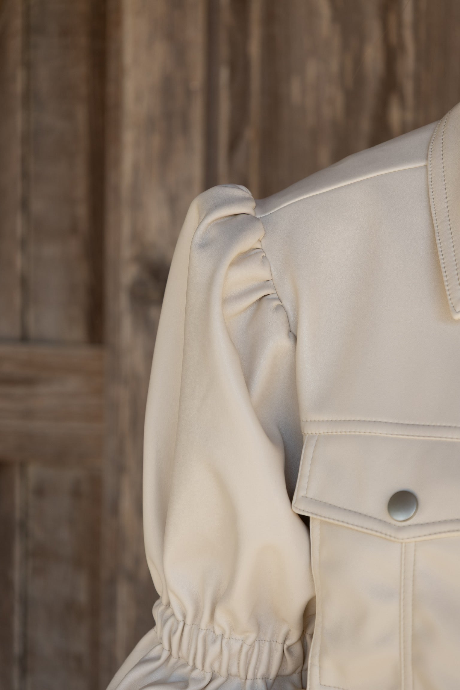 Elevate your style with this playful ecru faux leather top featuring charming short puff sleeves. Its sleek, soft texture adds a trendy edge while the puff sleeves bring a fun, flirty vibe—perfect for turning heads whether you're out with friends or making a statement at a casual event.
