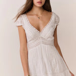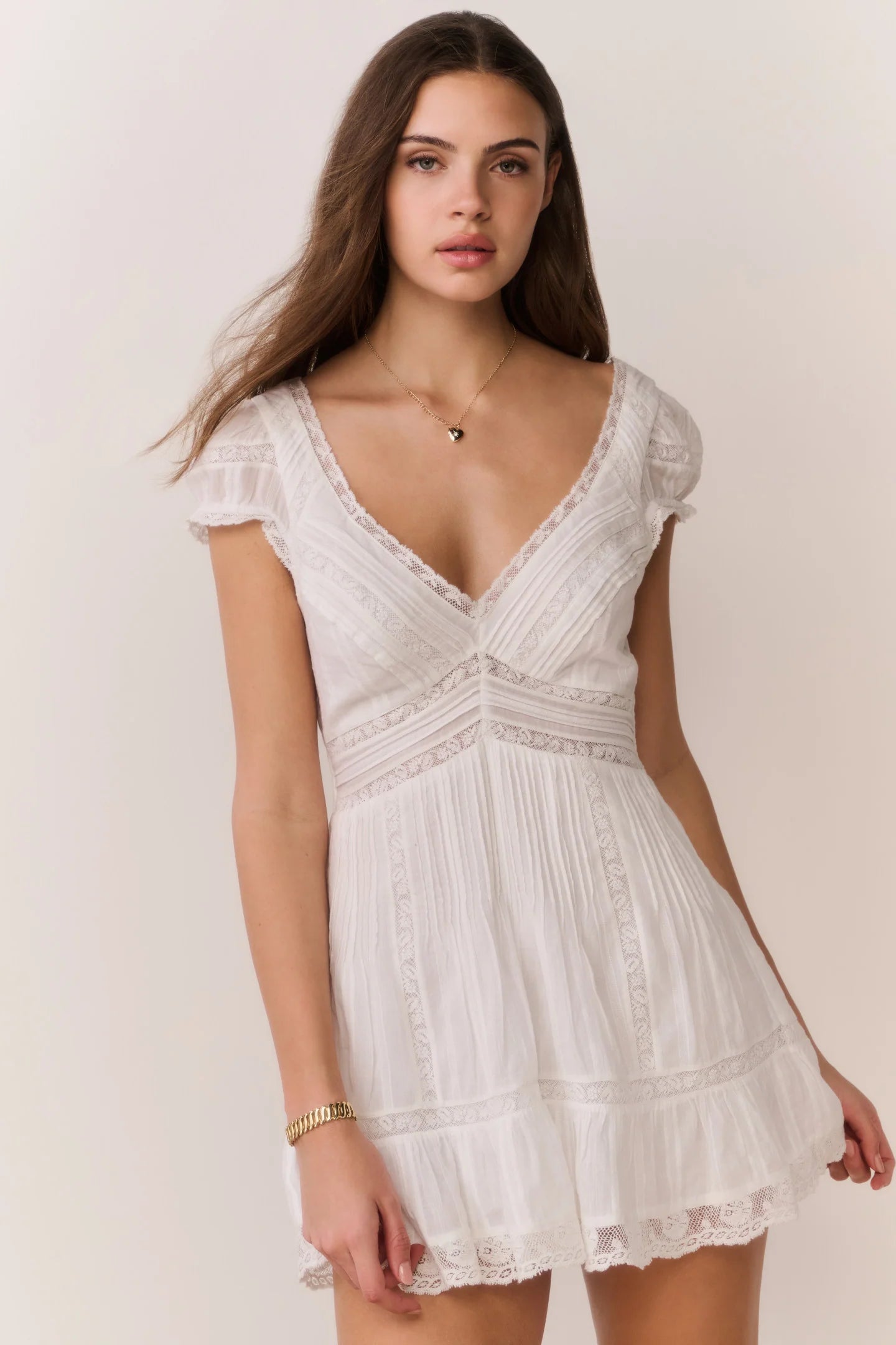 Inspired by our bestselling Suvi Dress, the Edena Dress arrives in a lightweight cotton with a flattering fit-and-flare silhouette. A plunging neckline and short puff sleeves frame the shoulders with soft structure, while sheer lace panels through the bodice add delicate texture.