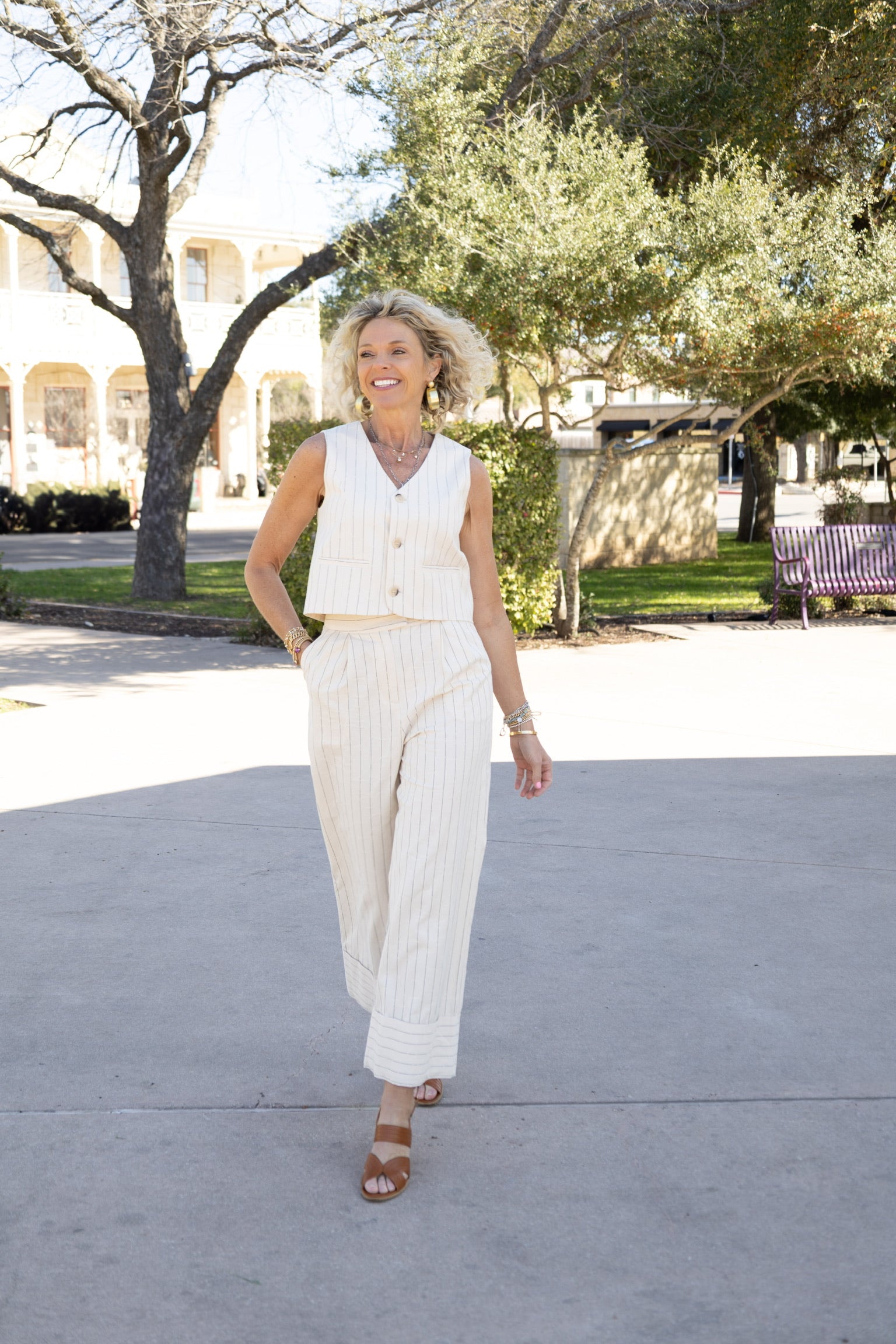 Ivory stirpe v-neck woven jacquard fabric with two mock pockets.
