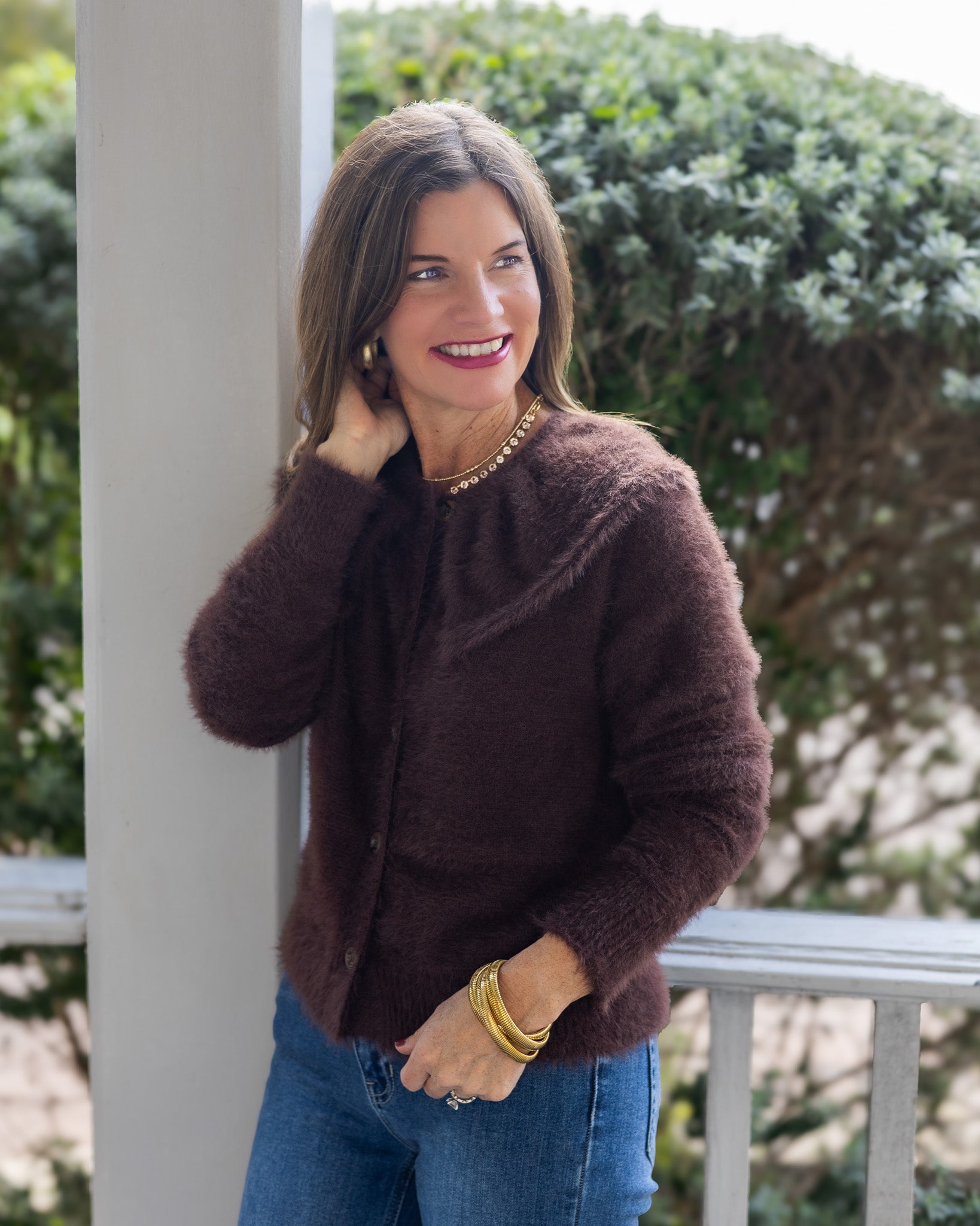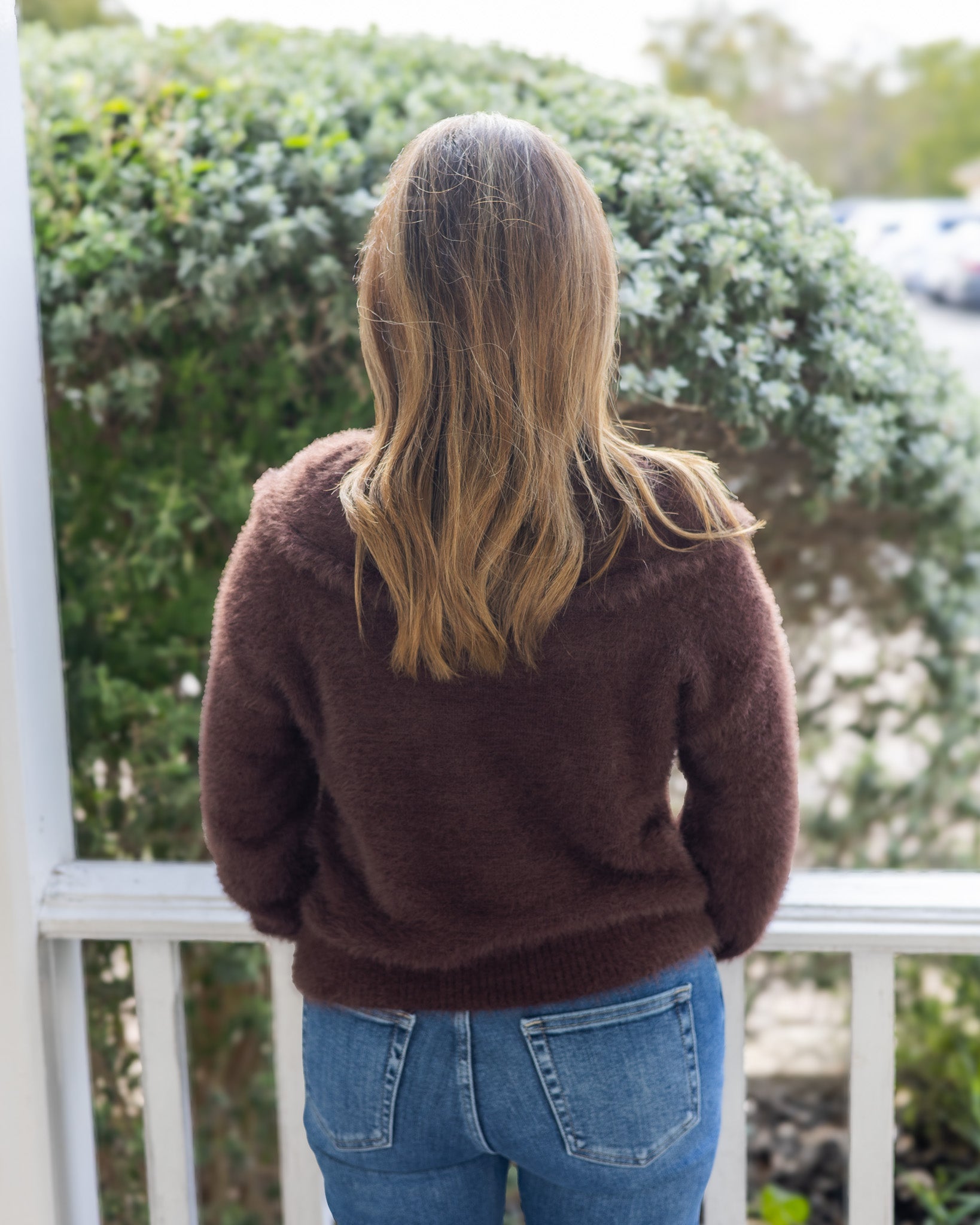 Cozy up in the Everett Brown Fuzzy Cardigan, featuring a delightfully oversized collar that adds a fun twist to your look. The soft, dark brown fuzziness feels like a warm hug, while front buttons make it easy to layer over your favorite outfits.