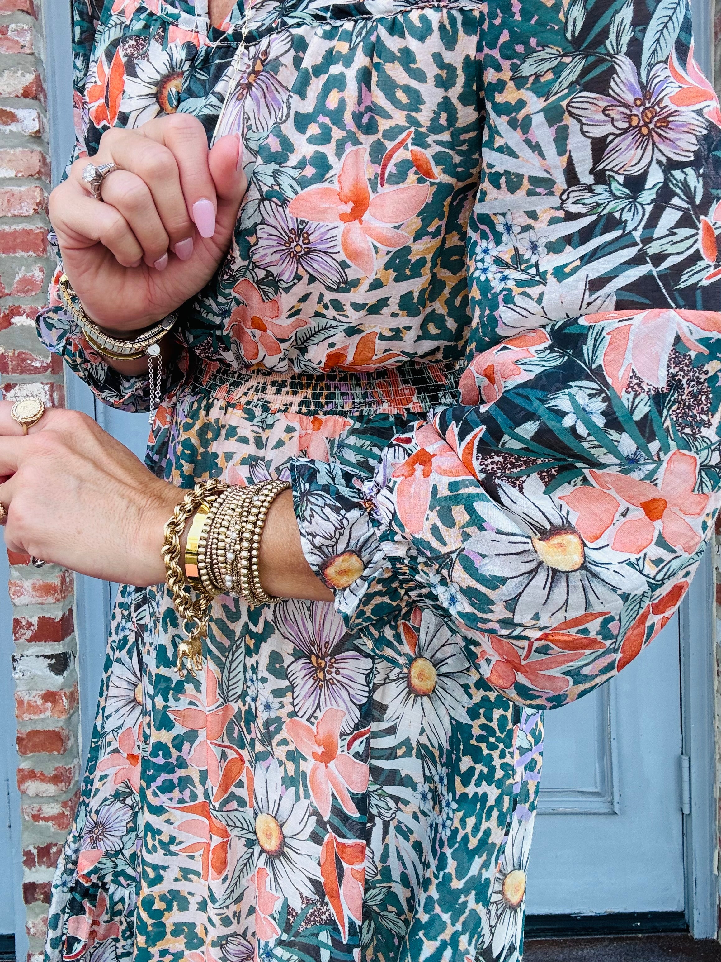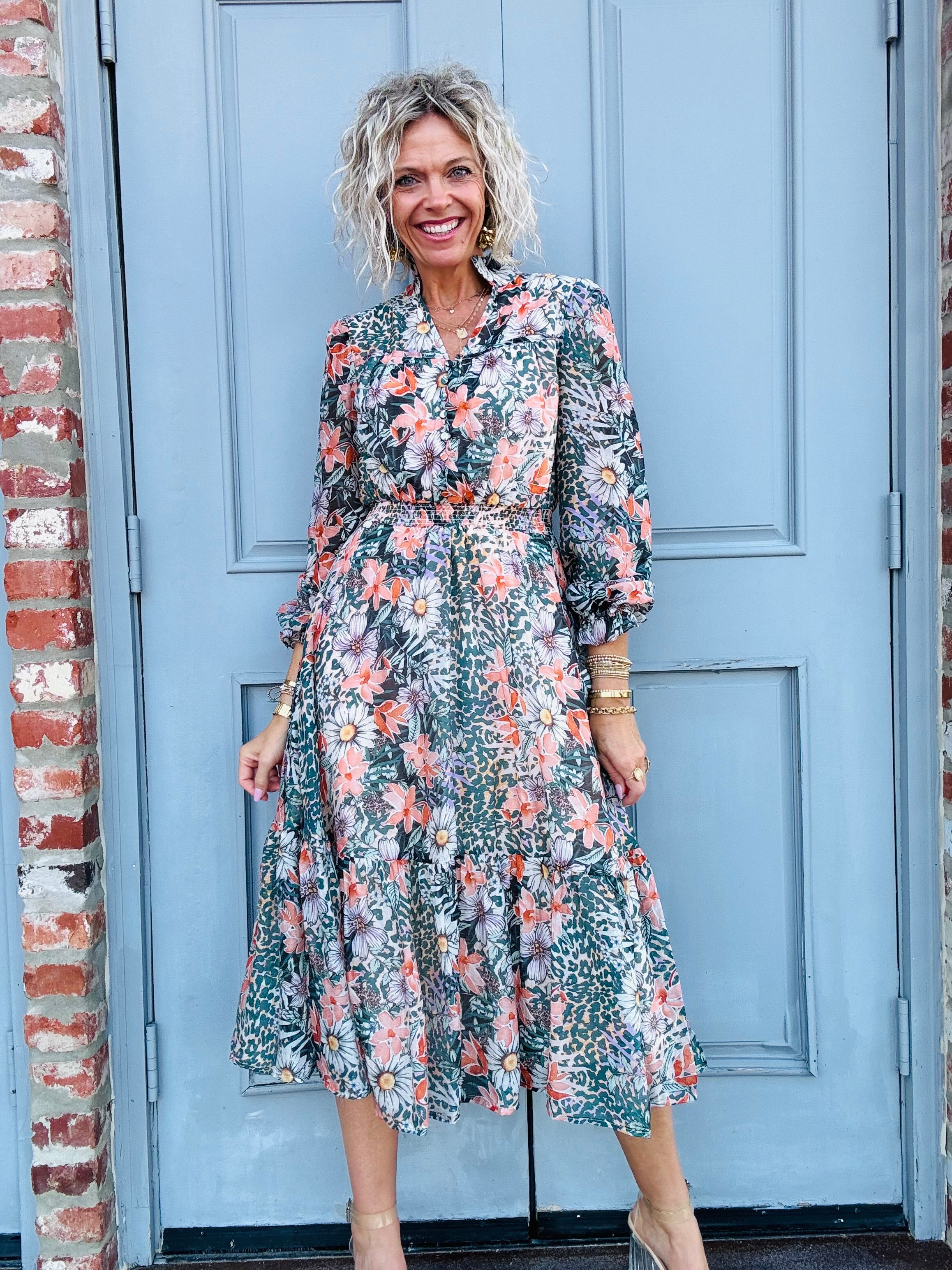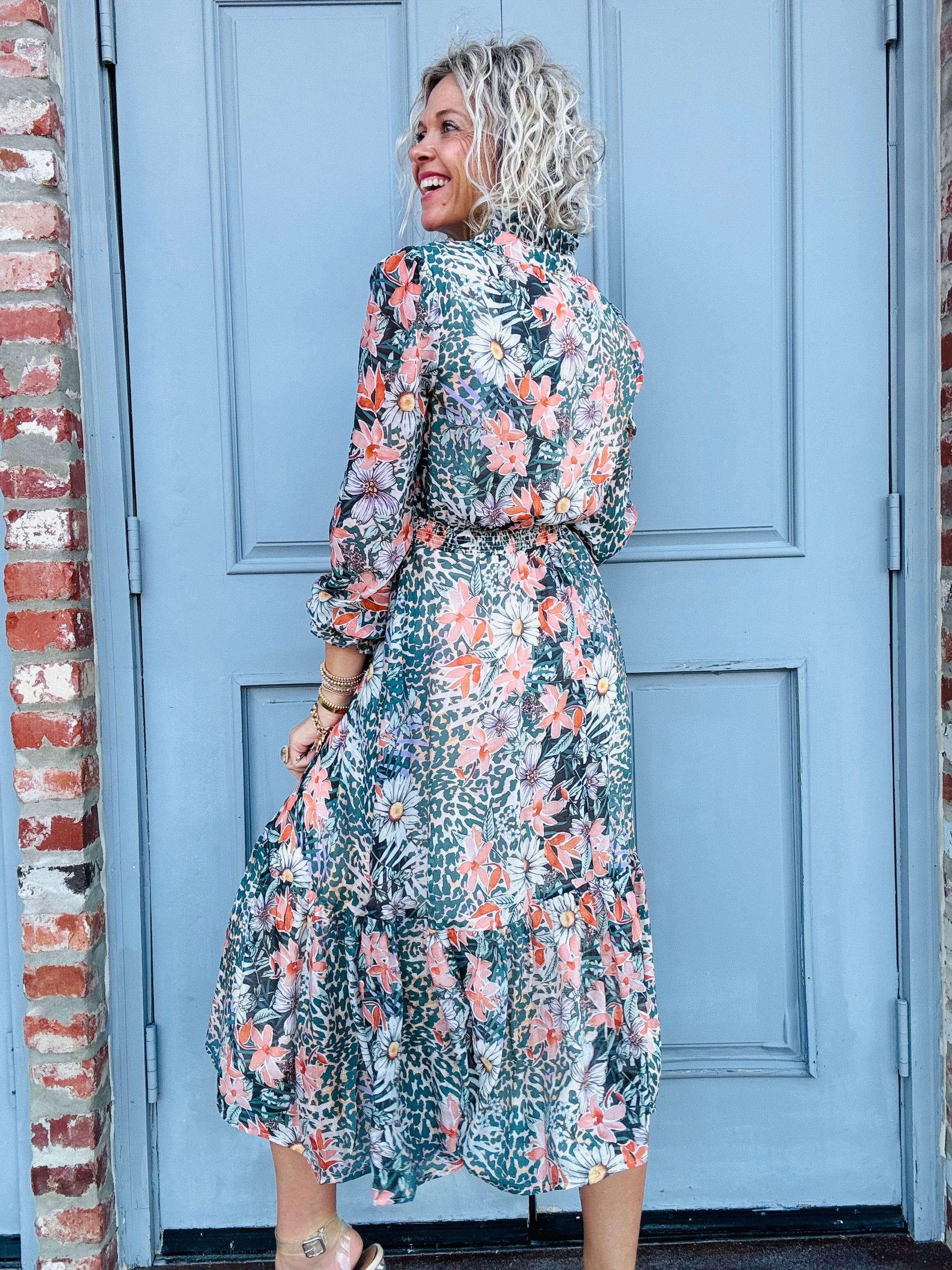 Unleash your wild side in our Floral Animal Maxi! The vibrant green and orange print will make you stand out in any crowd. So go ahead, embrace your inner fashionista with this quirky and playful statement piece.