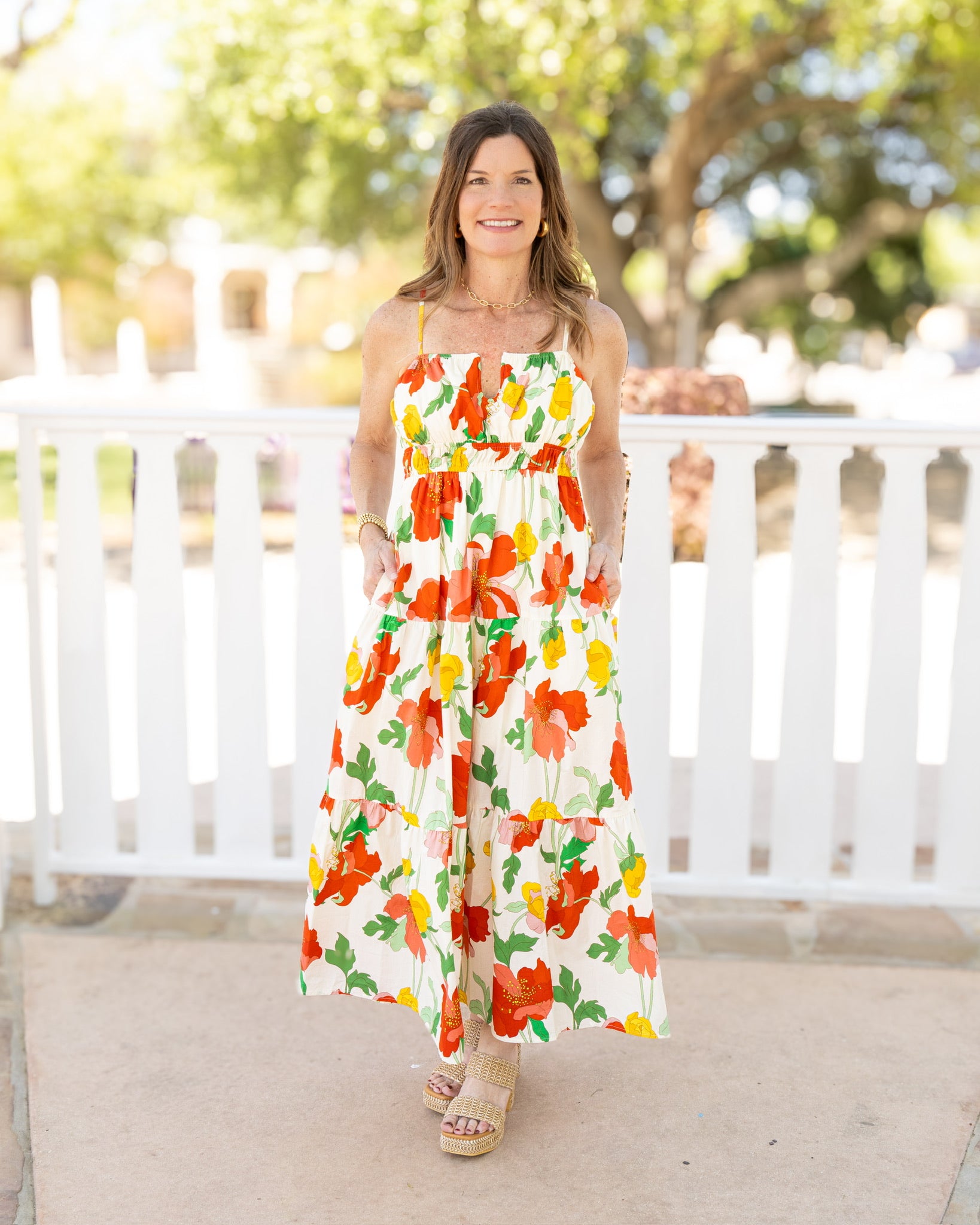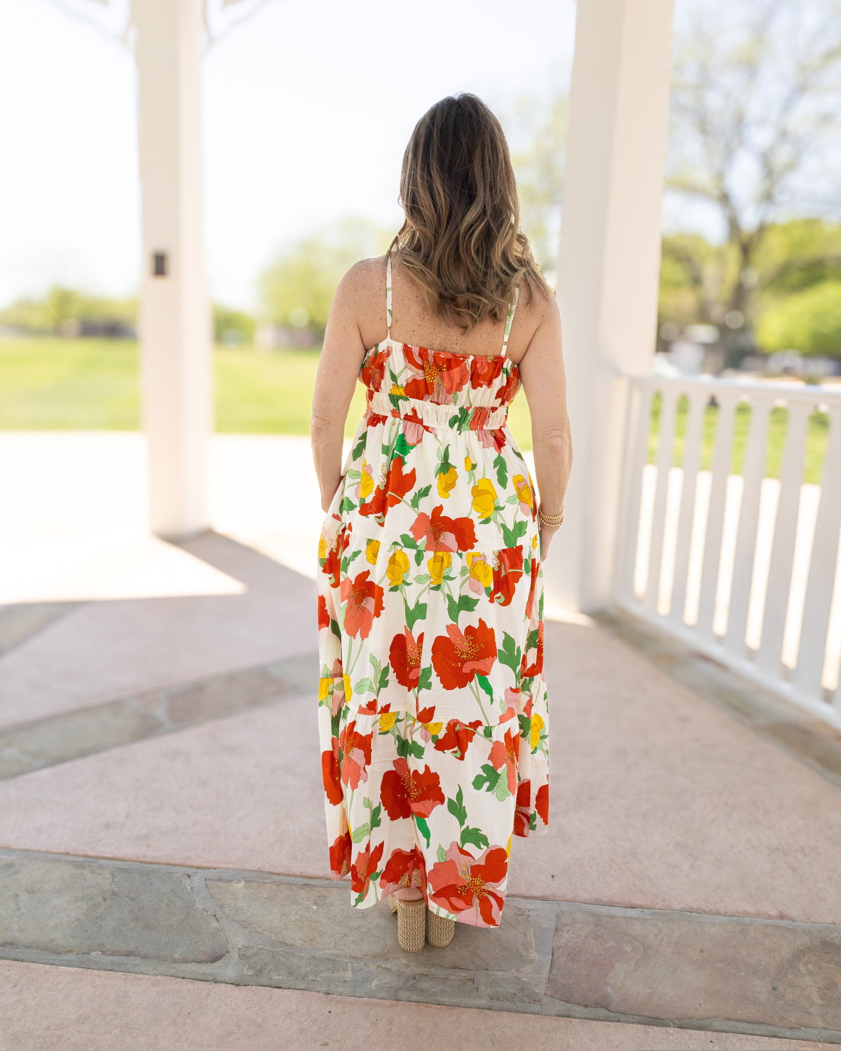 Introducing our Floral Cream Maxi, the perfect blend of elegance and whimsy. This ivory maxi dress boasts a large red poppy print, adding a playful touch to your wardrobe. Elevate any occasion with this versatile and vibrant piece.