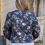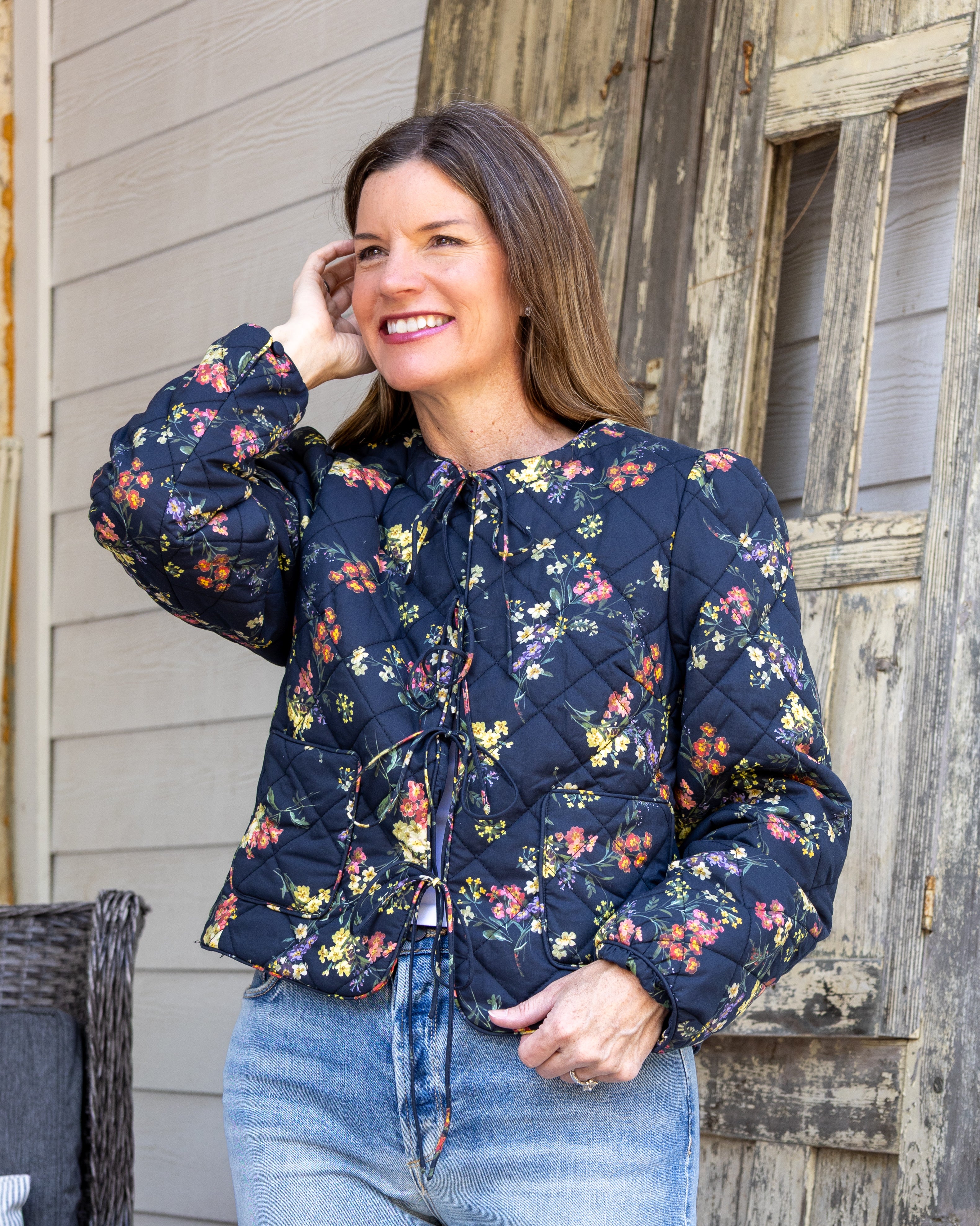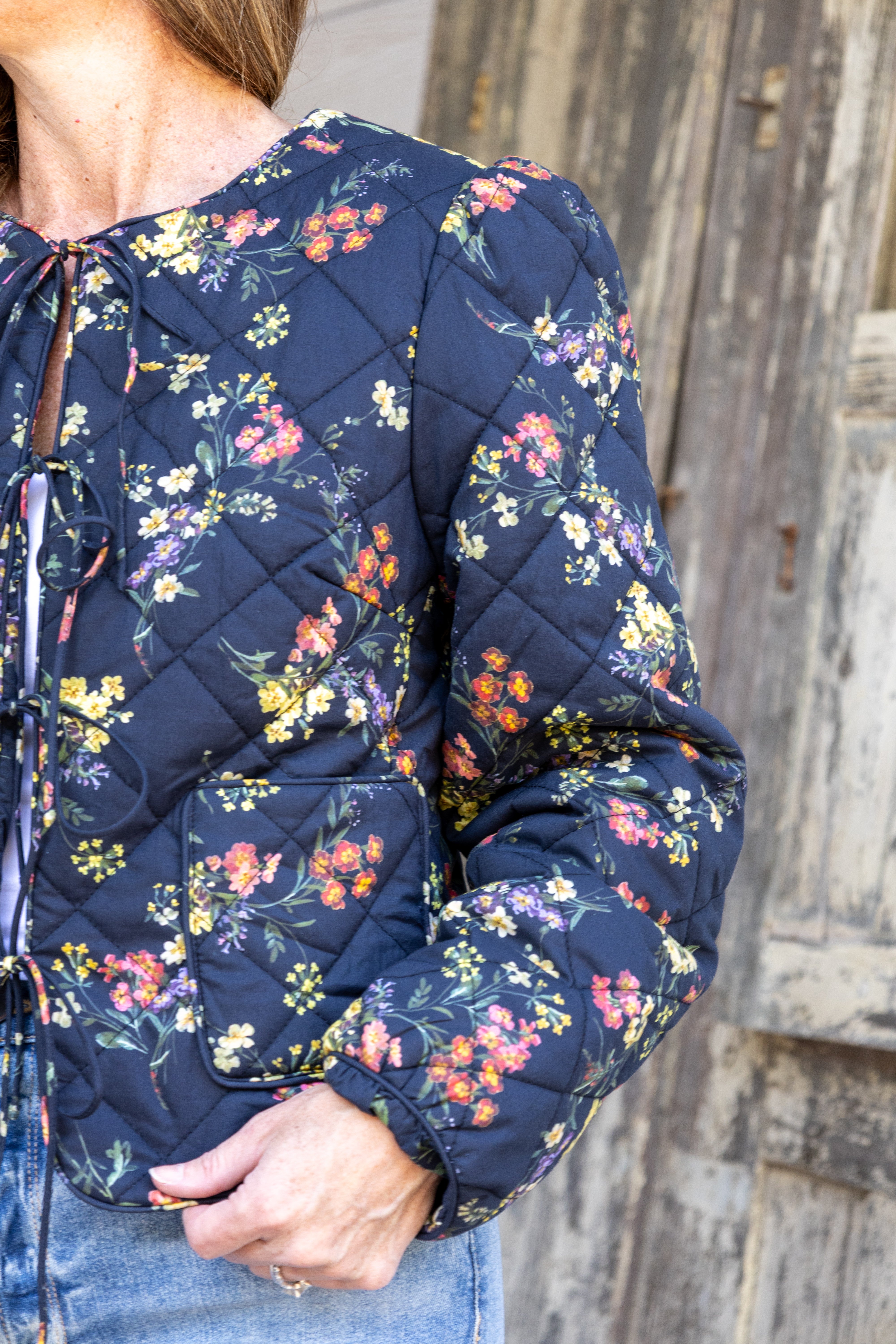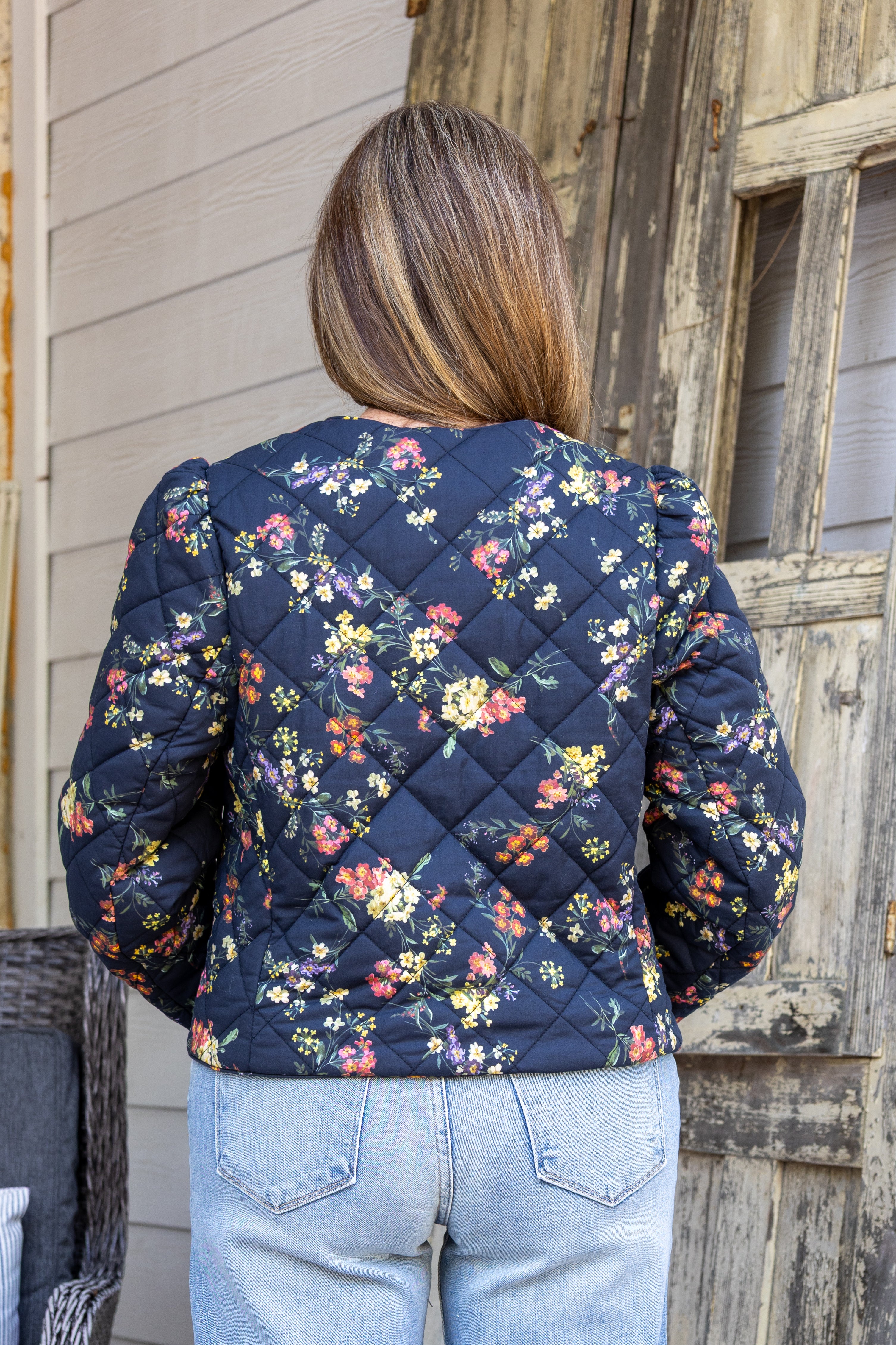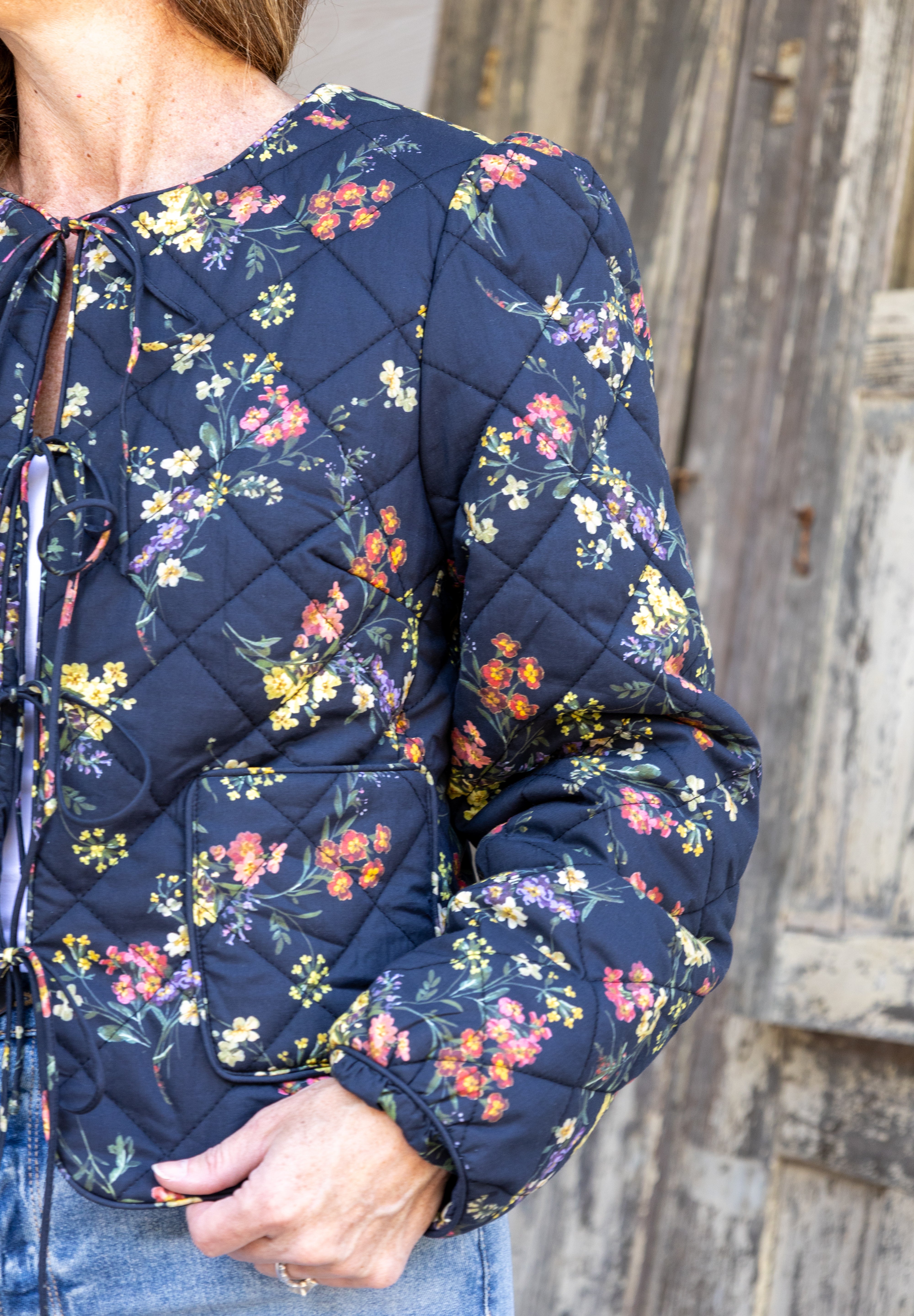 This black quilted jacket adds a fun twist to cozy style with its charming floral design. Featuring long sleeves and a playful ties down the front, it’s perfect for layering on cooler days while keeping your look fresh and flirty. Wrap up in warmth and whimsy wherever you go!