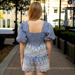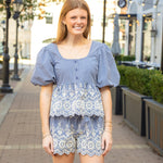 Adorable two-piece set featuring a navy and white gingham peplum top with charming floral embroidery and bubble sleeves that add a fun, feminine touch. Pair it with the matching elastic-waist shorts for an effortless, put-together look.