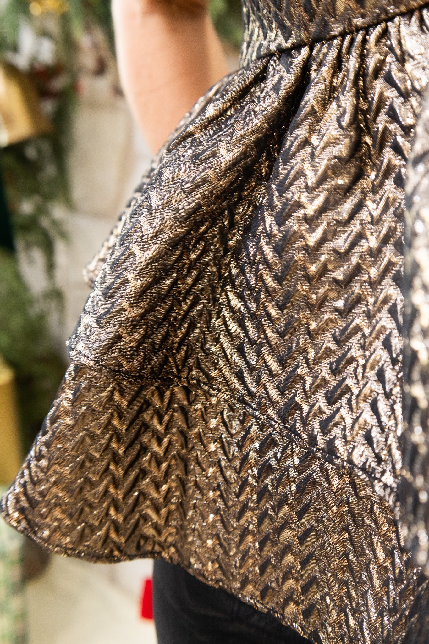 Elevate your event wardrobe with this stunning gold jacquard top. Featuring layered ruffles that add movement and dimension, this piece strikes the perfect balance between elegant and fun. The rich jacquard texture catches the light beautifully, making it ideal for nights out, celebrations, or any occasion that calls for a touch of glamour.