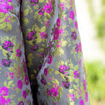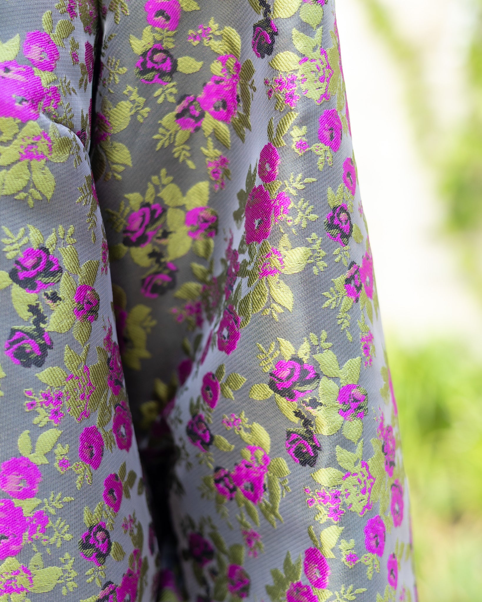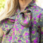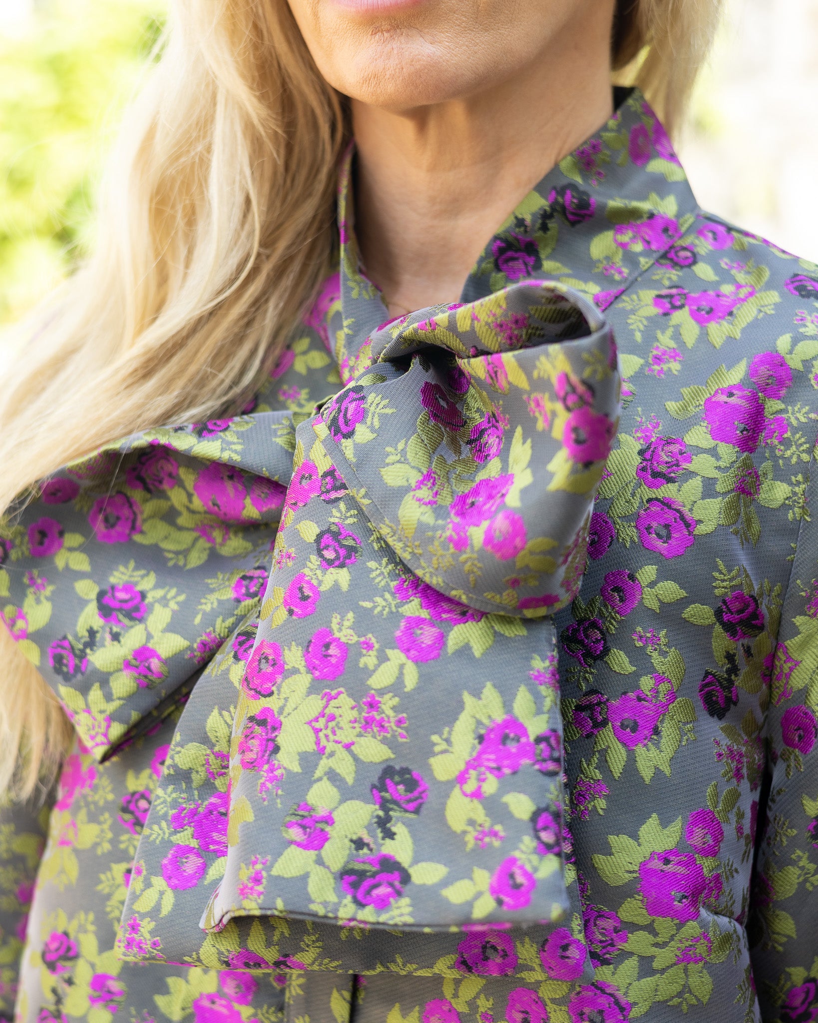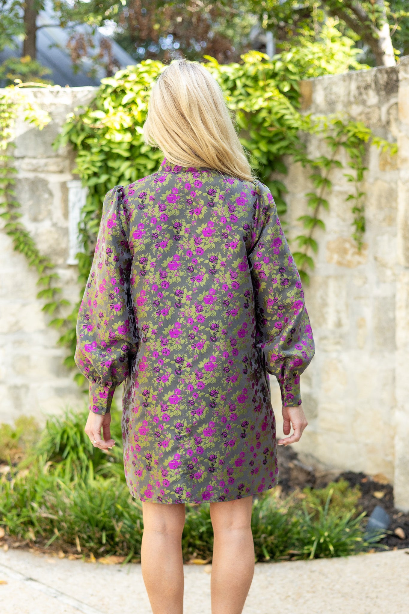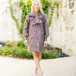 This moss green mini dress features a charming floral jacquard pattern and a flirty A-line silhouette. Long sleeves and an oversized bow tie add playful elegance, making it perfect for twirling into any occasion with a touch of fun and flair.