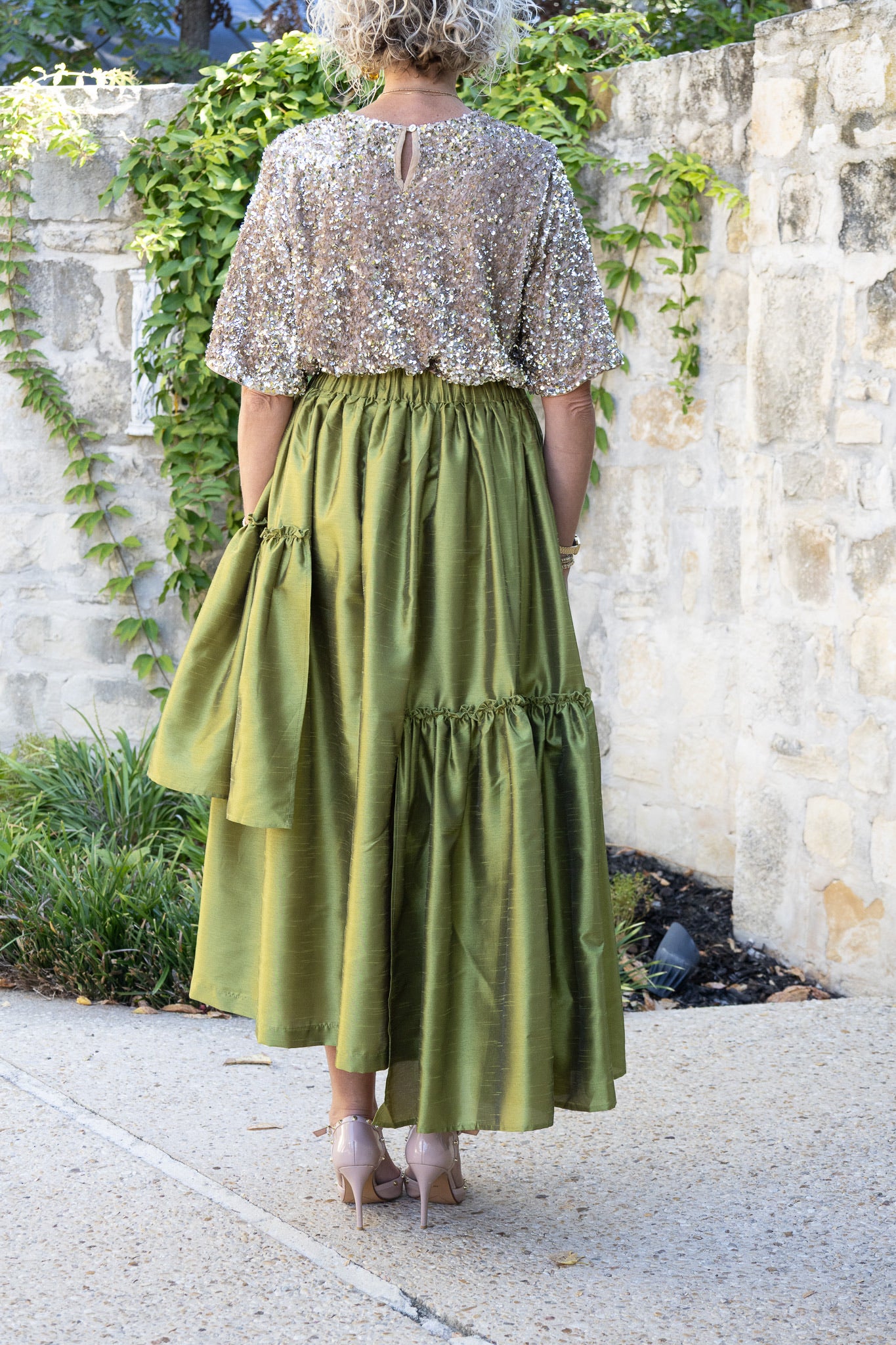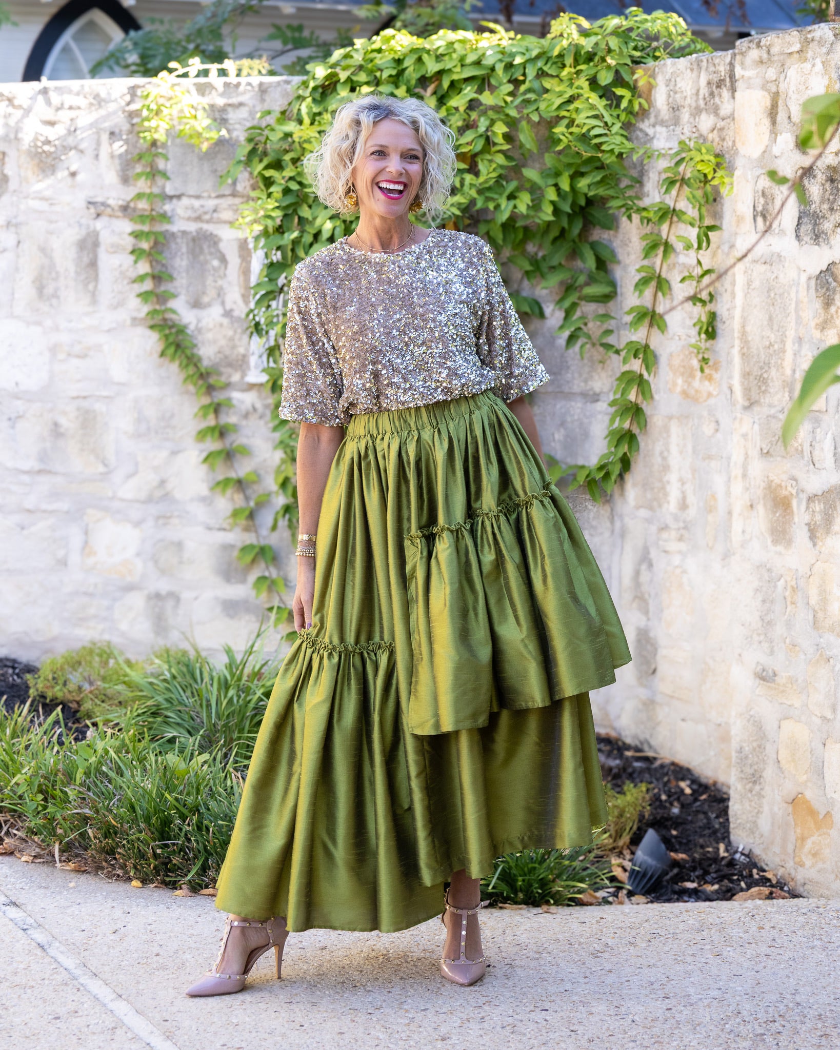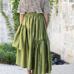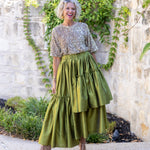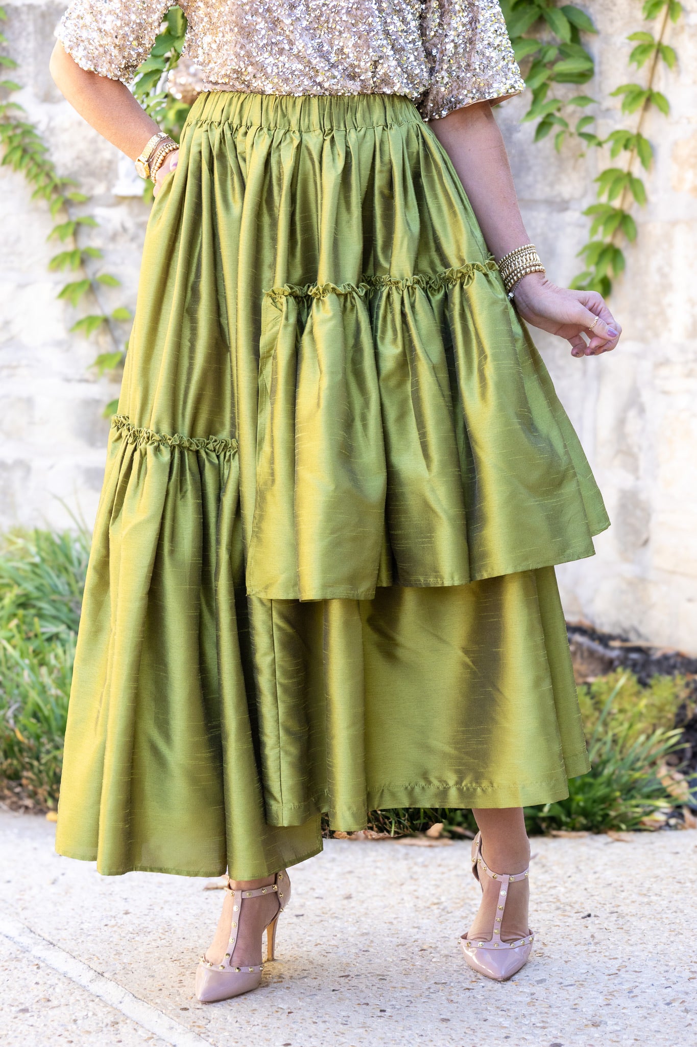 Look radiant in this playful green maxi skirt, crafted from a soft cotton-polyester blend that keeps you comfy and carefree. Its tiered design adds fun volume and movement, making every step feel like a dance. Perfect for holiday functions or a night out.