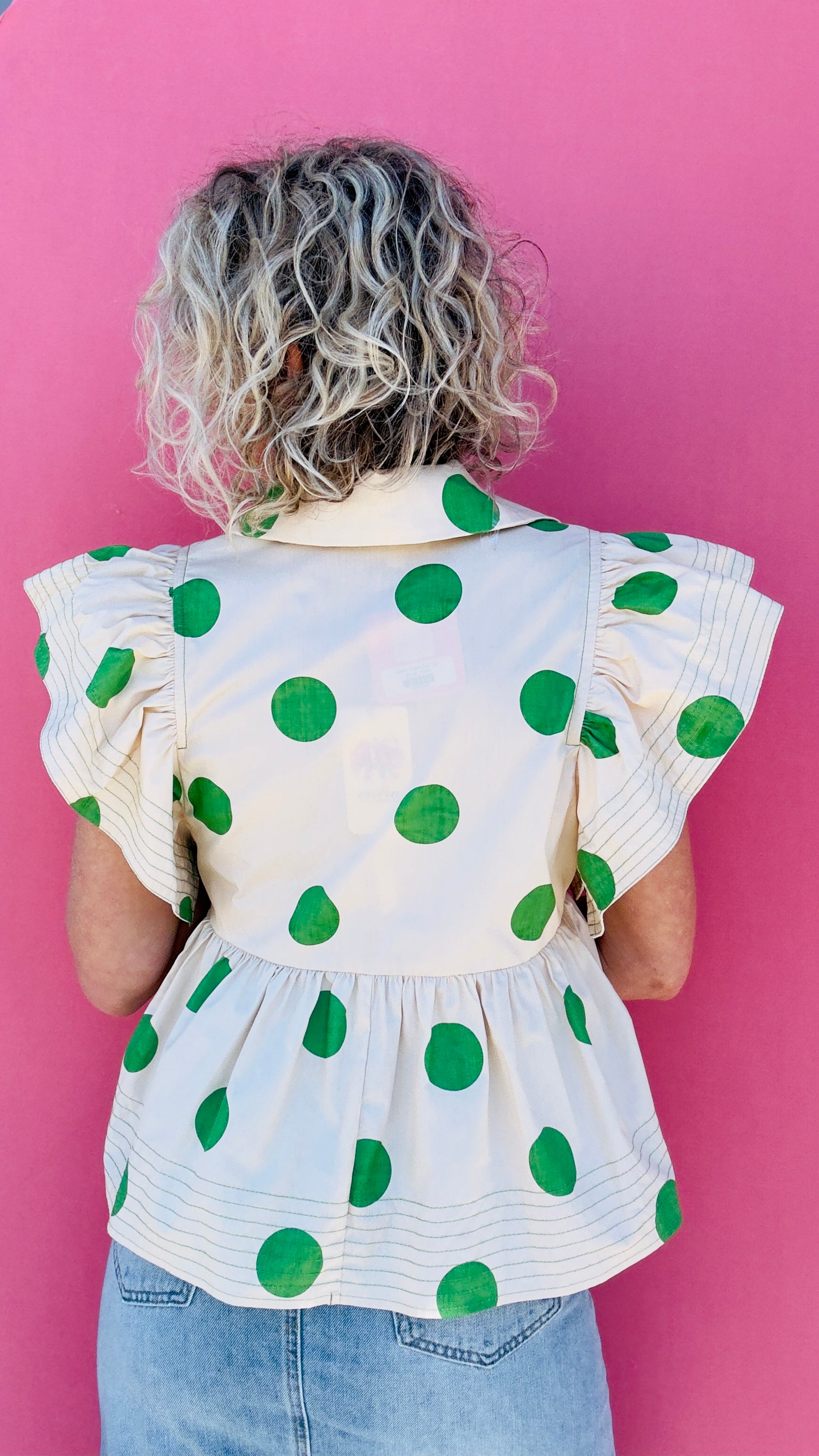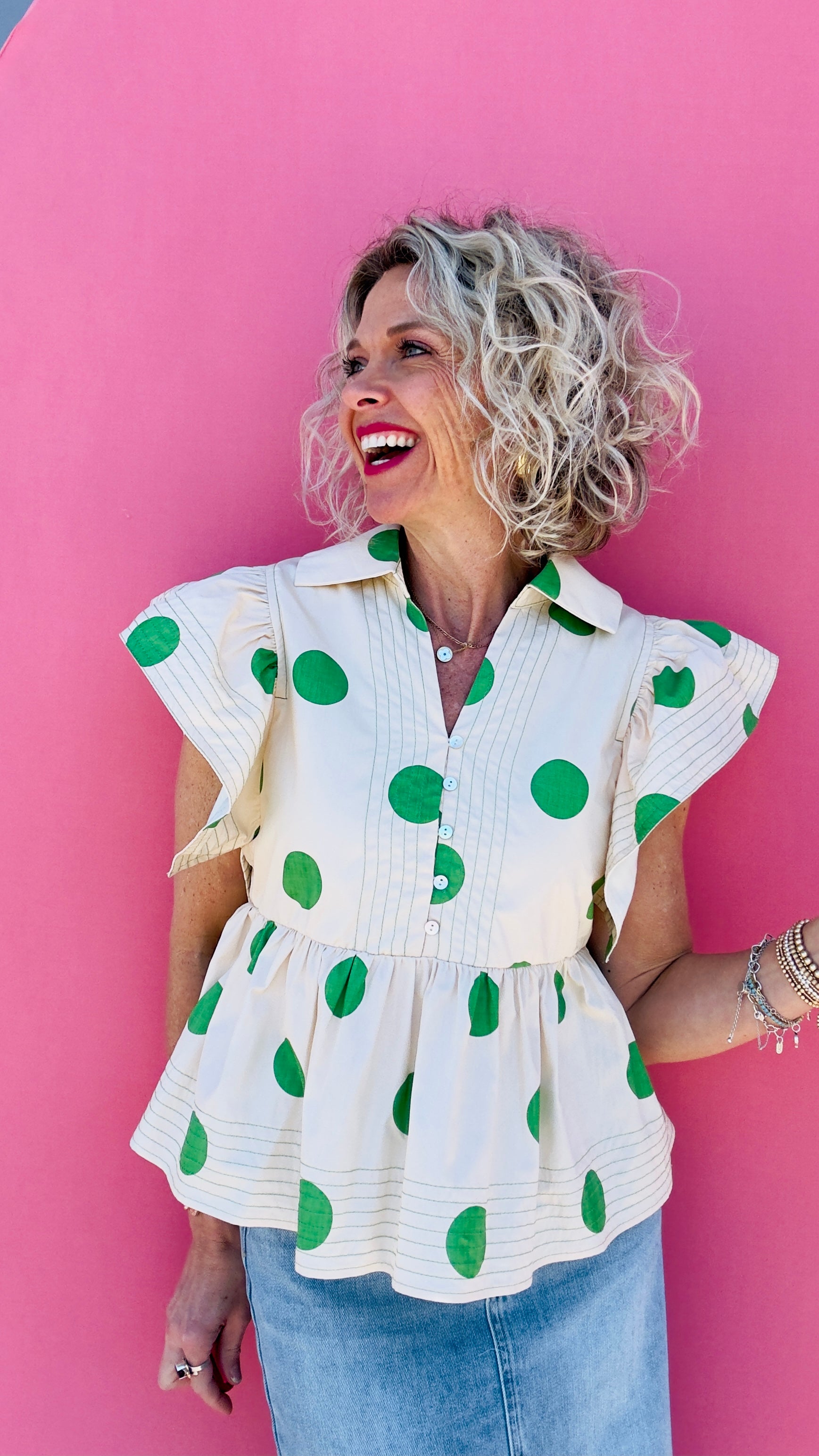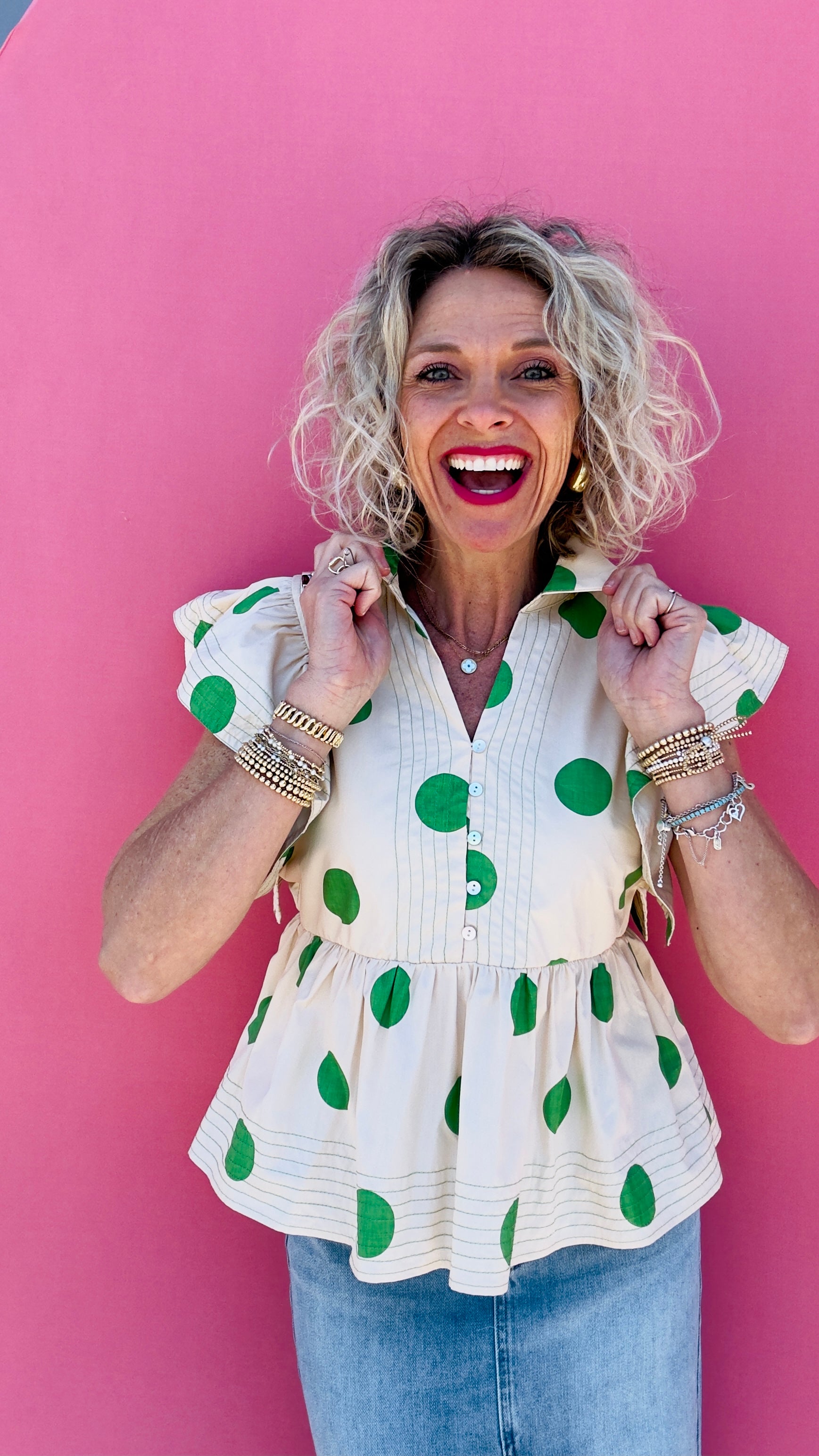 Brighten up your wardrobe with this playful Green Pok-A-Dot Top! Featuring a charming combination of green and ivory large polka dots, this top will add a pop of fun to any outfit. So go ahead and dot your way to style!