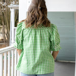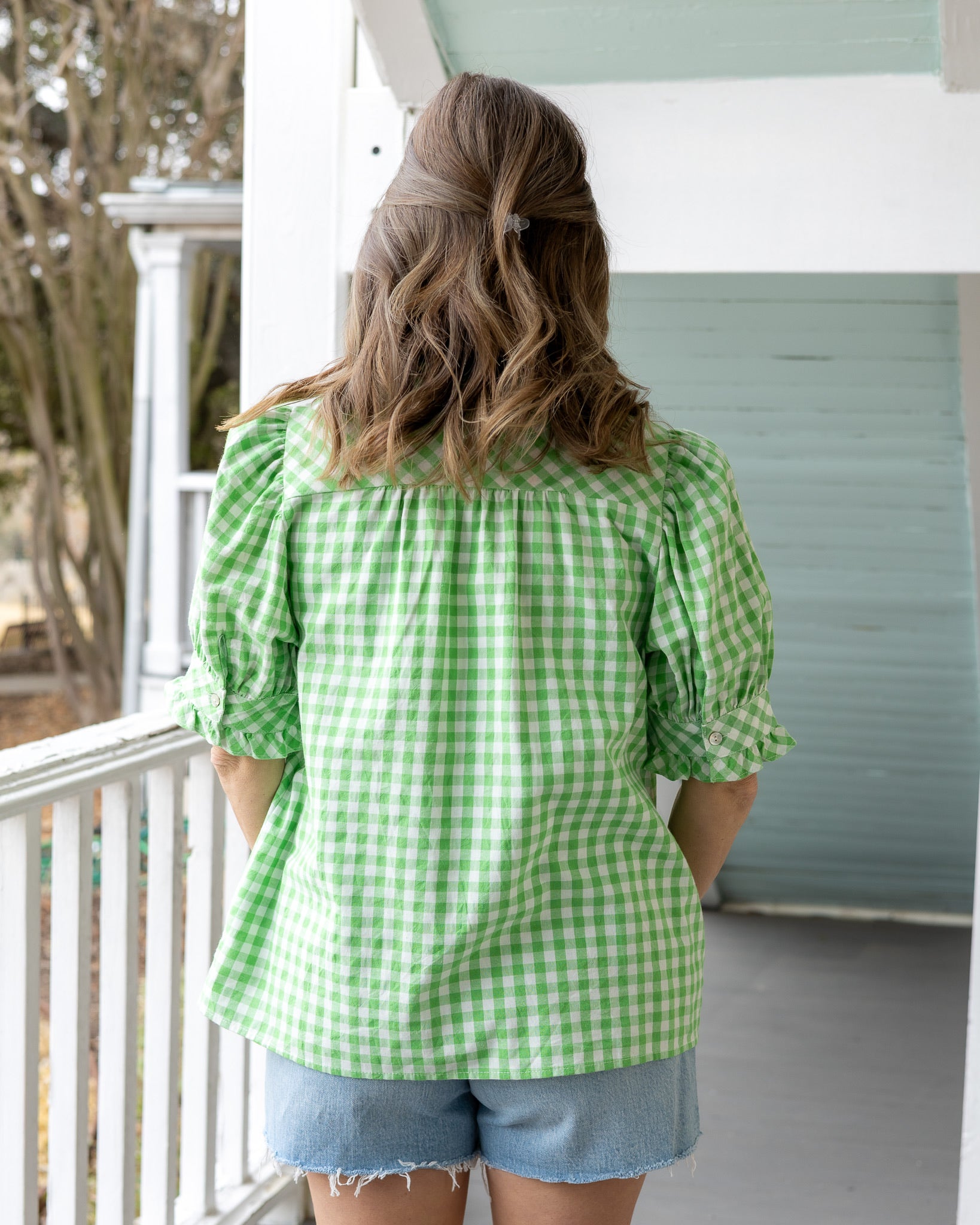 Adorable green gingham cotton top featuring puffed short sleeves and a charming ruffle collar that frames your face beautifully. Functional buttons at the neckline add a sweet, vintage-inspired touch while keeping things practical.