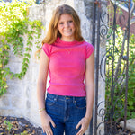 Your new favorite tee. Soft, ribbed knit and slim-fitting silhouette with raised seam detailing and cap-inspired sleeves.