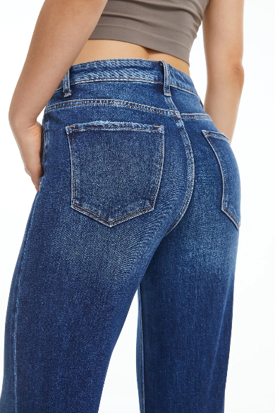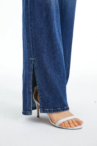 Crafted from stretch denim fabric in deep blue, our high-waisted wide-leg jeans are designed with side slits and a clean hem, featuring whiskering and fading effects to create a classic denim look.