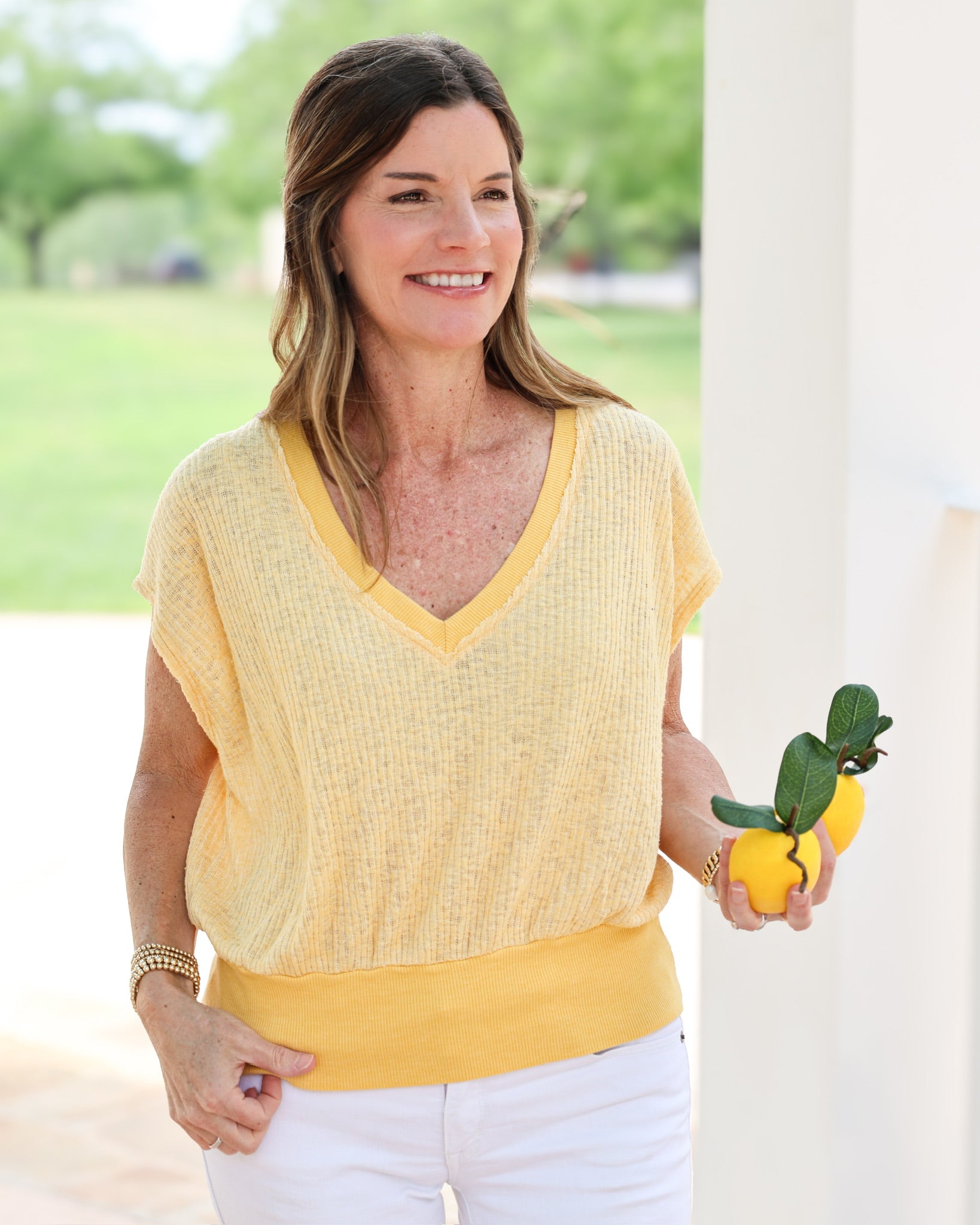 Get ready to butter up your wardrobe with the Honecrisp Textured Top. This playful top features a v-neck and short sleeves, all in a delightful butter yellow hue. The textured fabric adds a touch of uniqueness to your look, making it the perfect addition to any outfit. It's time to add some fun and flavor to your style!