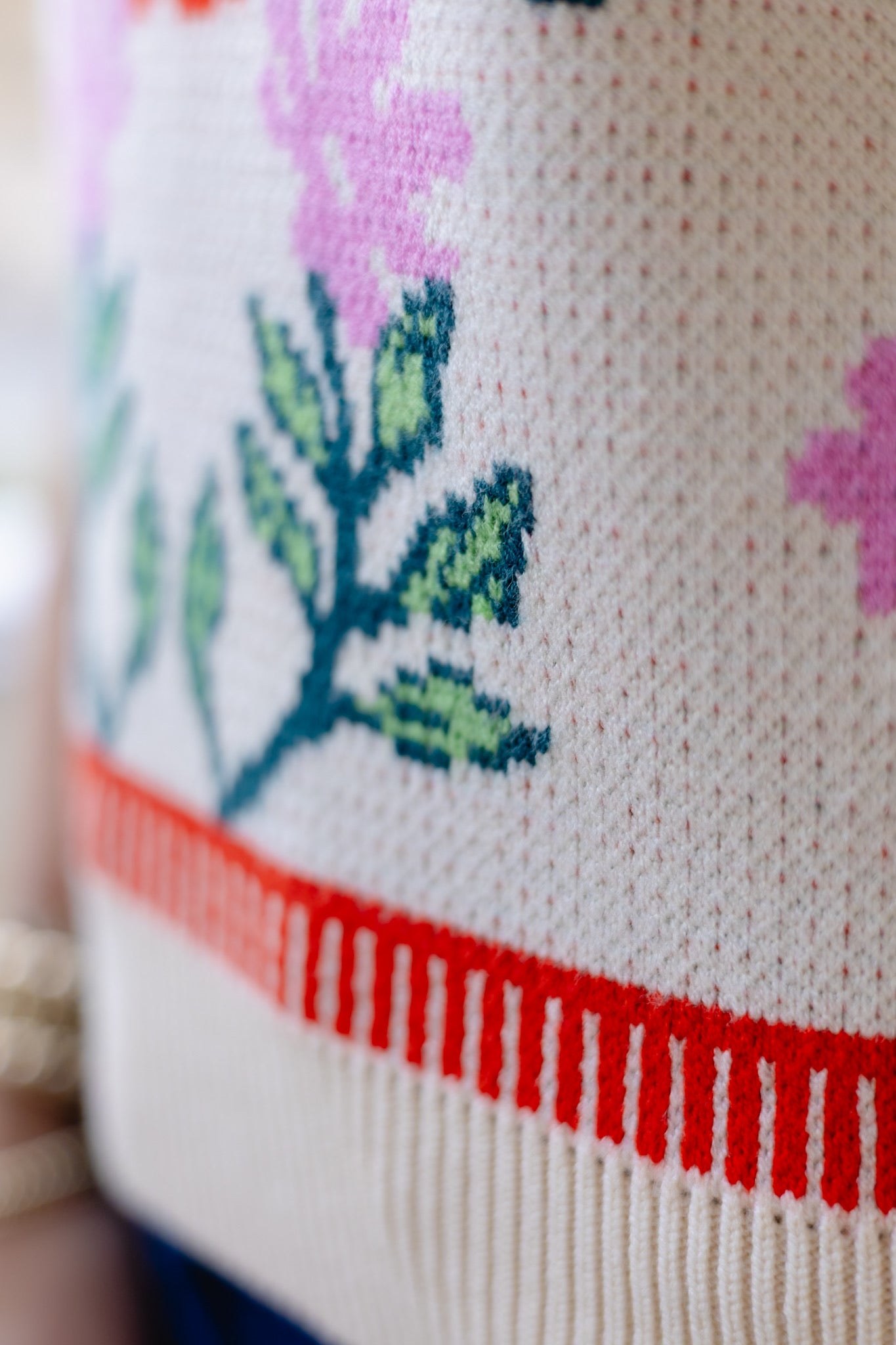 Effortlessly charming, this ivory knit top brings a touch of botanical beauty to your everyday rotation. Delicate floral details dance across soft, breathable knit fabric, while short sleeves keep things breezy and comfortable. Perfect for layering or wearing solo, it's the kind of piece that feels like a warm hug and looks absolutely lovely. Dress it up with tailored trousers or keep it casual with your favorite jeans—either way, you're winning.