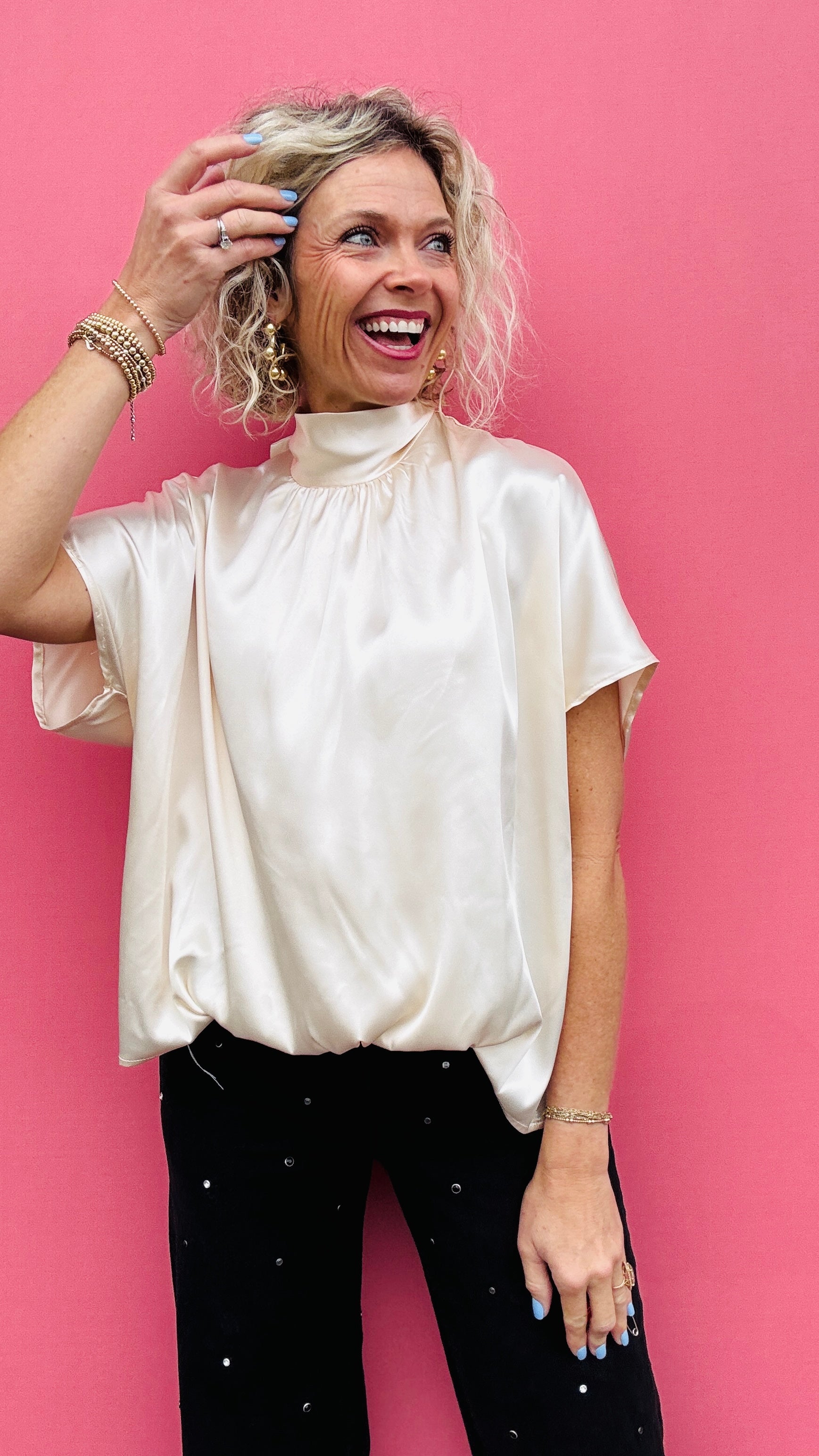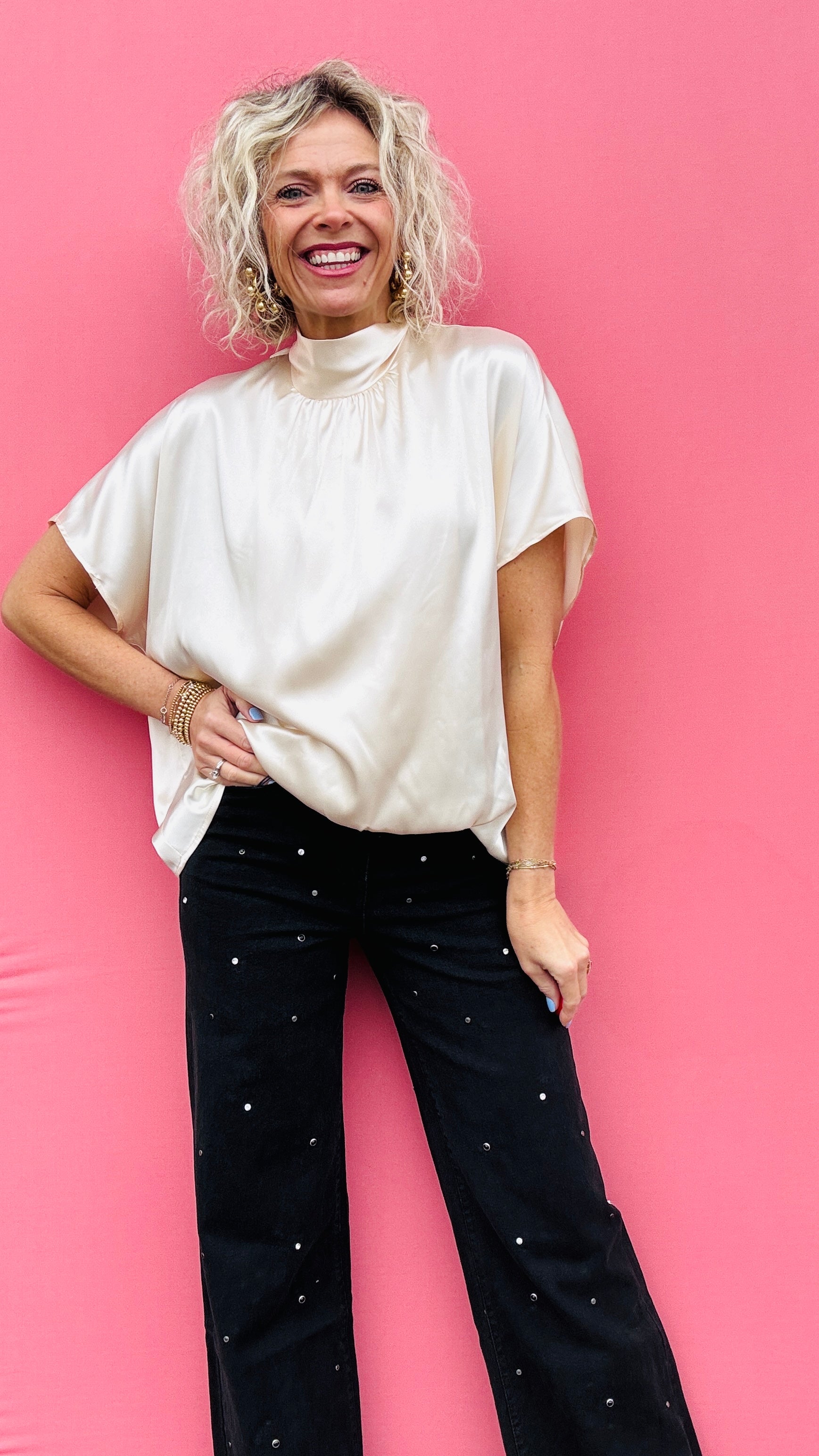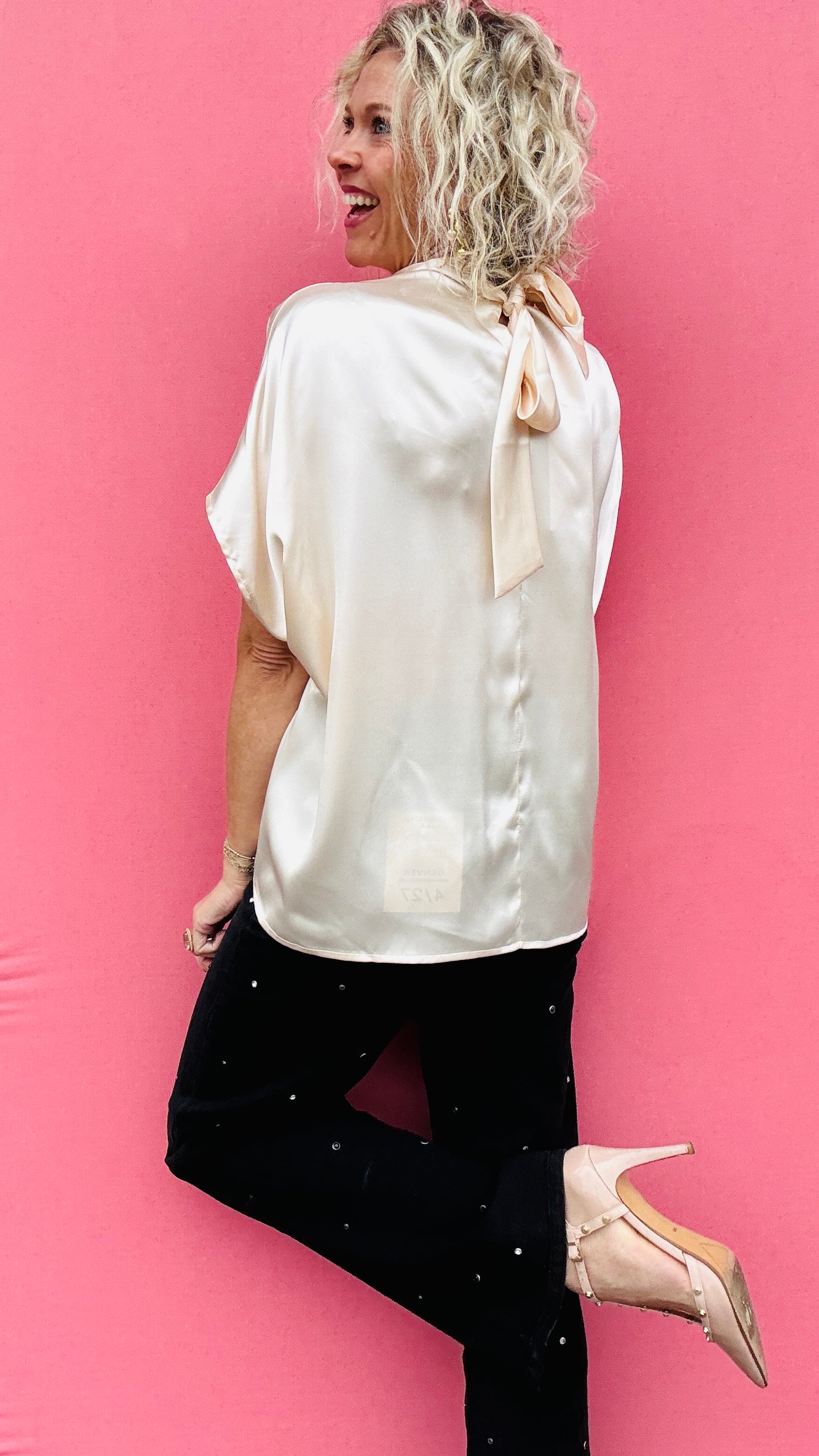 Simple yet elegant, our Ivory High Tie Neck top is the epitome of sophistication. Featuring a high neck and bubble hem, this luxurious top is perfect for any occasion. Its ivory color adds a touch of class, while the tie neck detail adds a touch of style. Elevate your wardrobe with this premium piece.