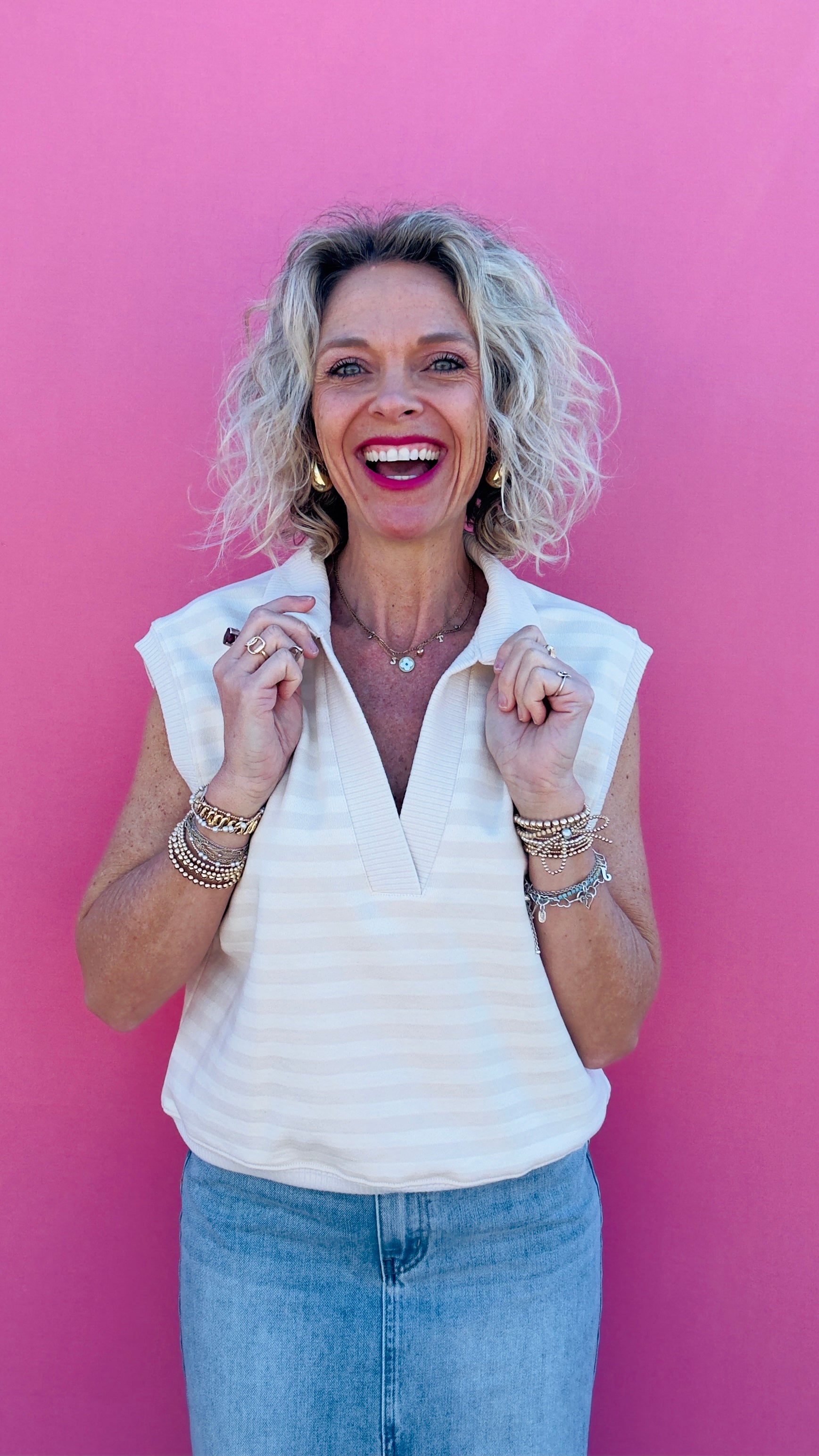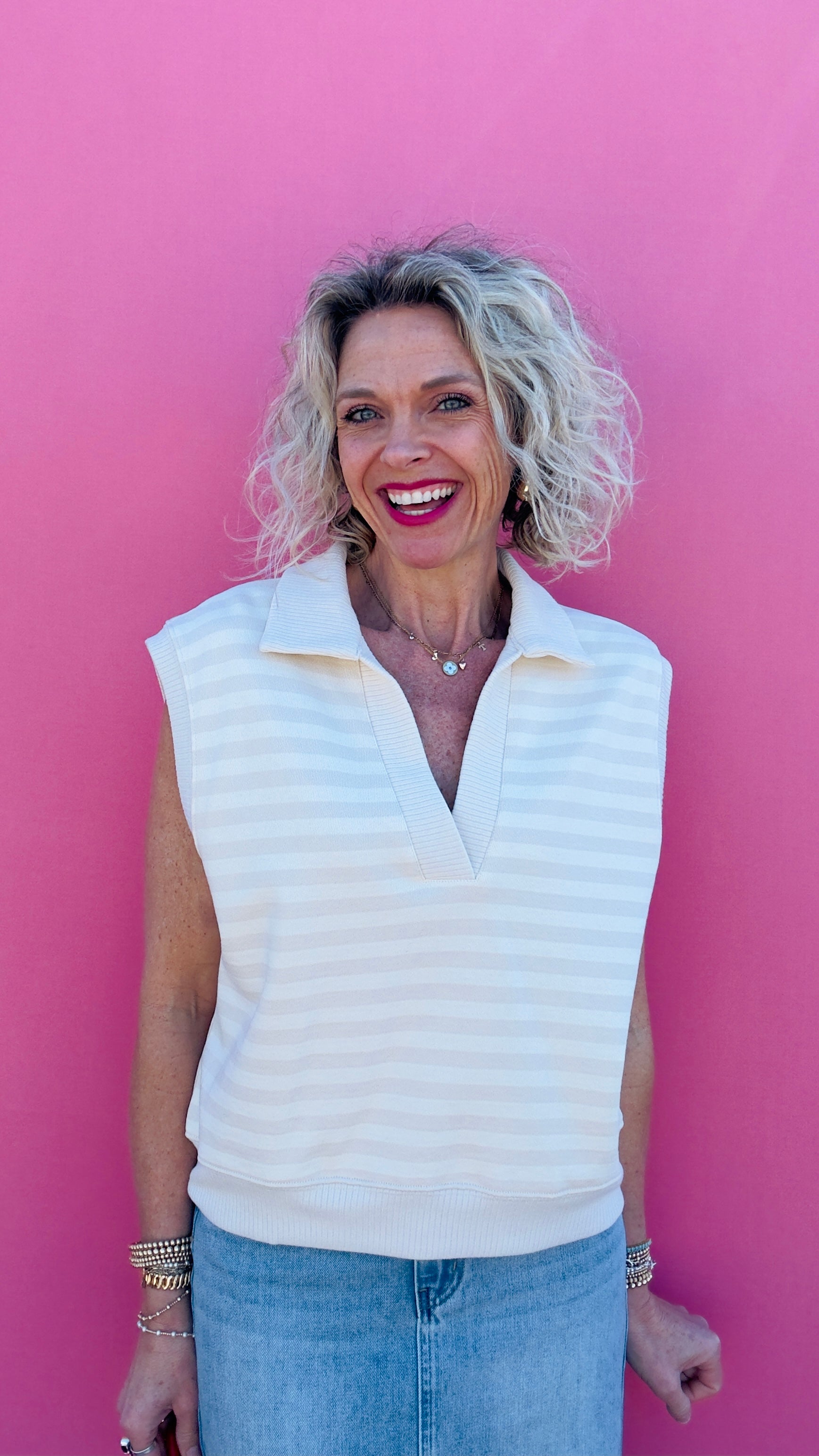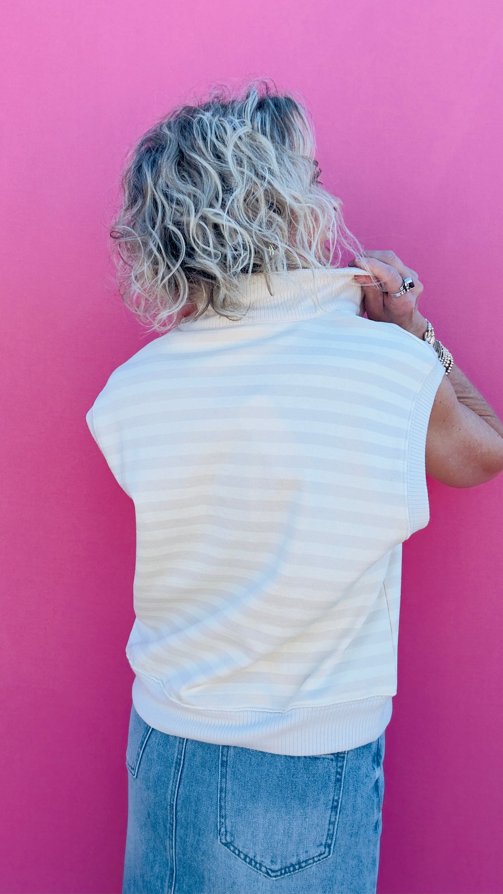 Introducing our Ivory Sweatshirt Tank! Perfect for those who don't take themselves too seriously. This tone on tone stripe tank is both quirky and stylish. Stay comfortable and trendy with this unique piece.