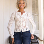 Add a dainty touch to your look with this sheer cotton-lace long sleeve, featured in a button-front style for a versatile piece that’s perfect for layering. Color is a white Sugar Swizzle