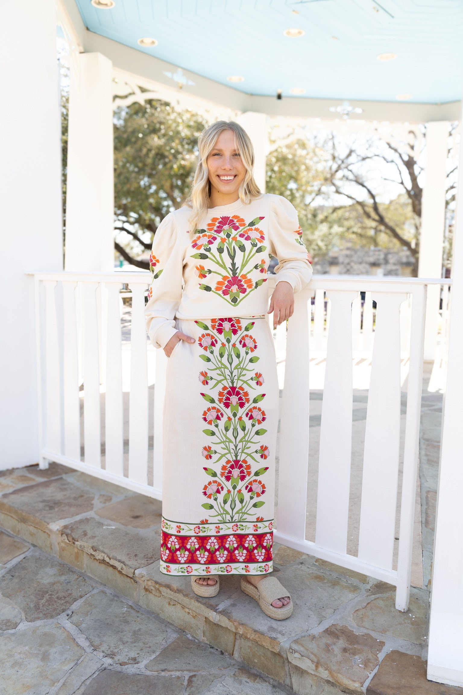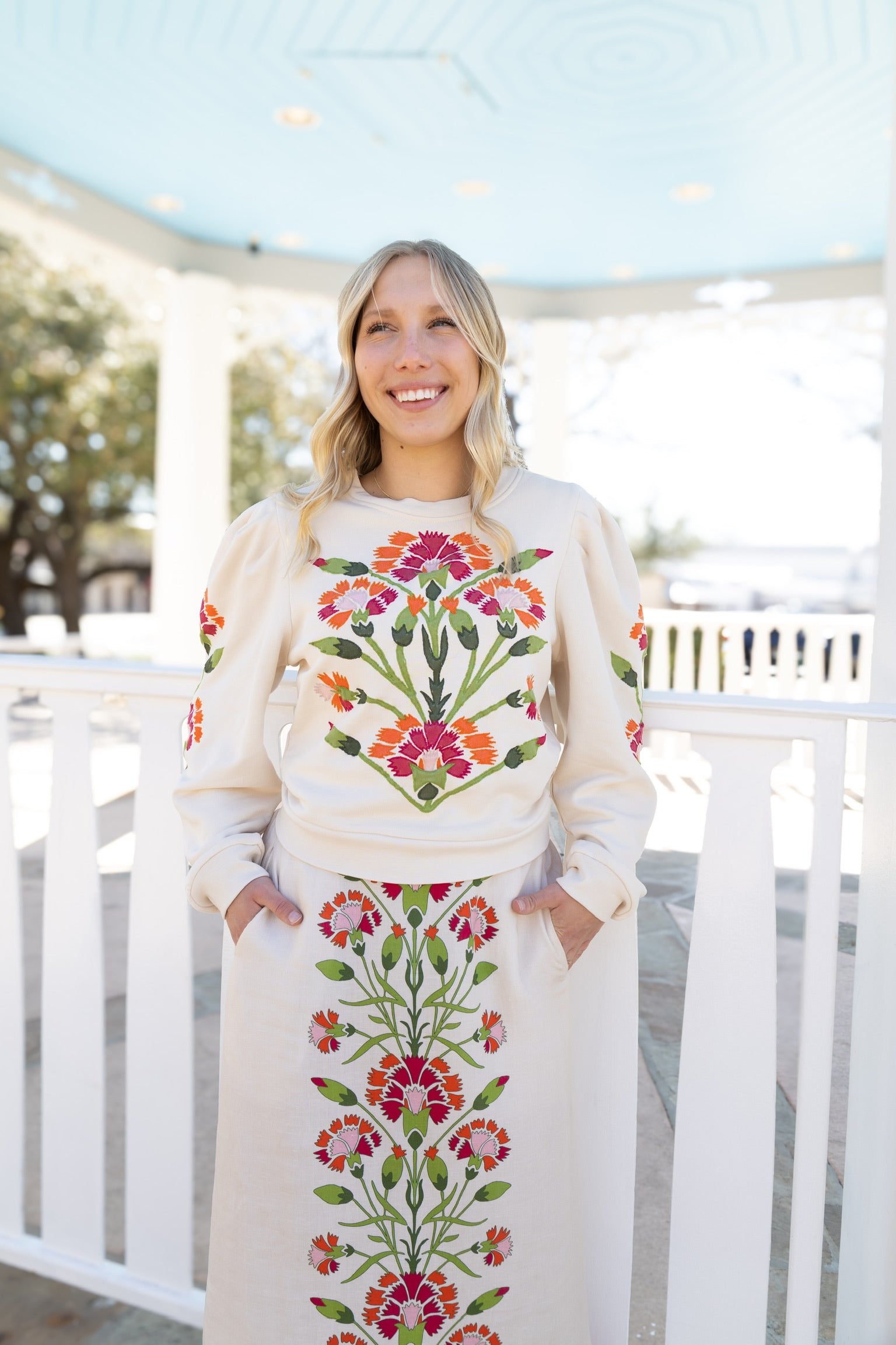 Add some Indian flair to your wardrobe with our ivory Jasmine Flower Top! Featuring a beautiful embroidered print and long sleeves, this sweatshirt is the perfect match for our Phoebe maxi. Spice up your style with this unique and playful top.