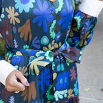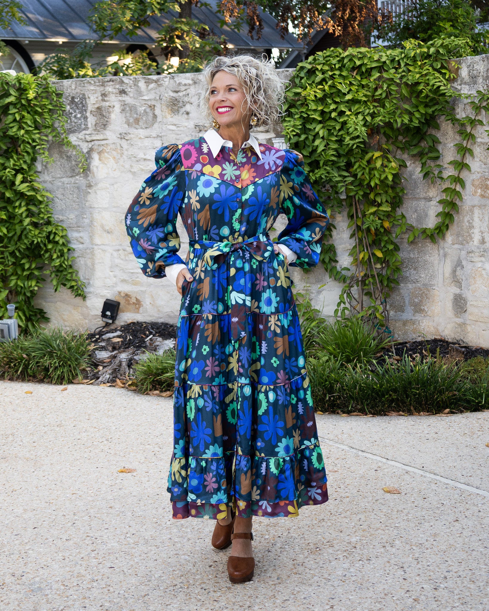 The Jublio Dress is a statement maxi dress with a tailored silhouette. Featuring a crisp white collar and cuffs that contrast against the bold multicolored floral print in blues, it blends elegance with playful vibrancy. The long sleeves and button-down design create a structured look, making it perfect for both polished daywear and chic evening occasions.