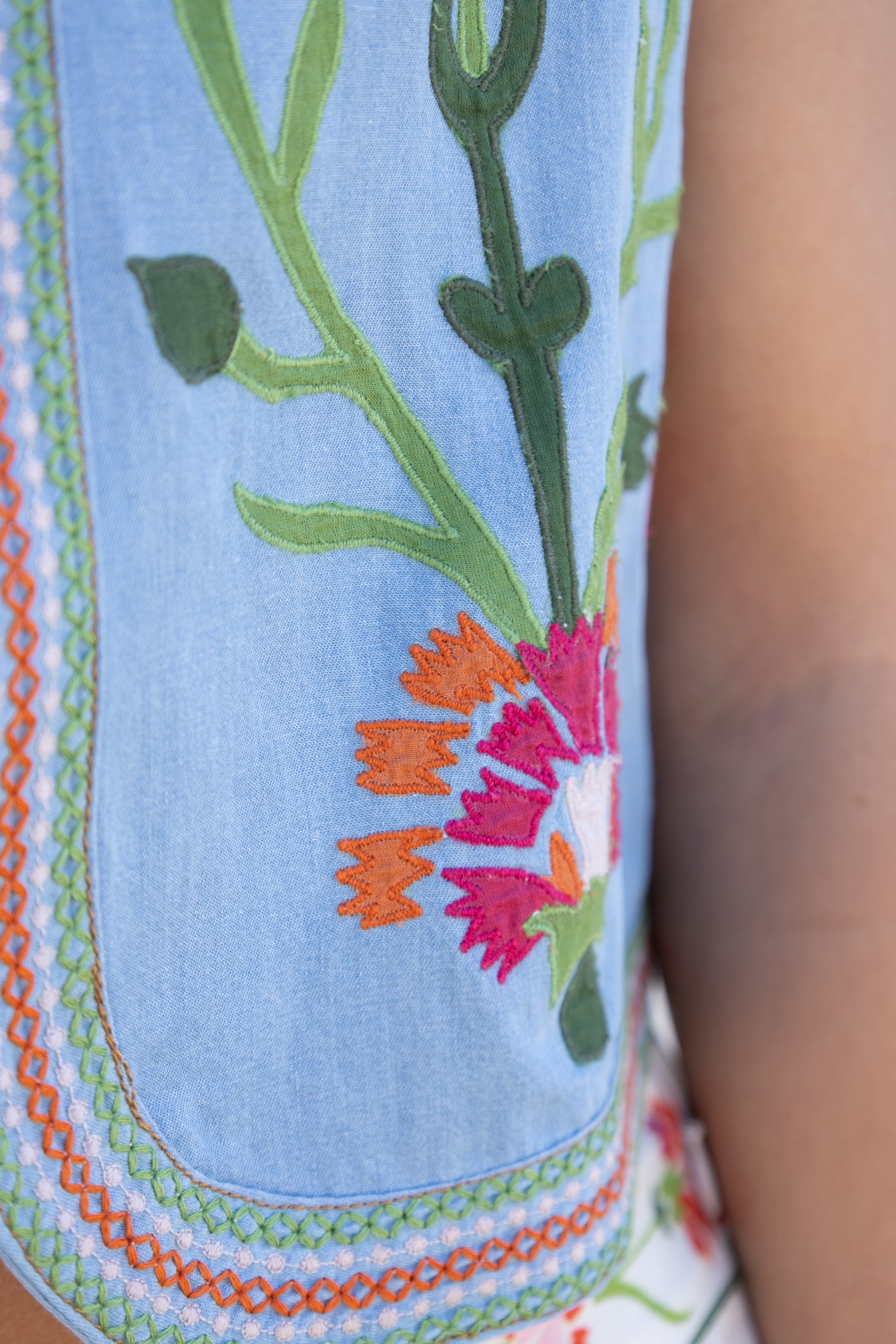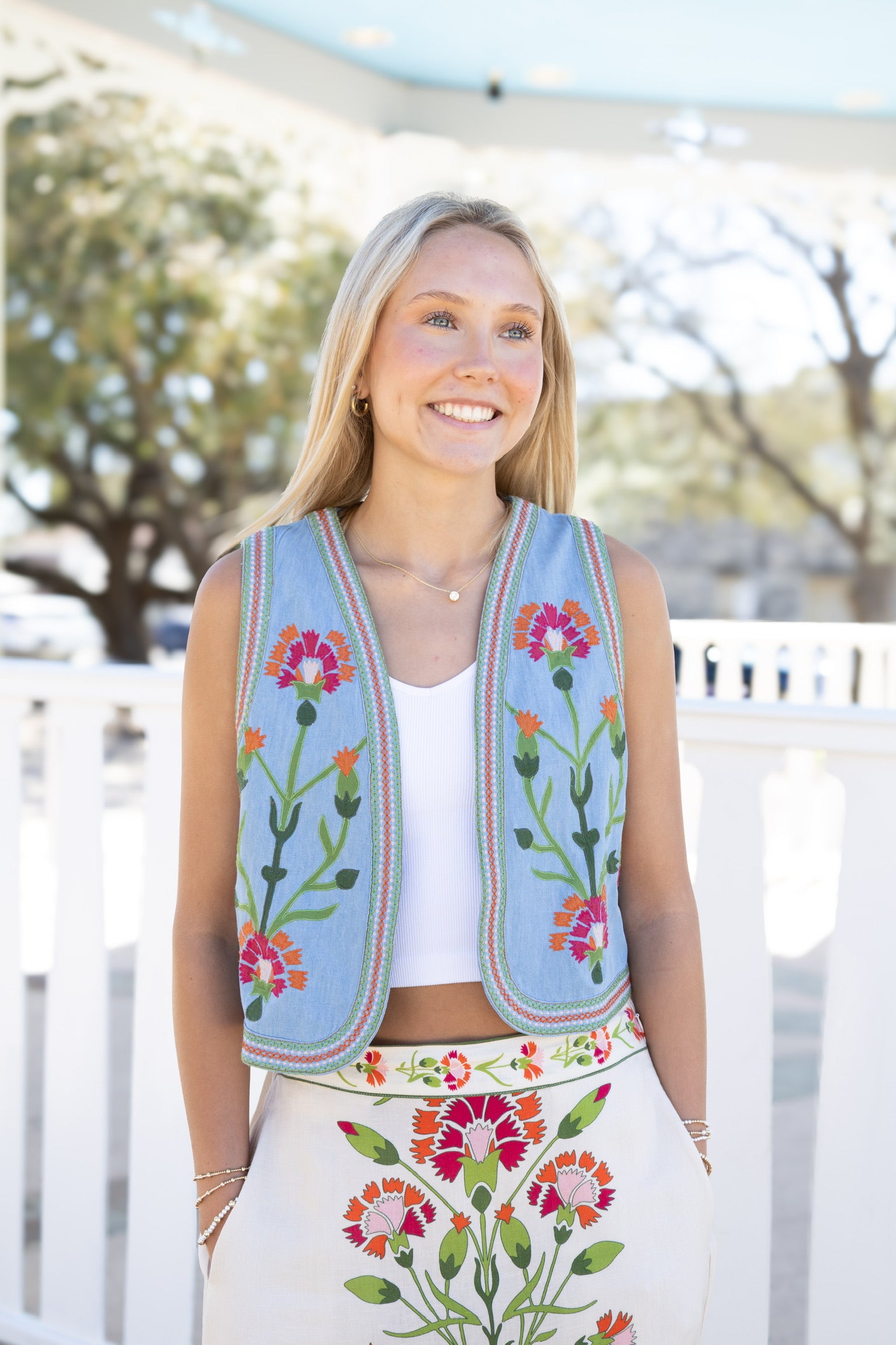 Get ready to turn heads with the Kit Chambray Vest! This playful and quirky vest features a unique indian flower pattern, adding a touch of fun to your outfit. Designed to perfectly match the Phoebe maxi skirt, this vest is the perfect addition to your wardrobe.