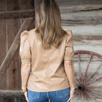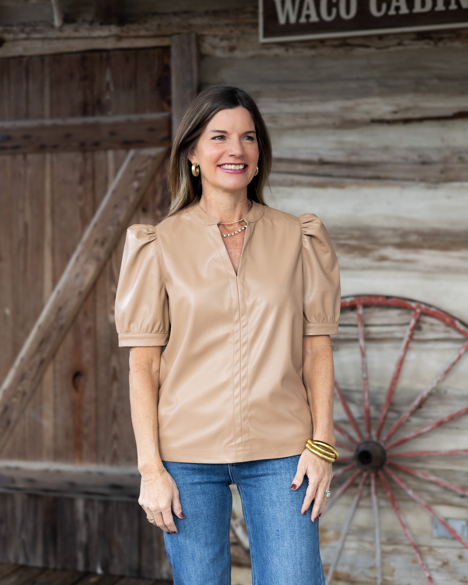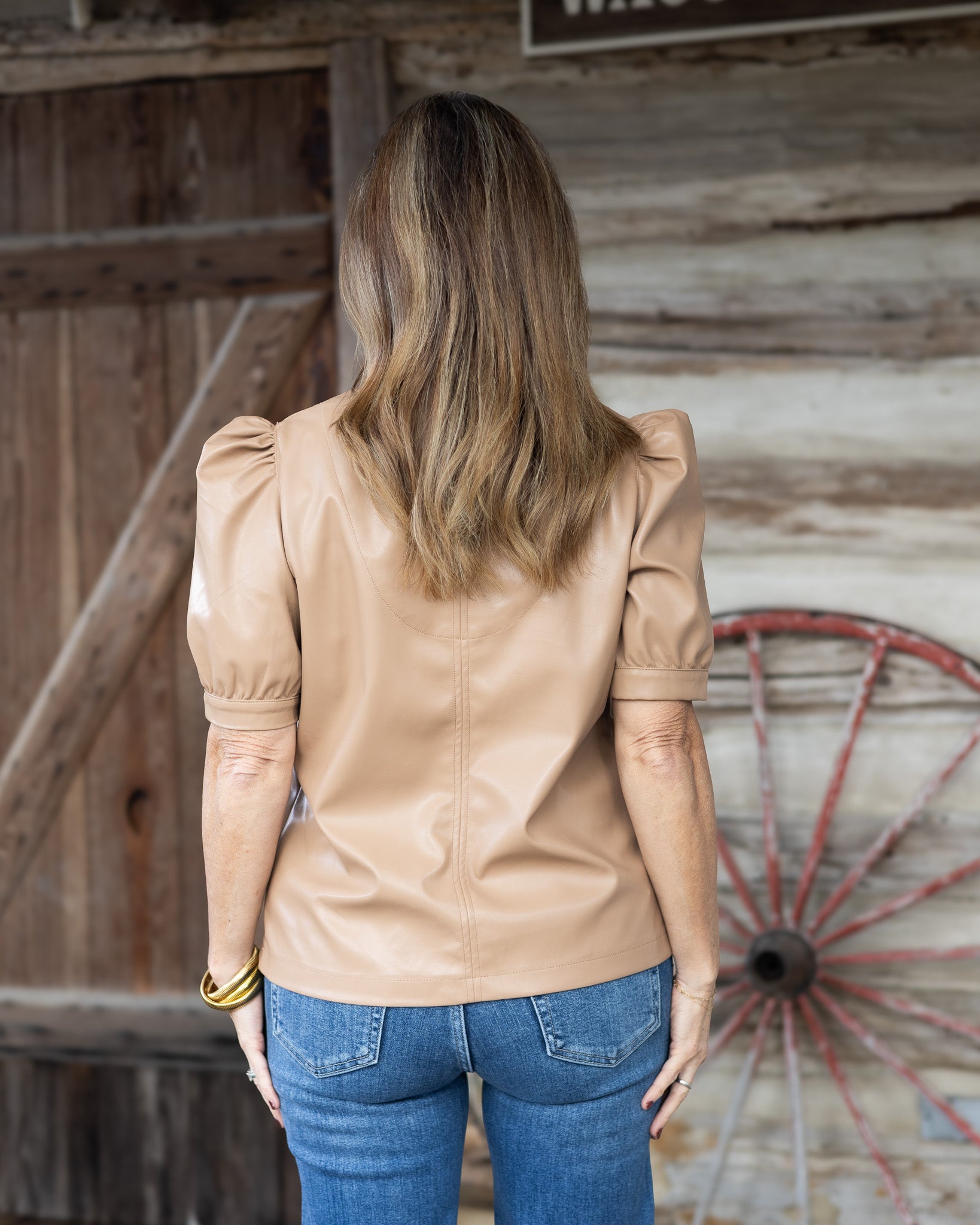 Elevate your look with the Latte Faux Leather Top, featuring a trendy split neck and playful short sleeves. This chic faux leather piece adds a touch of edge while keeping things fun and flirty.